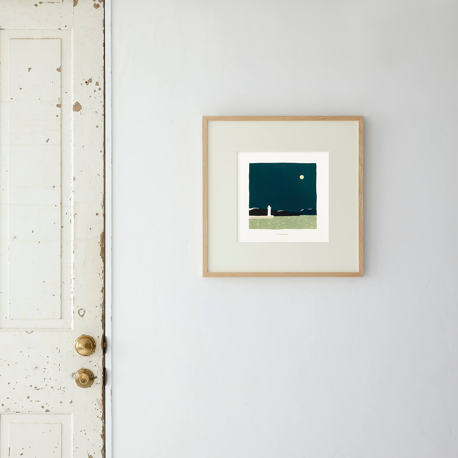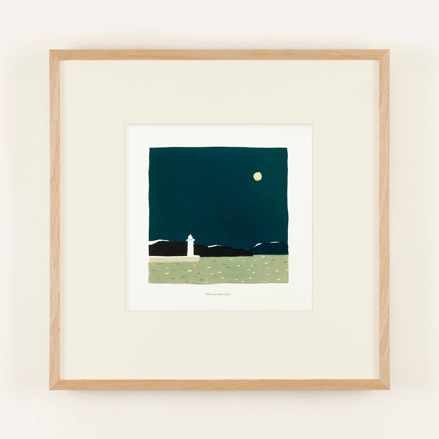 With a mountain range in the background, a lighthouse with its lights extinguished, a full moon shining brightly in the blue-green sky, and the moonlight rippling on the sea surface—everything is arranged in exquisite balance. Please enjoy it by overlaying it with the scenery in your own heart. This is an original work by Nanako Okawa.
