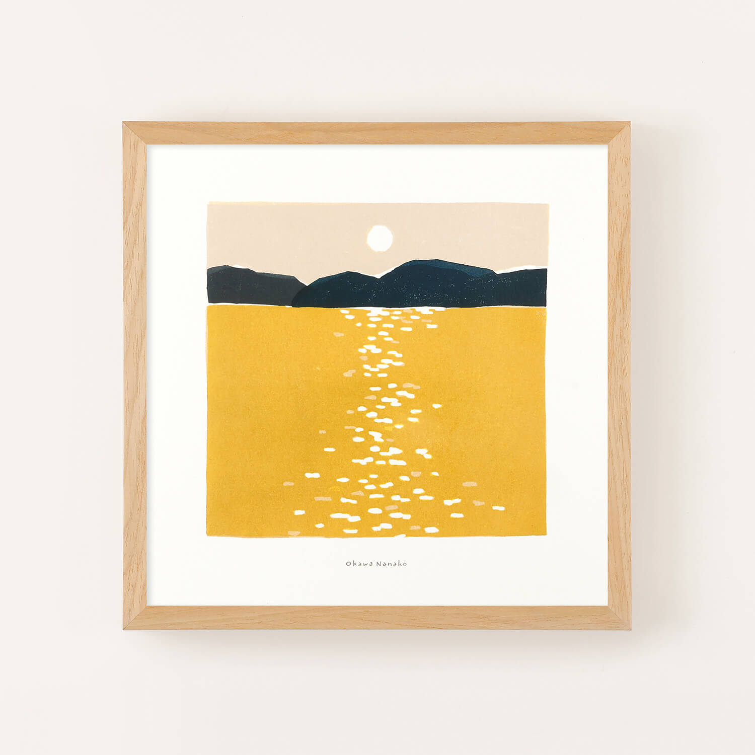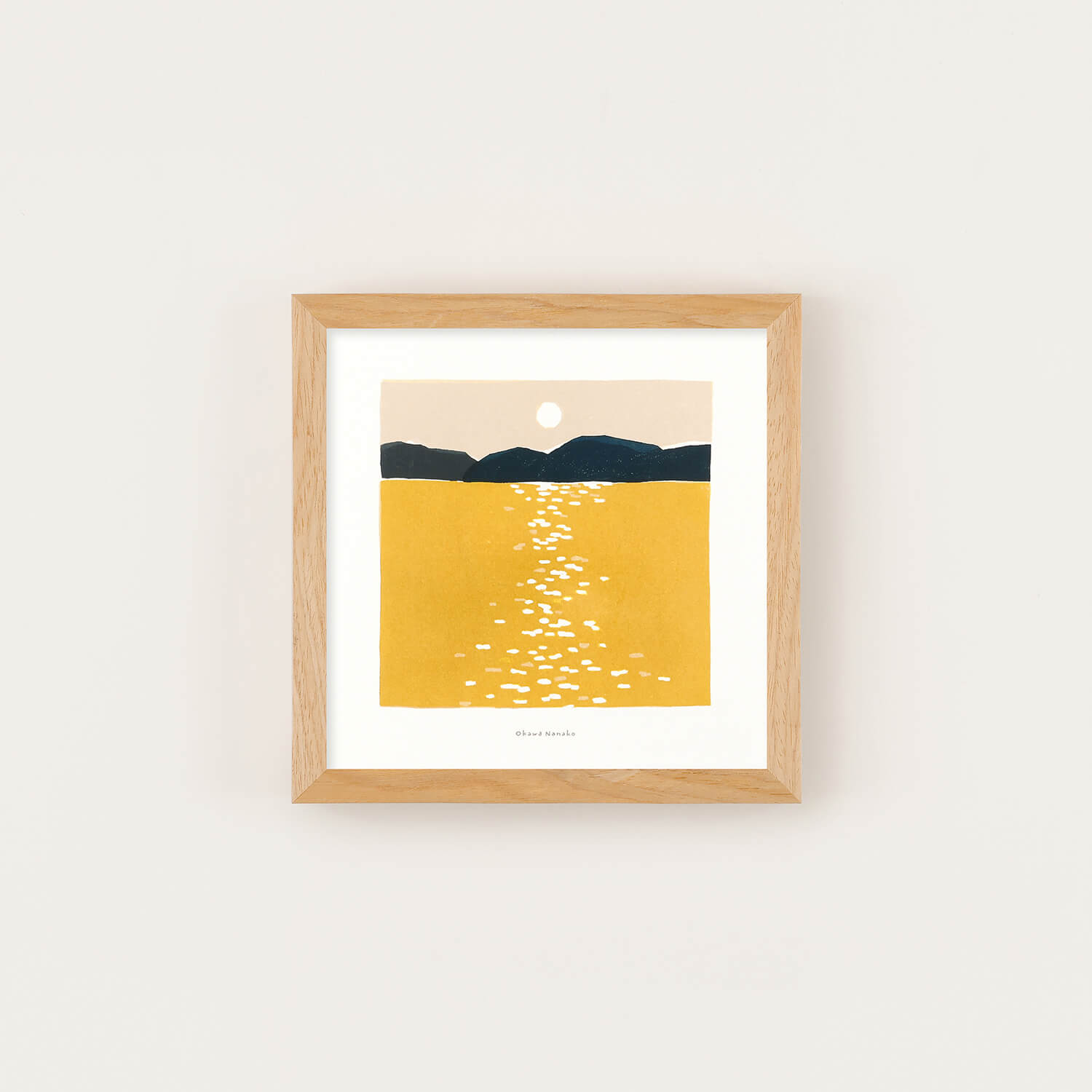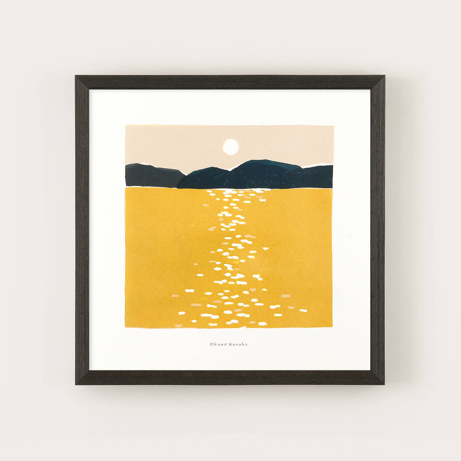 This is an original artwork by Nanako Okawa, depicting the morning sea dyed golden by the reflection of the sunrise. The sunlight (sunroad) illuminating the sea is both divine and gentle, enveloping the viewer. Please enjoy it by superimposing it with the scenery in your heart.