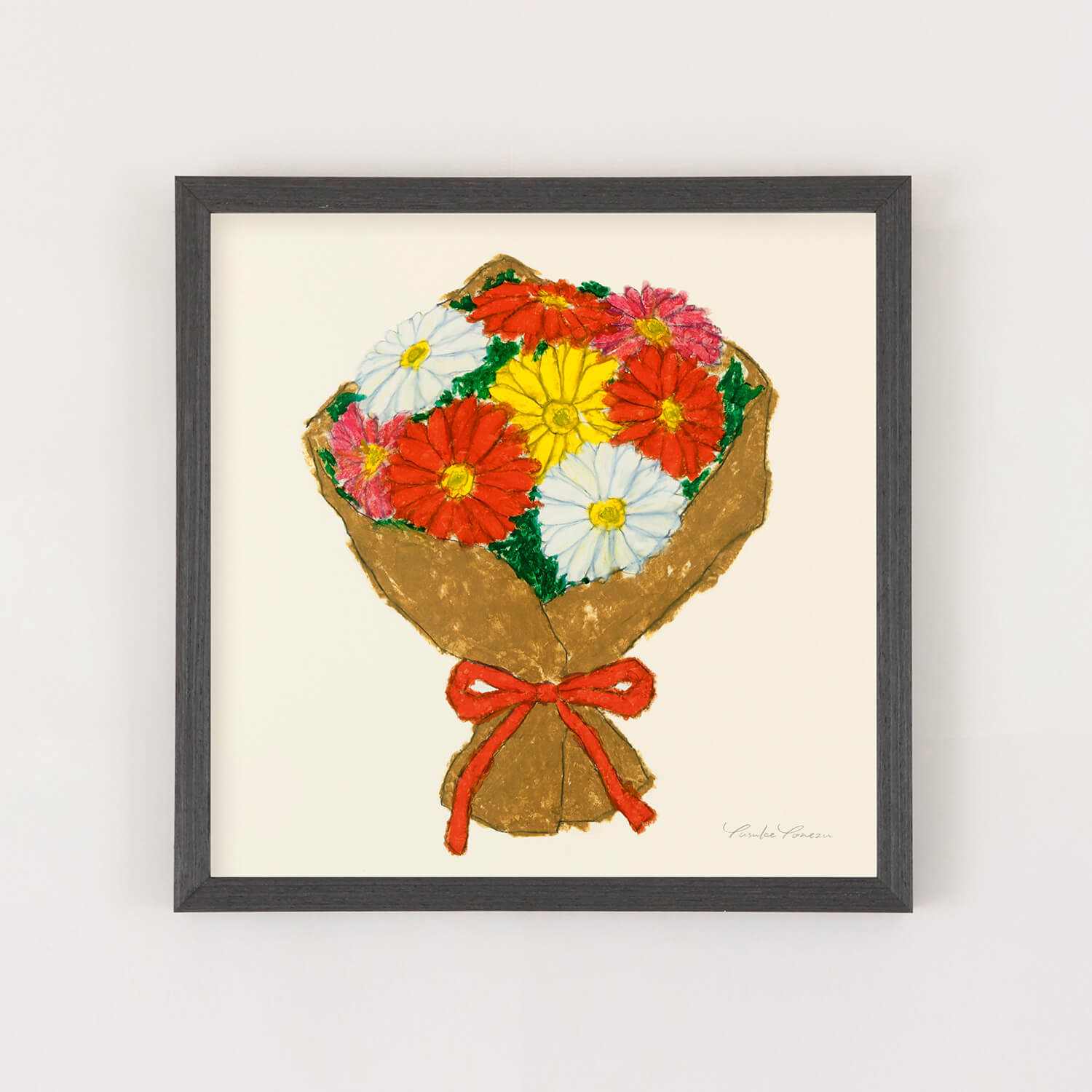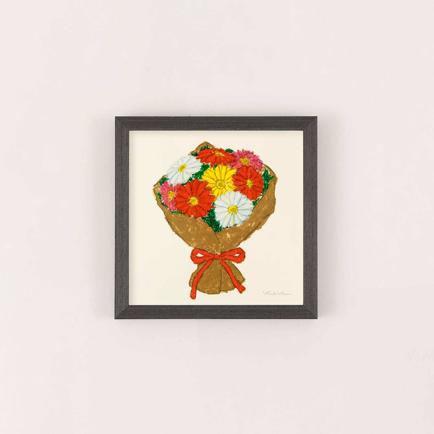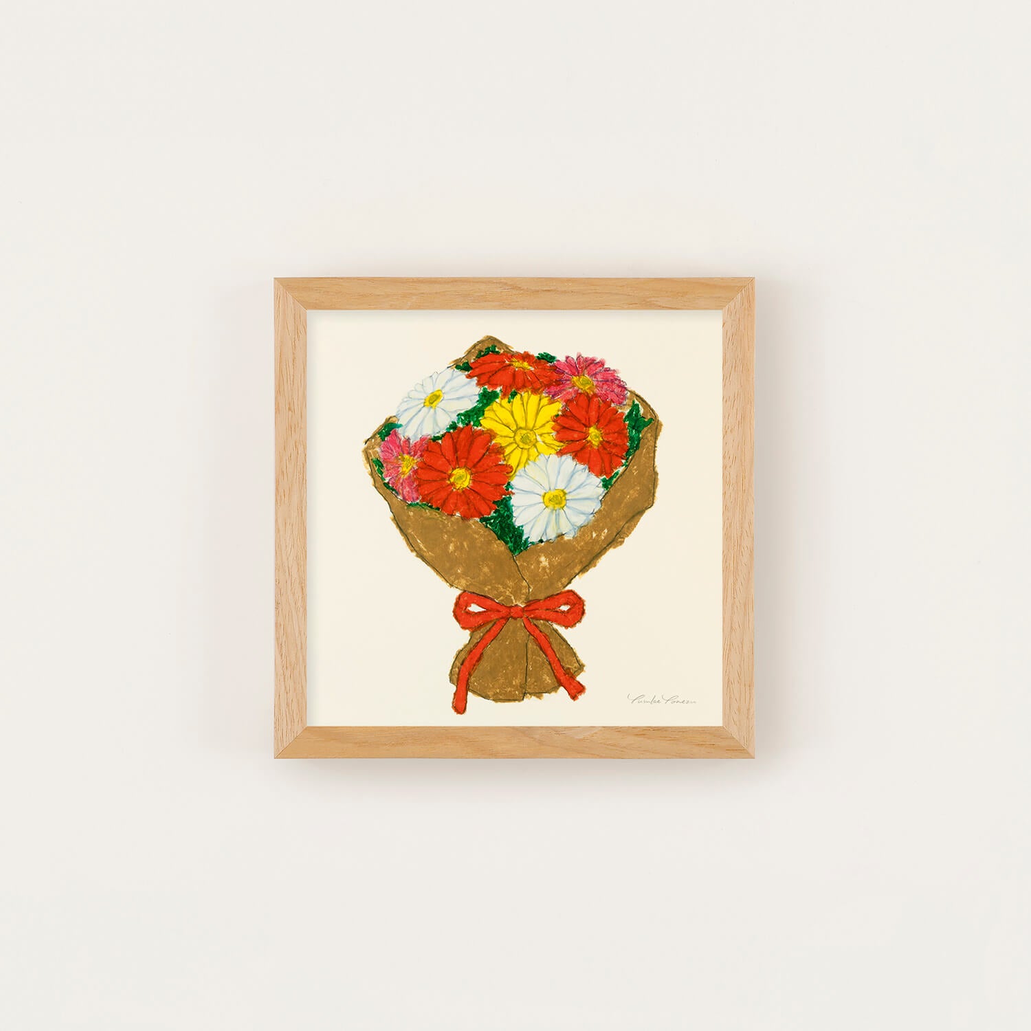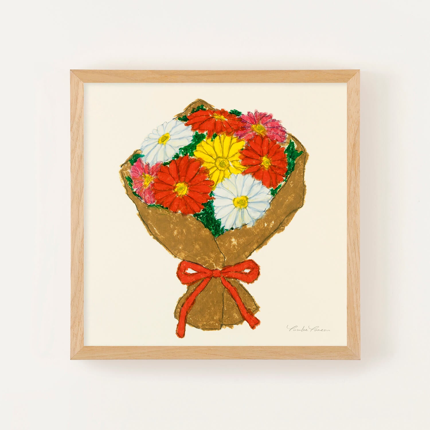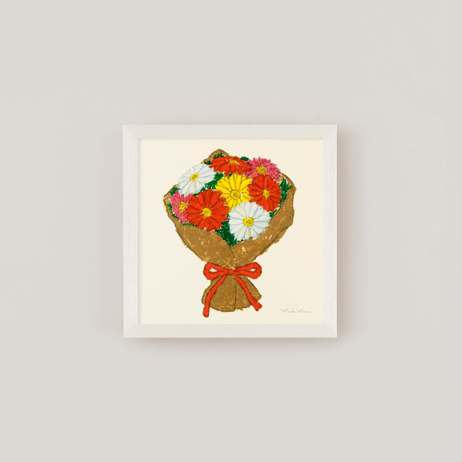 A bright and vibrant bouquet of vividly colored gerberas—red, white, yellow, and pink—tightly bundled together. The flower's symbolism includes "hope," "positivity," and "gratitude," brimming with positive sentiments. Yusuke Yonezu's simple and warm style is a piece of art that gently brightens the viewer's heart.