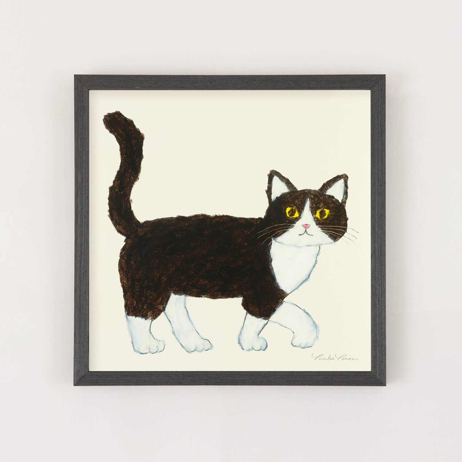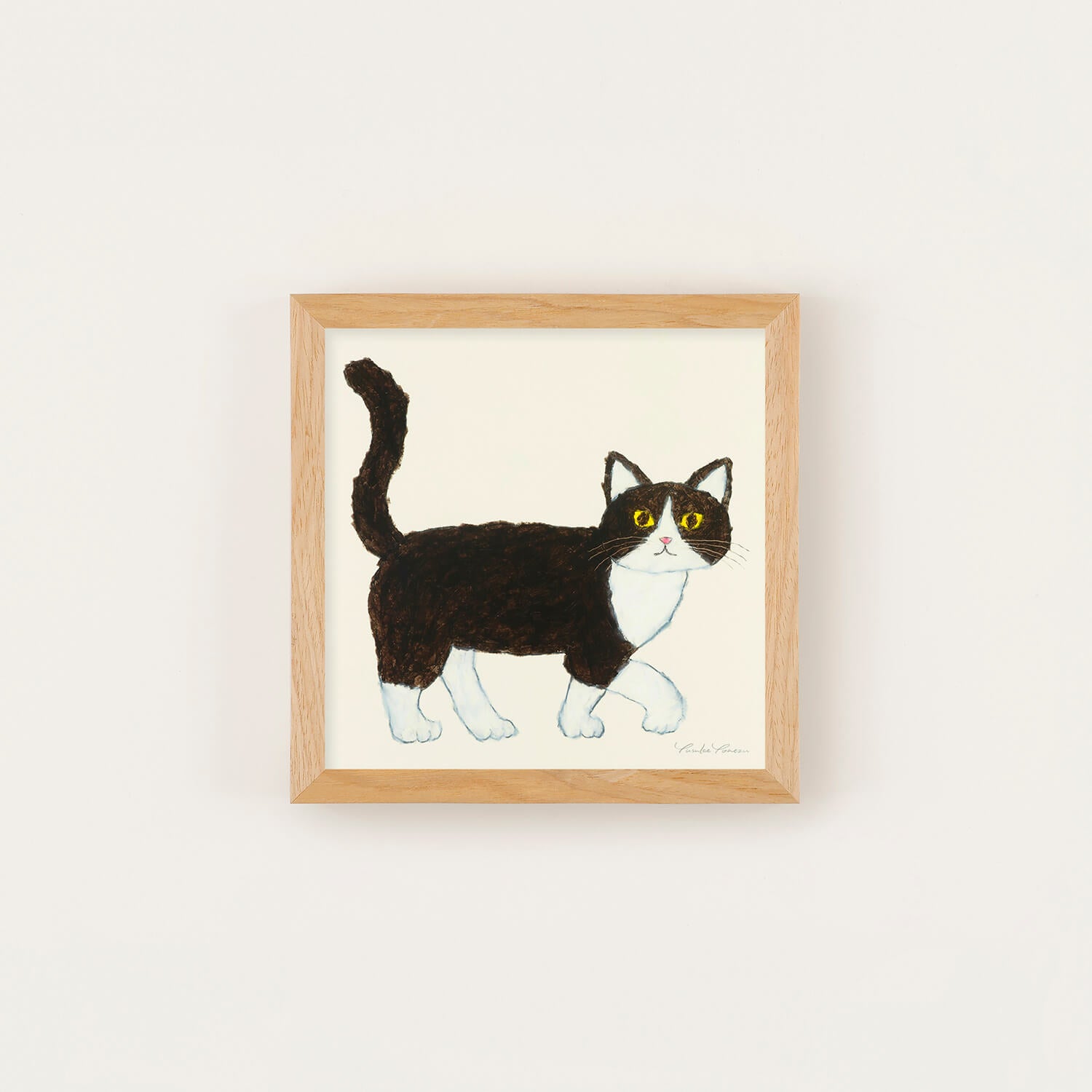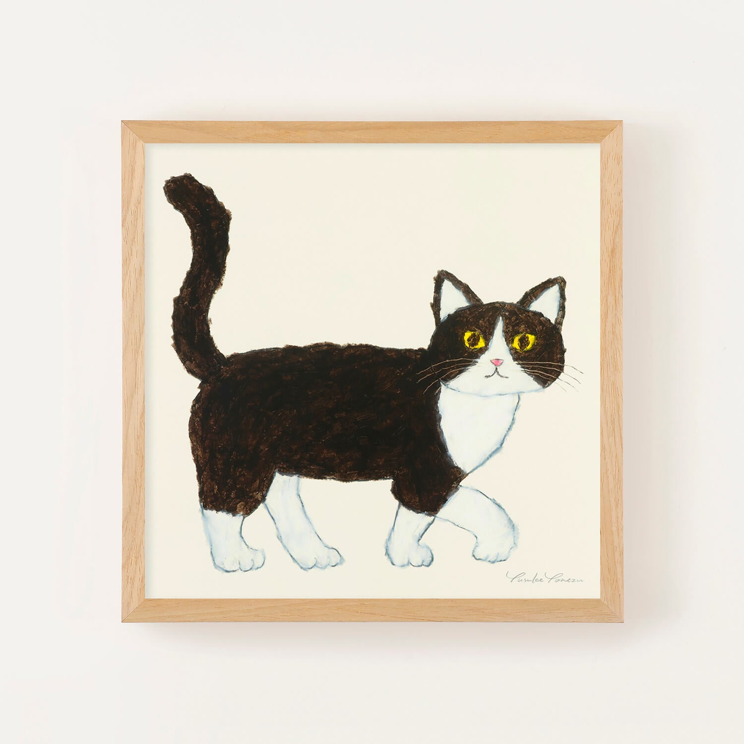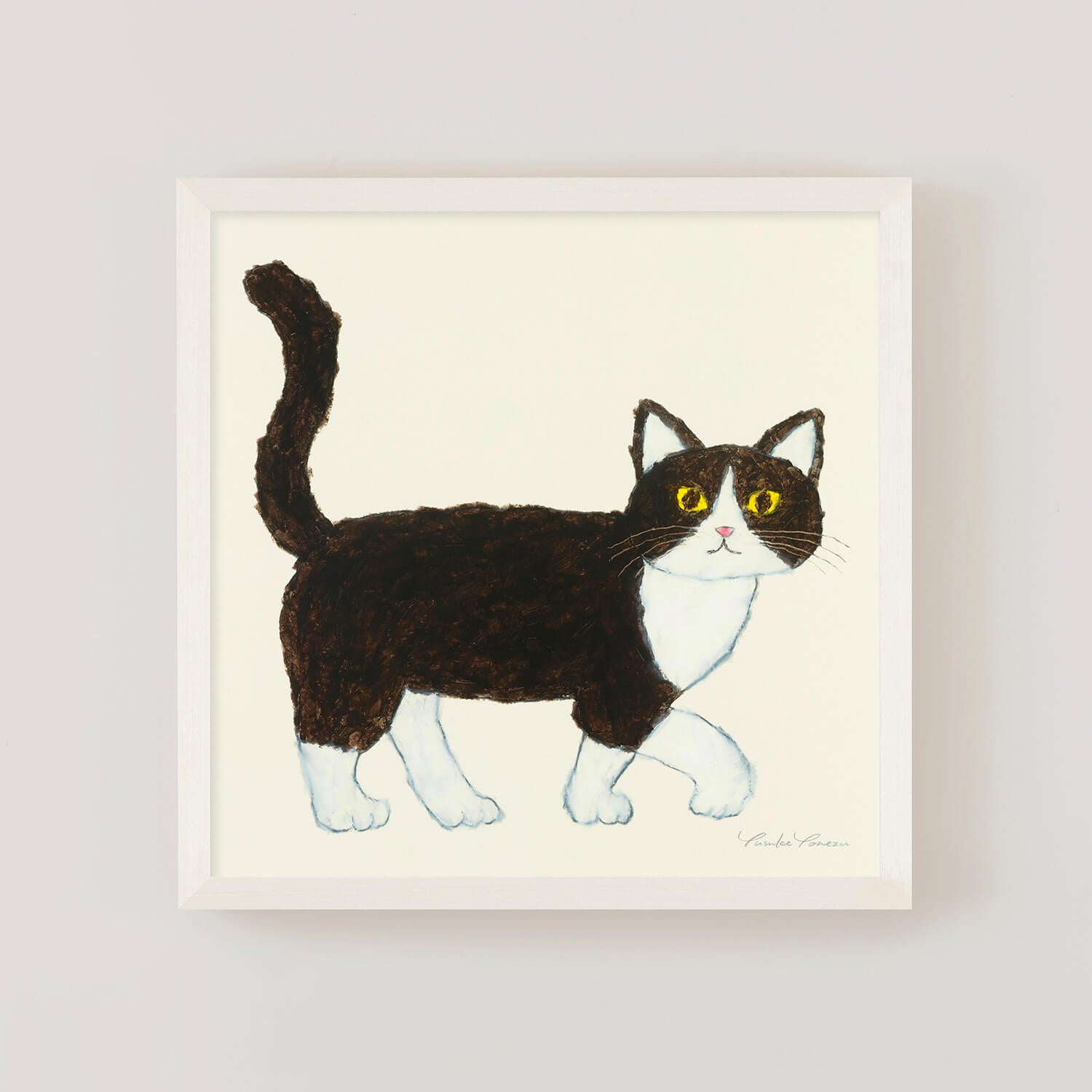 This art poster features a "Hachiwara cat," a cat with a distinctive "8" (ha) shaped pattern of white fur running from its forehead down its nose. The cat's large yellow eyes gaze intently at the viewer, conveying a sense of quiet strength and a certain refined air. Overseas, they're known as "tuxedo cats" or "bicolor cats." In Japan, the number "8" has long been associated with prosperity and good fortune, and these cats have been cherished affectionately for generations. A work by Yusuke Yonetsu.