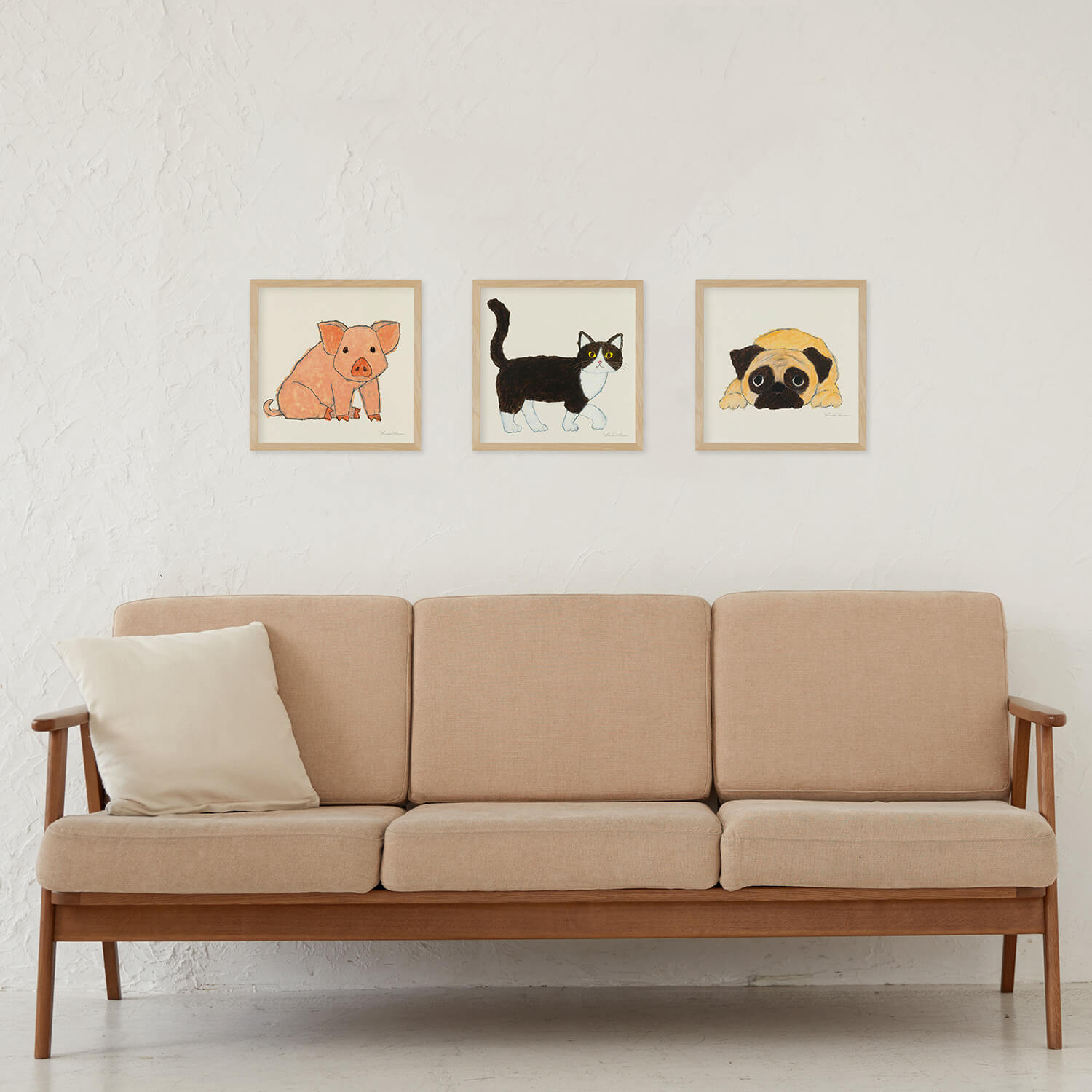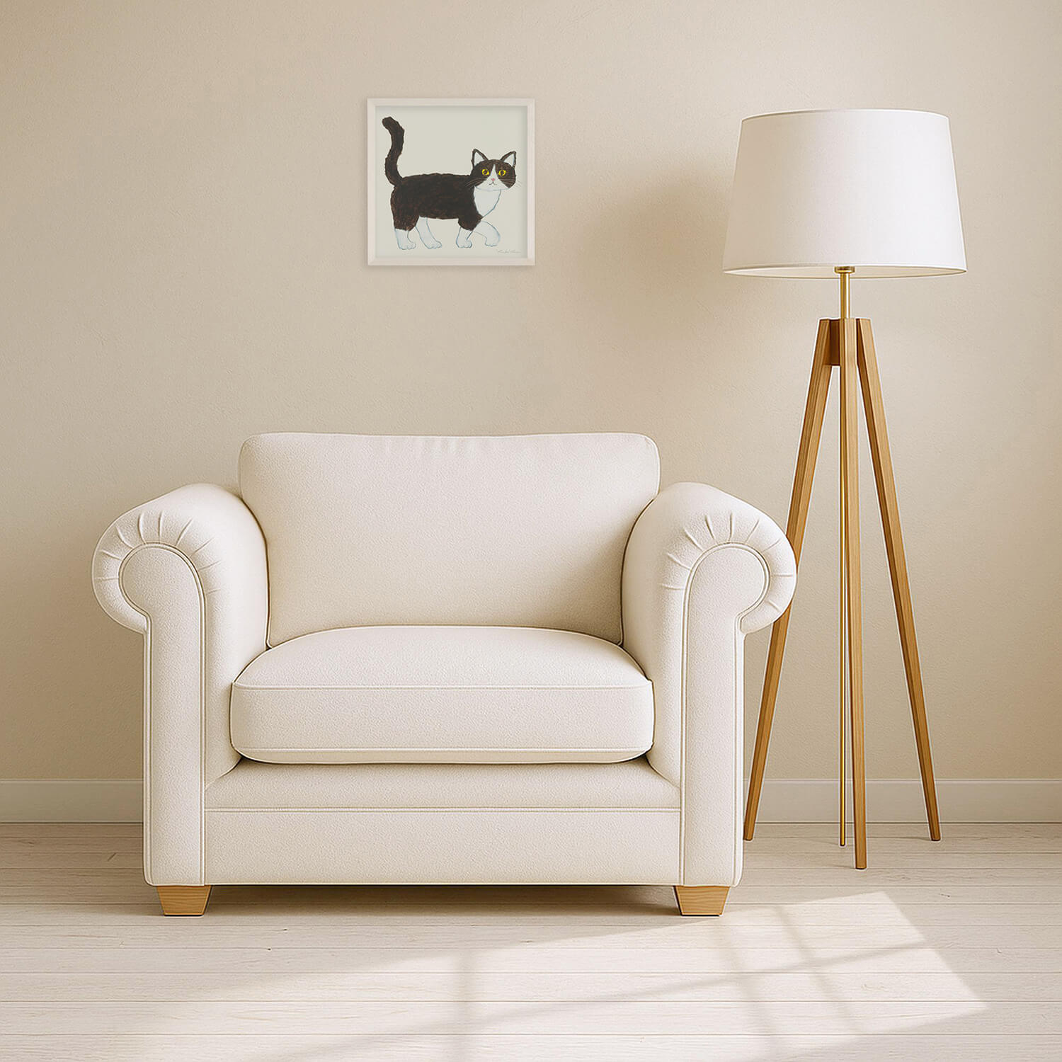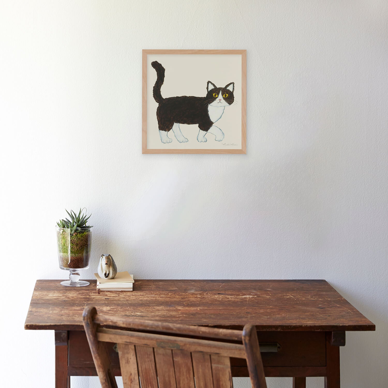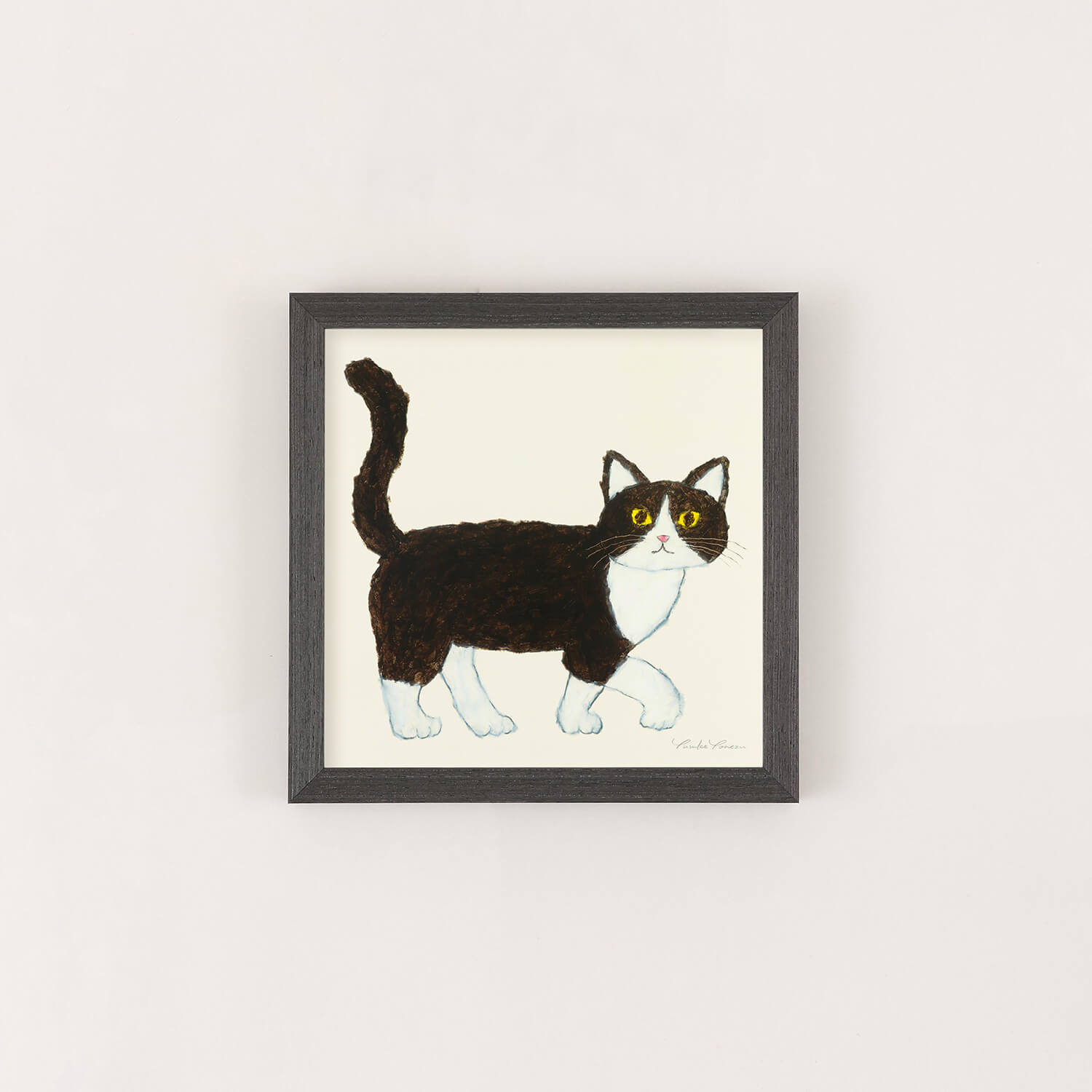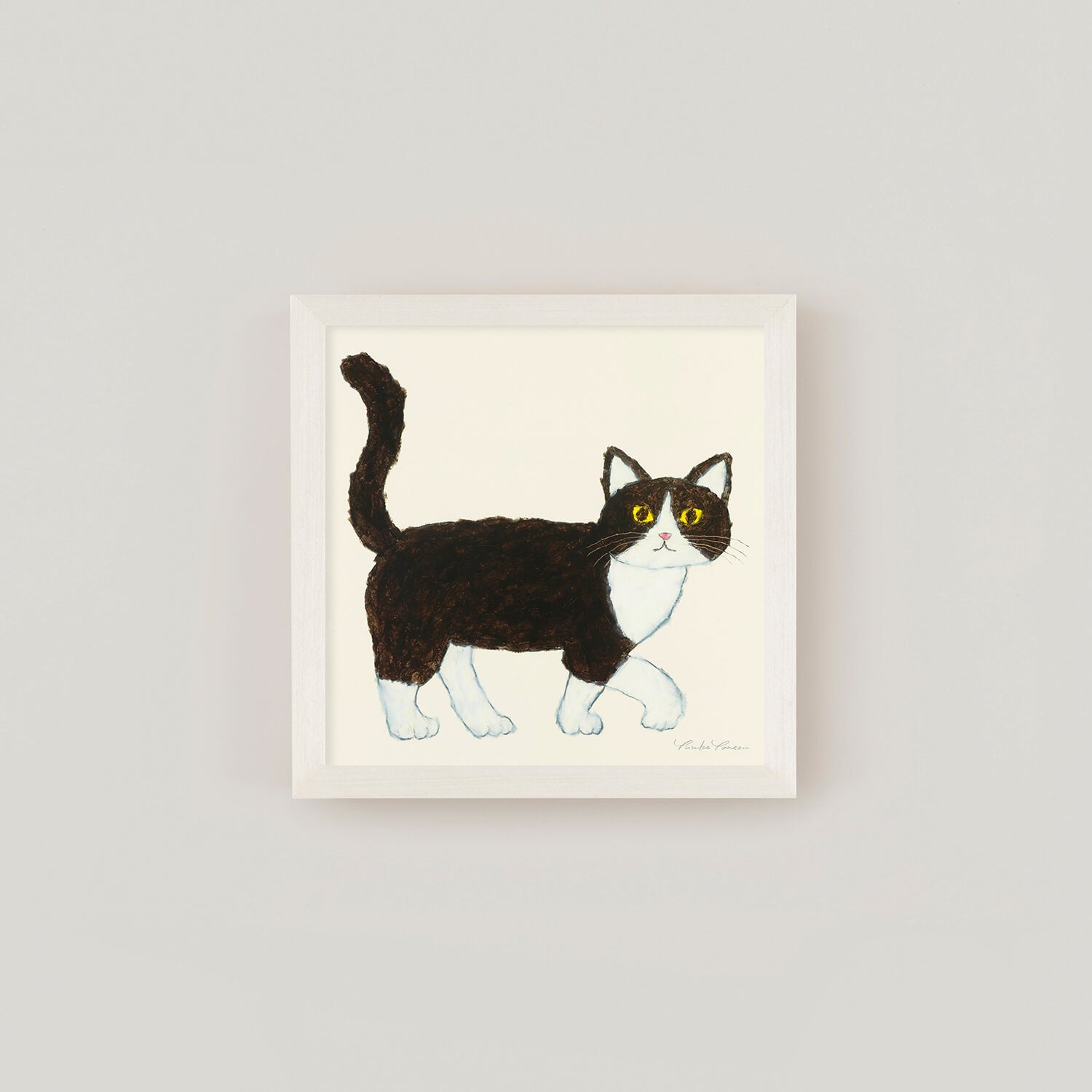 This art poster features a "Hachiwara cat," a cat with a distinctive "8" (ha) shaped pattern of white fur running from its forehead down its nose. The cat's large yellow eyes gaze intently at the viewer, conveying a sense of quiet strength and a certain refined air. Overseas, they're known as "tuxedo cats" or "bicolor cats." In Japan, the number "8" has long been associated with prosperity and good fortune, and these cats have been cherished affectionately for generations. A work by Yusuke Yonetsu.
