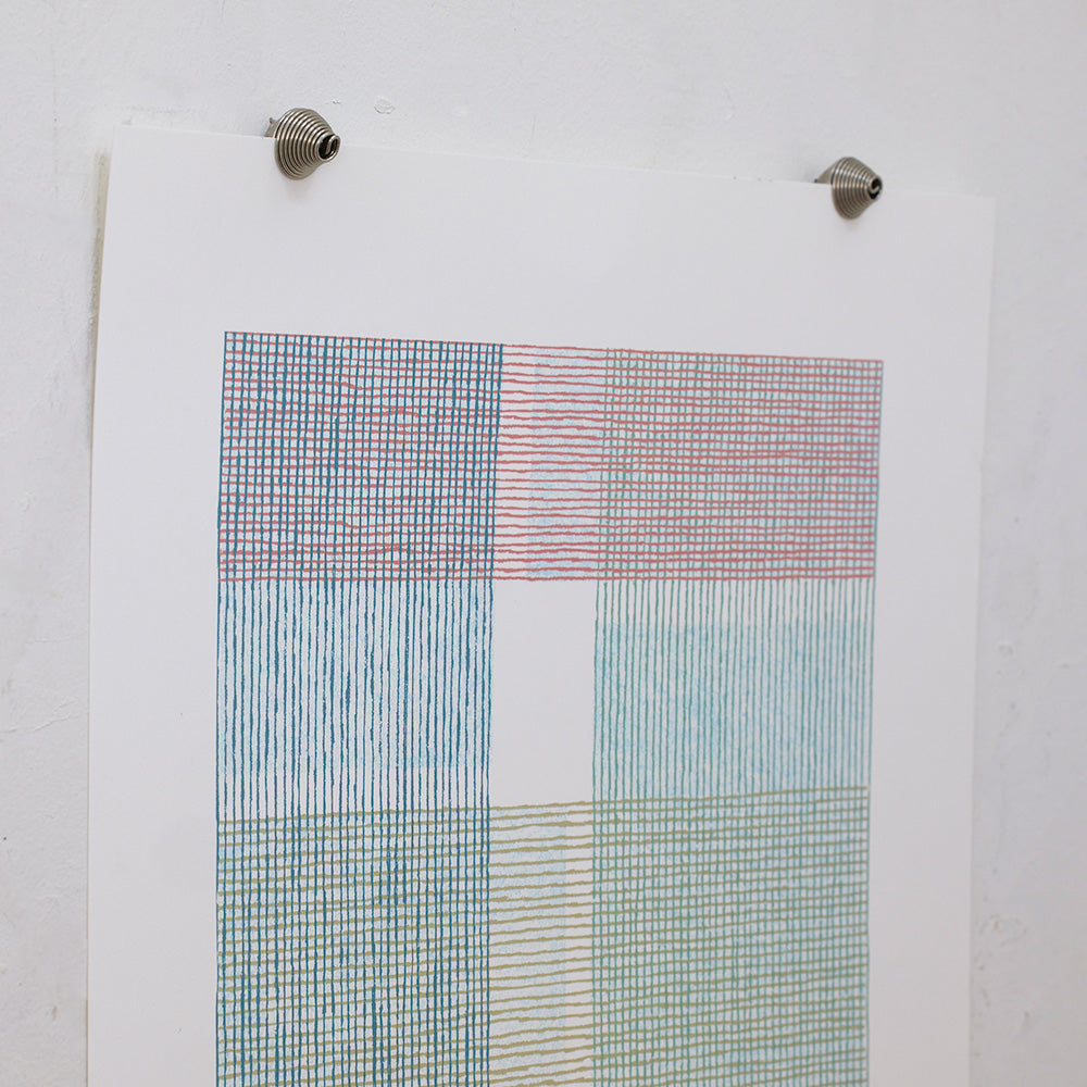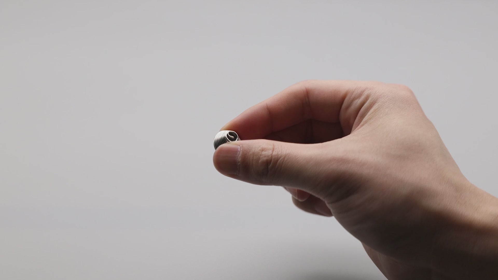 The pin is made of a single piece of metal wire and holds paper by clamping it between the gaps in the spring. The size is Φ15mm, easy to handle with your fingertips. As shown in the video, moving the spring creates a gap, making it easy to insert the paper. One pin is sufficient for postcards or 20cm square posters, and two pins are easy to use for 30cm square posters.
