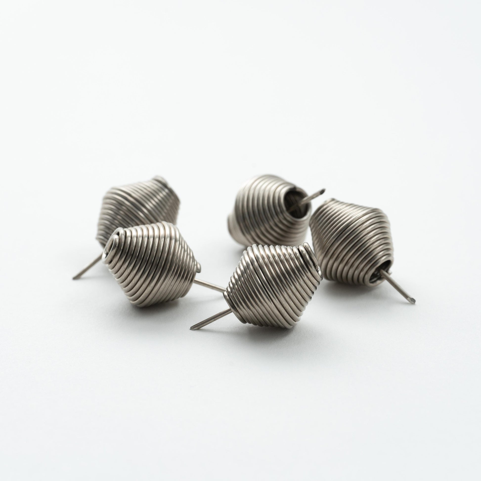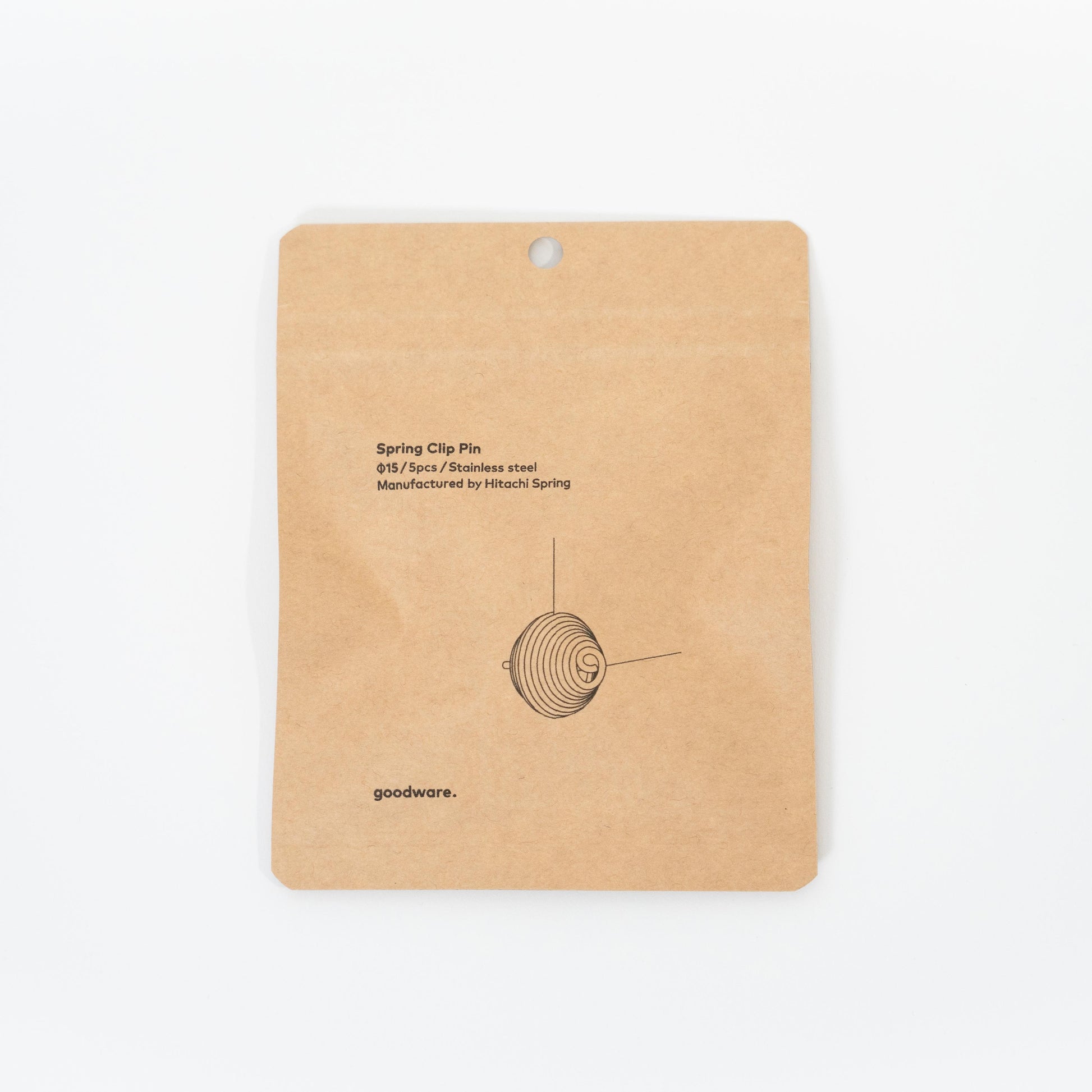 This is a 5-piece set of spring clip pins (thumbtacks) from "goodware.", a daily goods brand that utilizes the processing technology of local factories in Ota Ward, Tokyo. These thumbtacks allow you to secure important papers like posters and cards without making holes. The pin and spring are made from a single piece of wire; paper is held in place by the spring's tension.