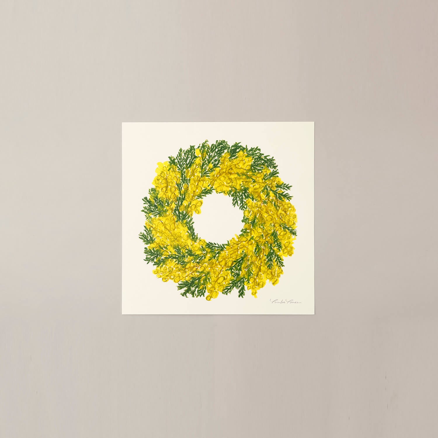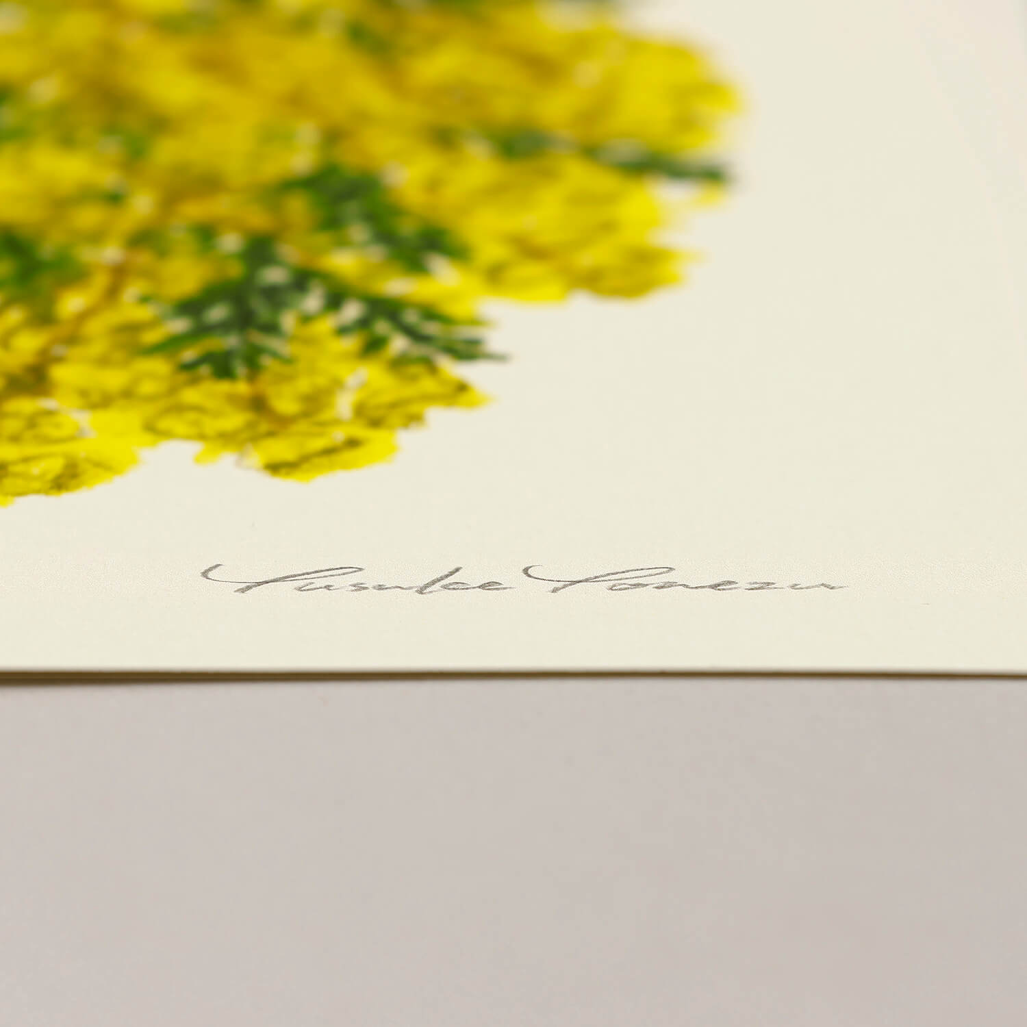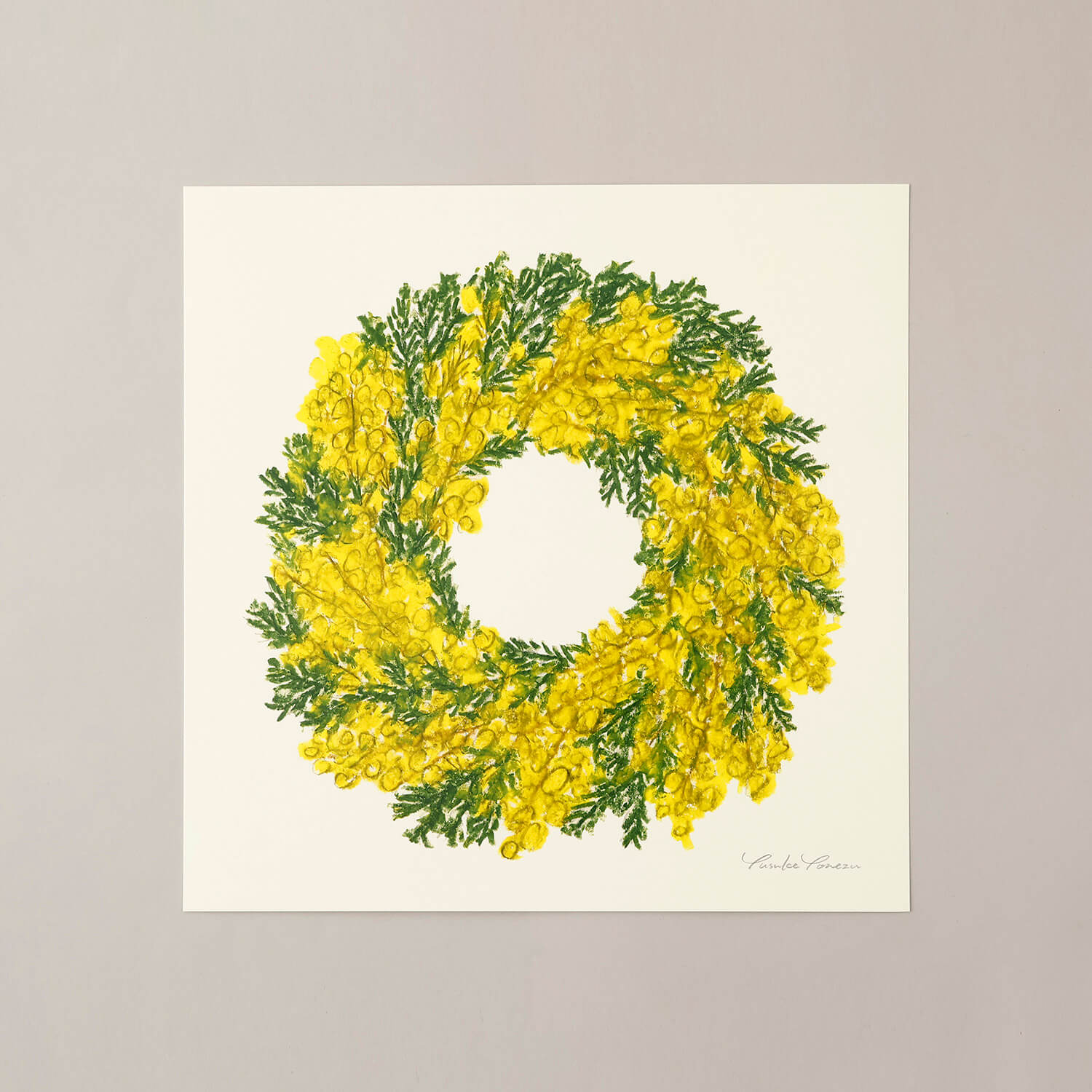 Mimosa, a plant that symbolizes the arrival of spring, is sometimes cultivated as an ornamental plant in gardens and parks due to its vibrant colors and unique fragrance. A mimosa wreath, particularly popular in Yusuke Yonezu's botanical illustrations, has now been made into a poster.