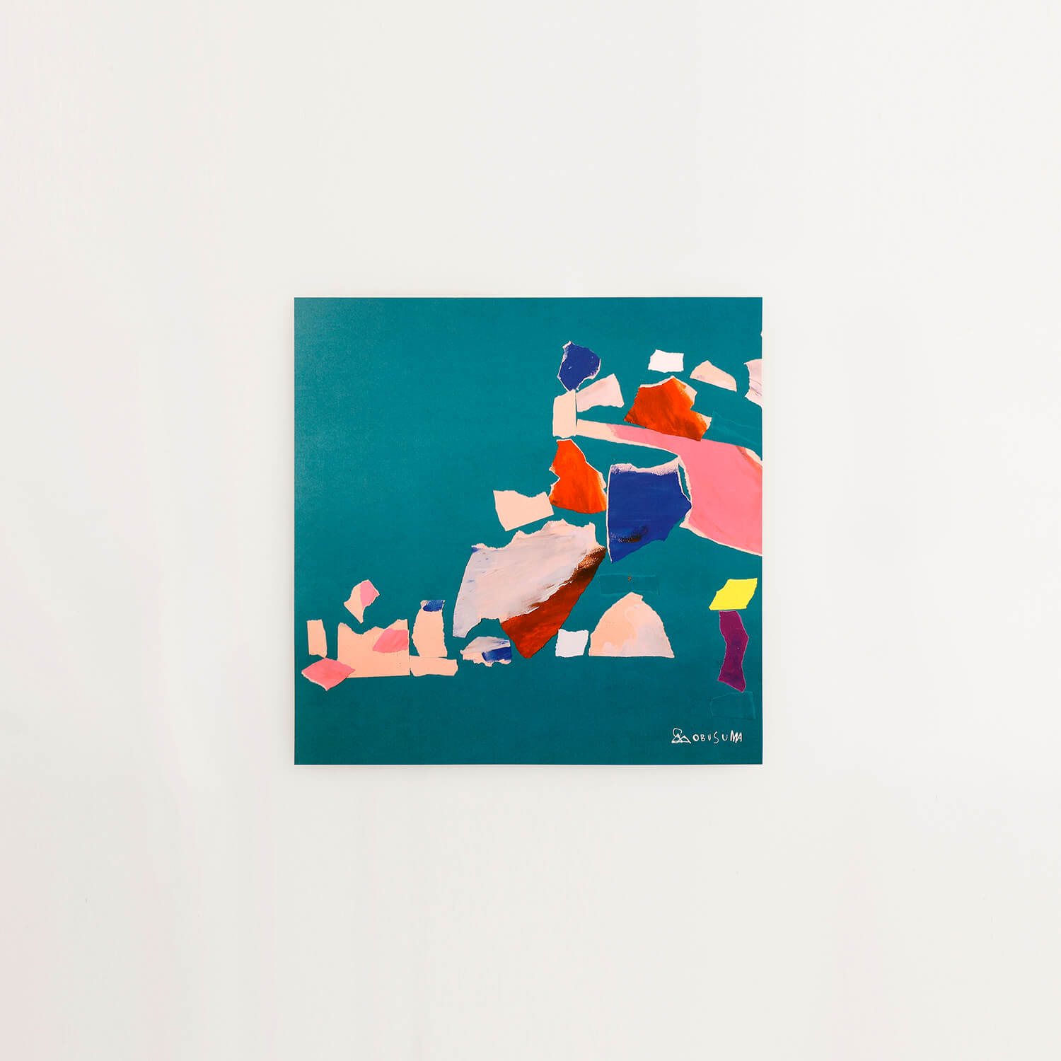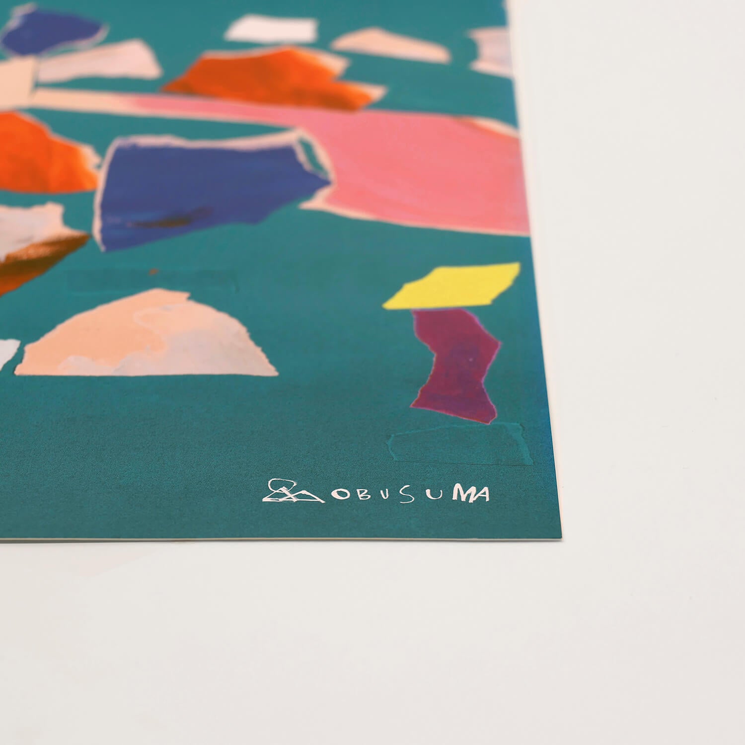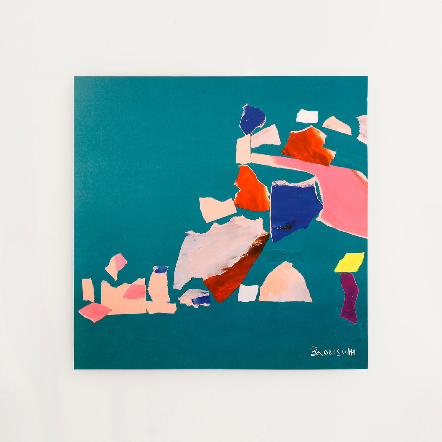 These torn-paper collages feature vividly colored paintings created using hands, brushes, and scraps of wood from the wood product-making process. The paintings are torn into various shapes and freely arranged on colored backing paper. Directed by Rika Kawato, these works are created by the members of OBUSUMA , who are free from preconceived notions and possess diverse sensibilities and senses.