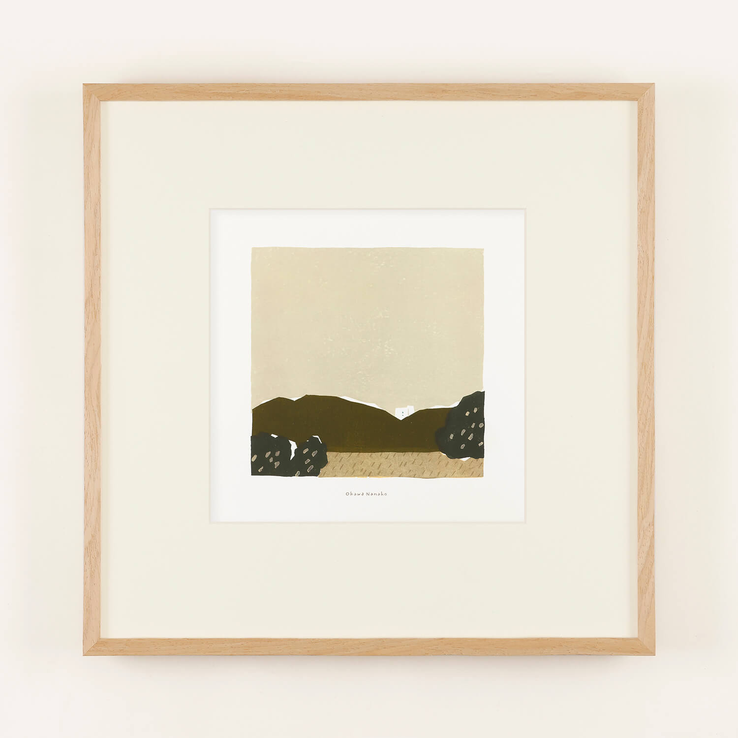 A landscape painting expressed in a grayish monotone. Is that a resort hotel visible in the distance beyond the mountain range? Please enjoy this artwork by Nanako Okawa, overlaying it with the landscapes in your own hearts.