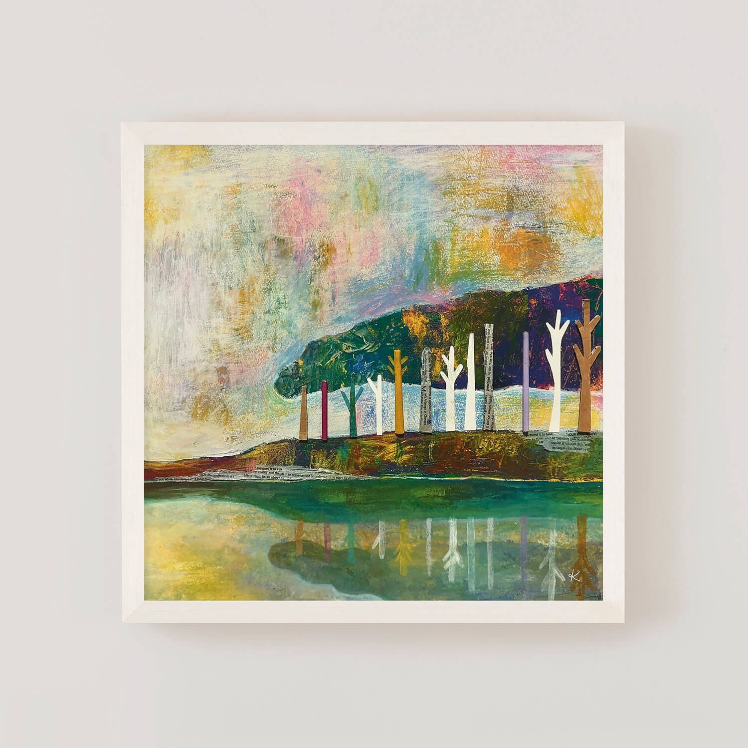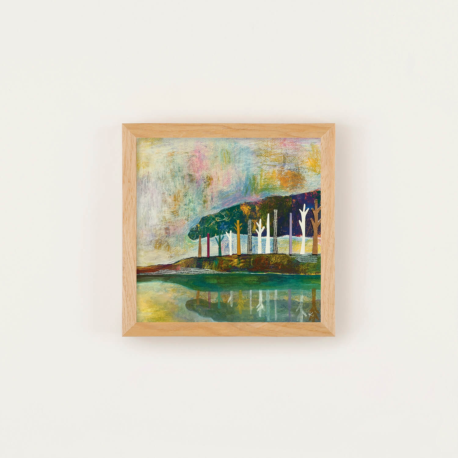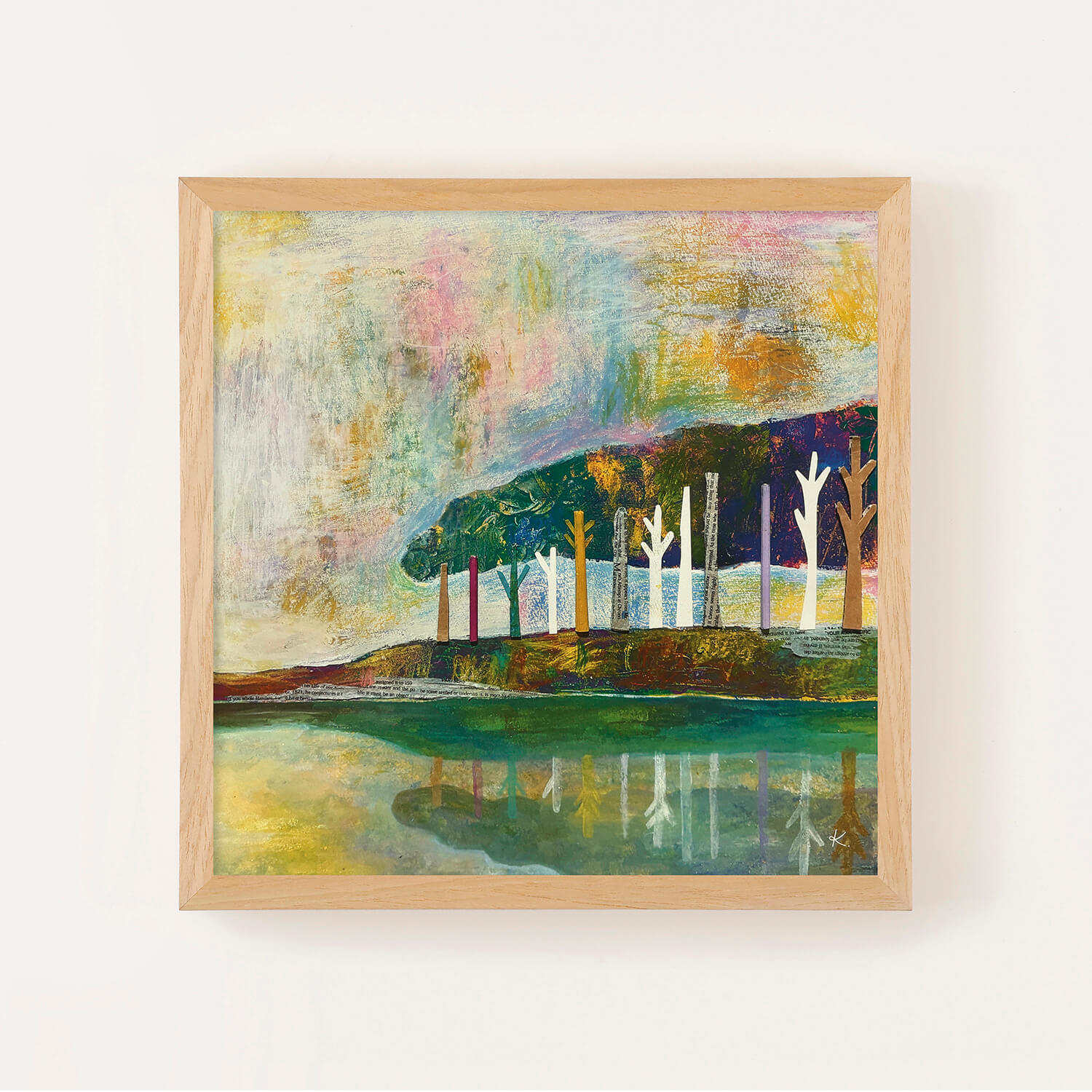 The sky, a blend of warm and cool colors, is said to represent the spread of a rainbow. This is a work by Kan-o-a, created using various techniques and materials, including collage on tree trunks.