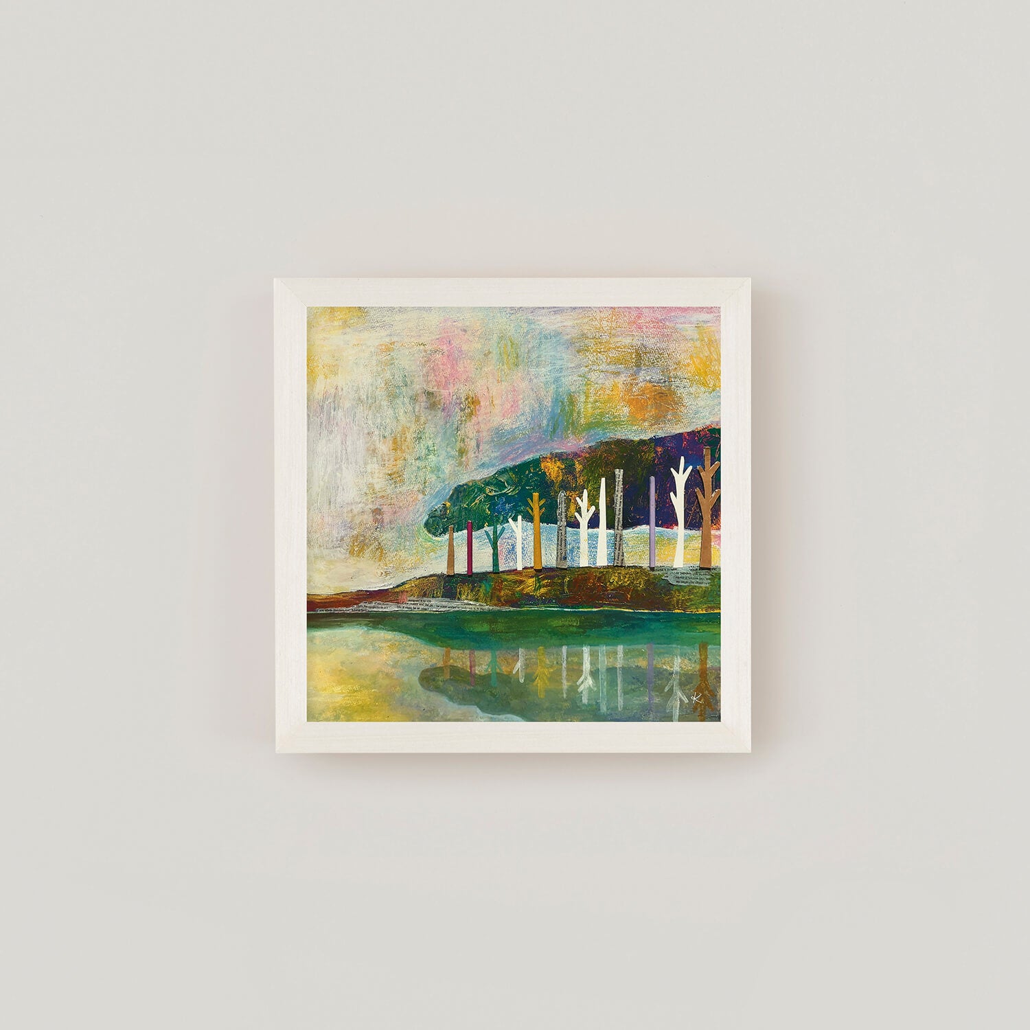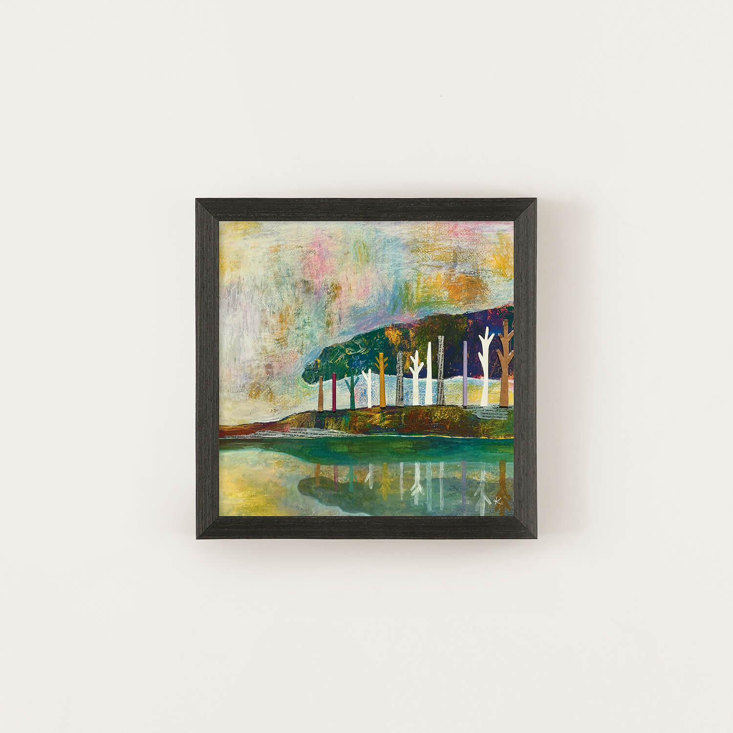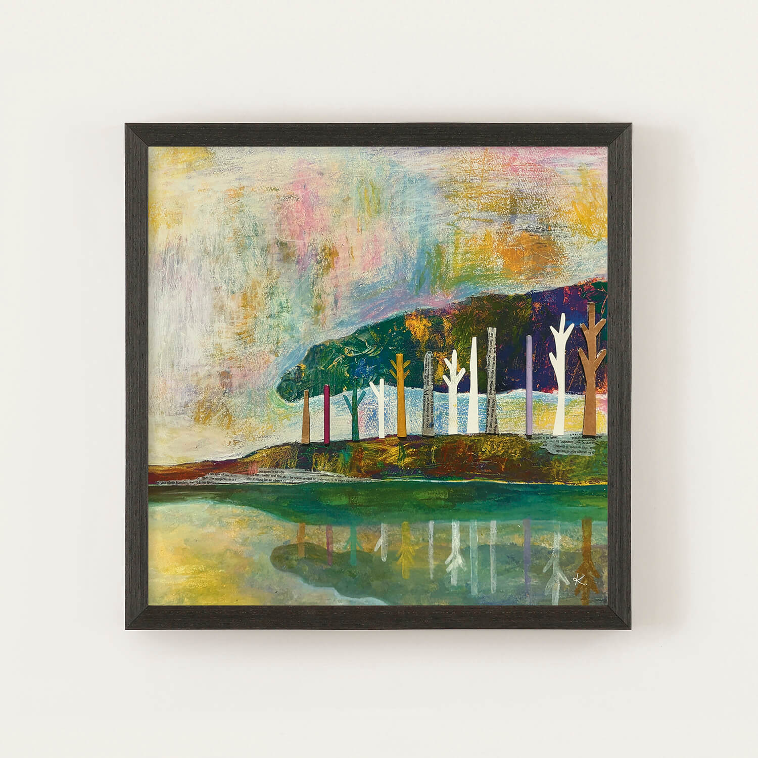 The sky, a blend of warm and cool colors, is said to represent the spread of a rainbow. This is a work by Kan-o-a, created using various techniques and materials, including collage on tree trunks.