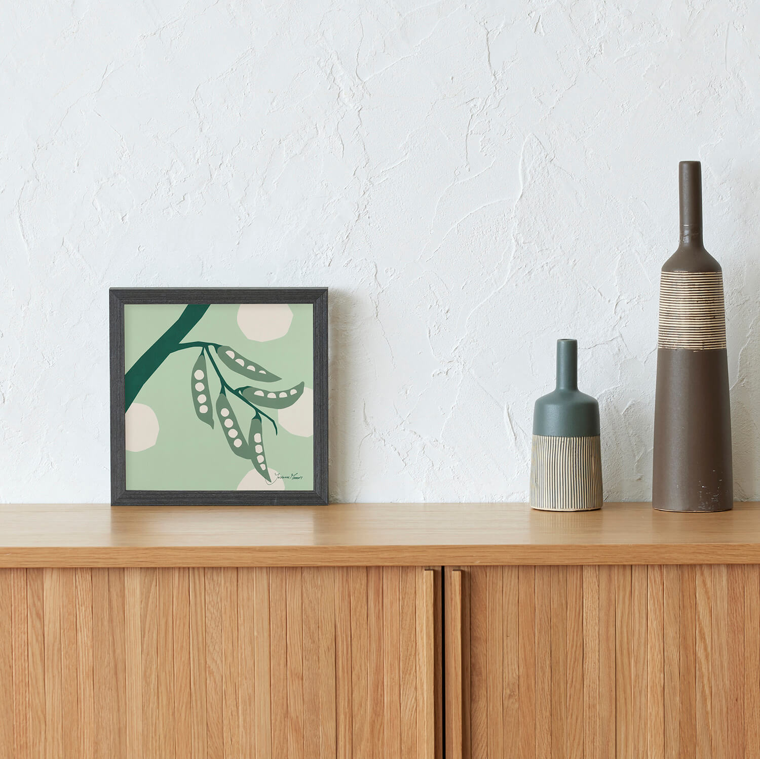 This art series is from the designer Julian Matter, who is loved all over the world and publicly stated that he " wanted to decorate his walls with posters like these ." The combination of cut-paper-like fava beans in a grayish mint color and dots arranged in the background conveys a stylish warmth and gentleness that is characteristic of the Netherlands.