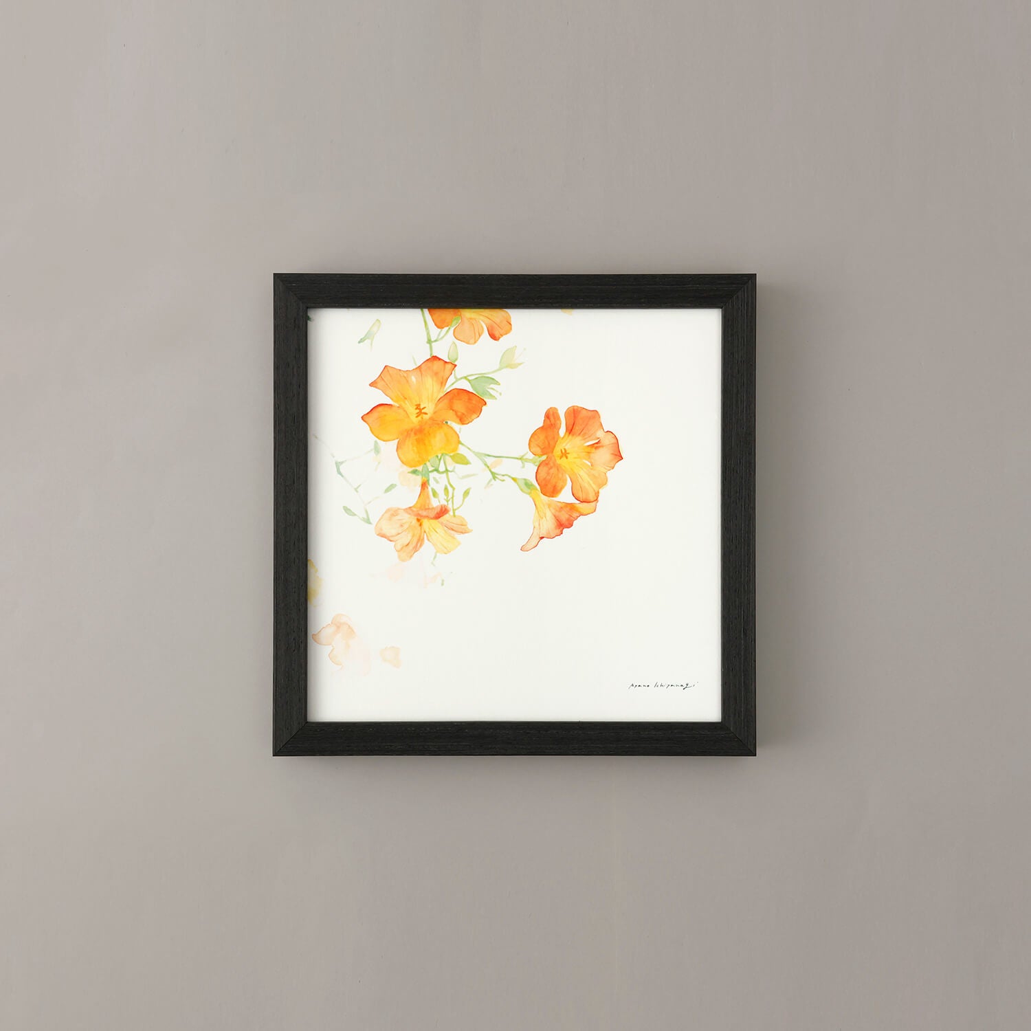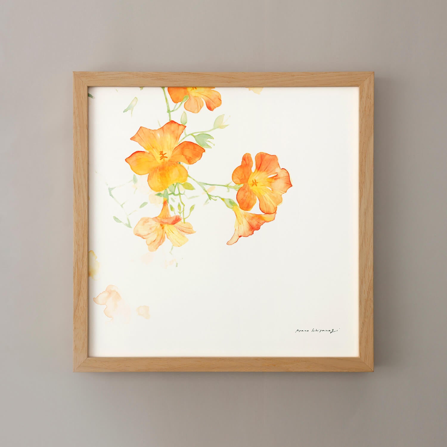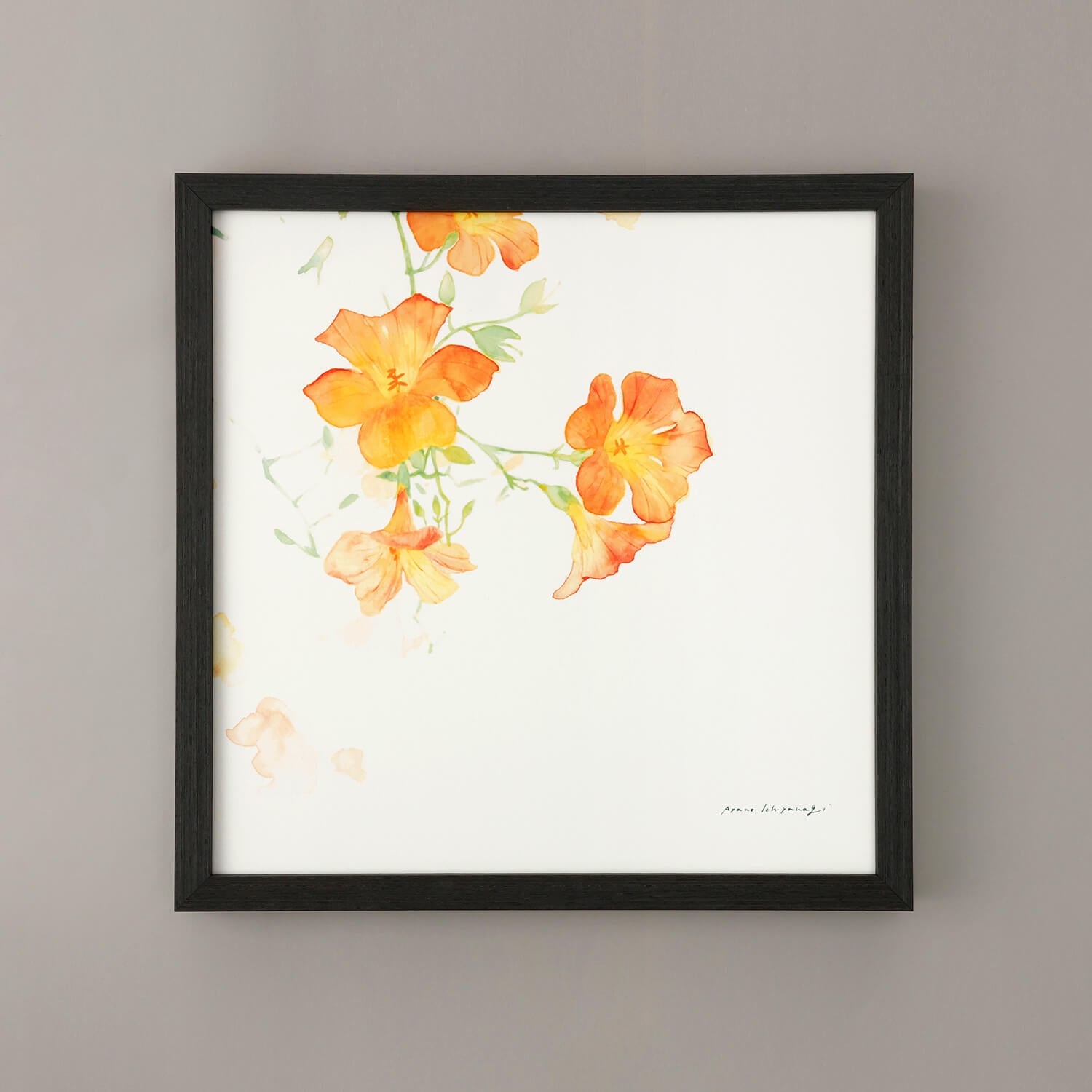 Campsis, known in Japanese as "Nōzenkazura" (凌霄花), is a perennial climbing plant. It has long been cultivated for its flowers and is used as a climbing plant in gardens and parks. This is a work by Ayano Ichinagi, exquisitely blending the transparency and color unique to watercolor with a stylish composition.