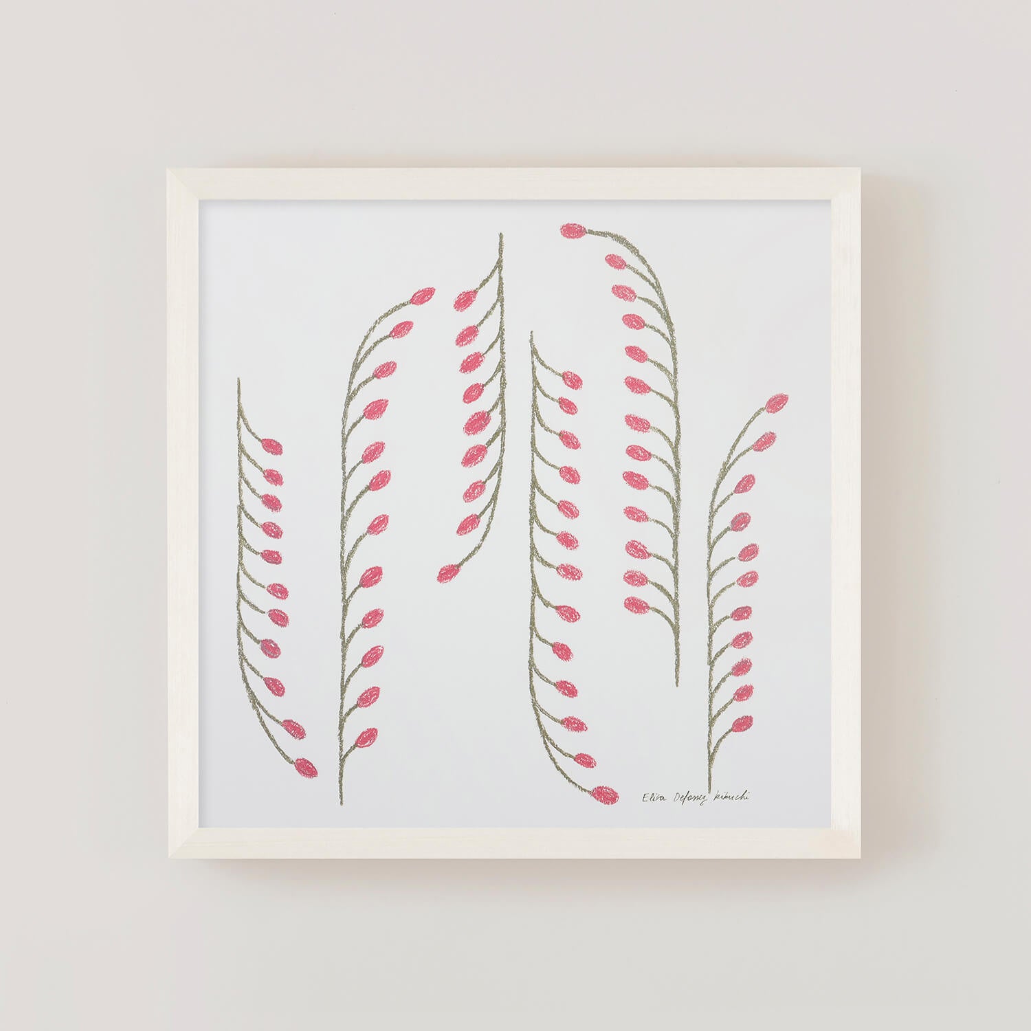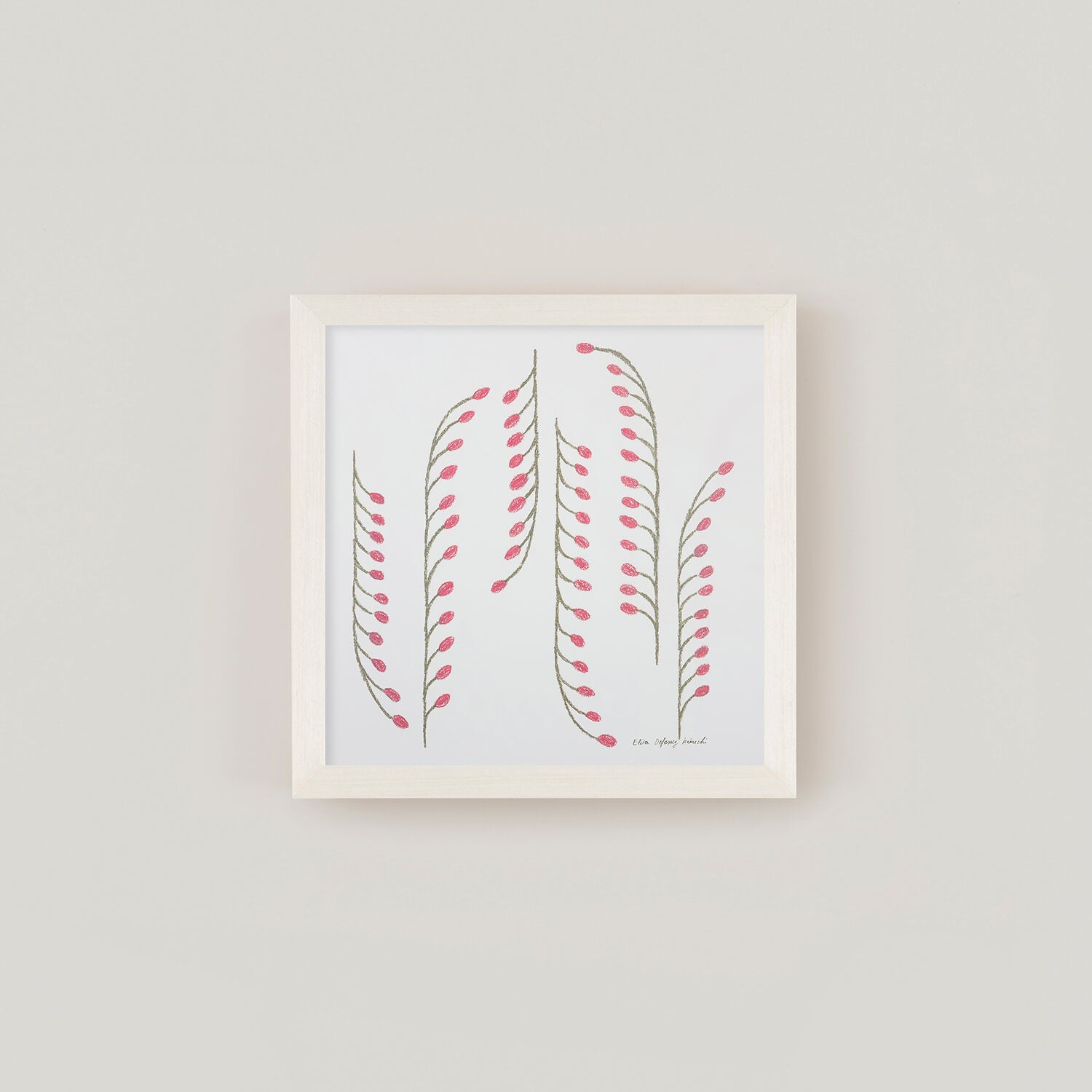 At the tip of a willow-like, supple branch, a pink bud is depicted. This is a charming piece by Elizabete Fosse-Kikuchi, reminiscent of cherry blossoms waiting to bloom.