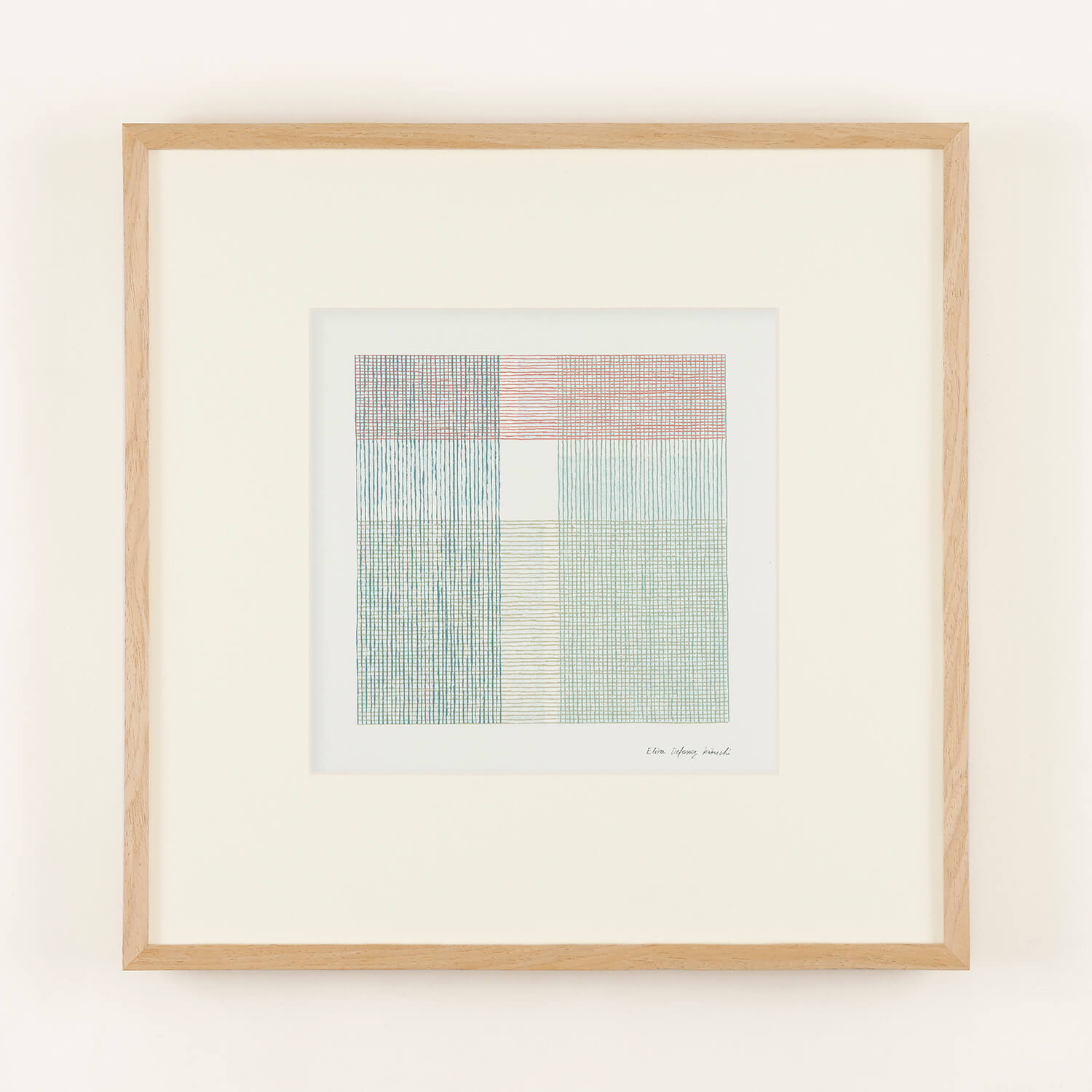 This art expresses new colors and relationships born from the intersection of threads, which is the basis of weaving. While seemingly a minimalist design typical of Nordic art, it's a characteristic work of Eliza De Fou, Kikuchi, with its precise brushstrokes and carefully considered composition.