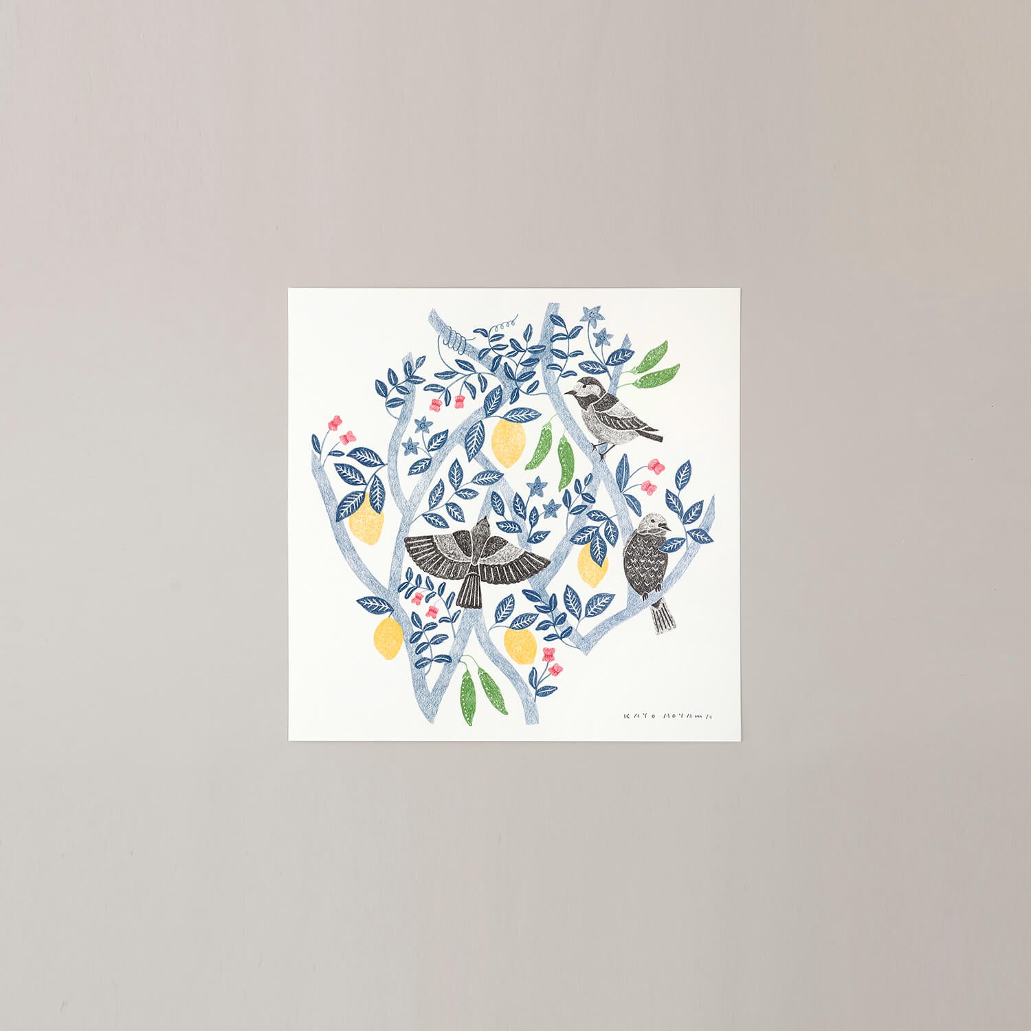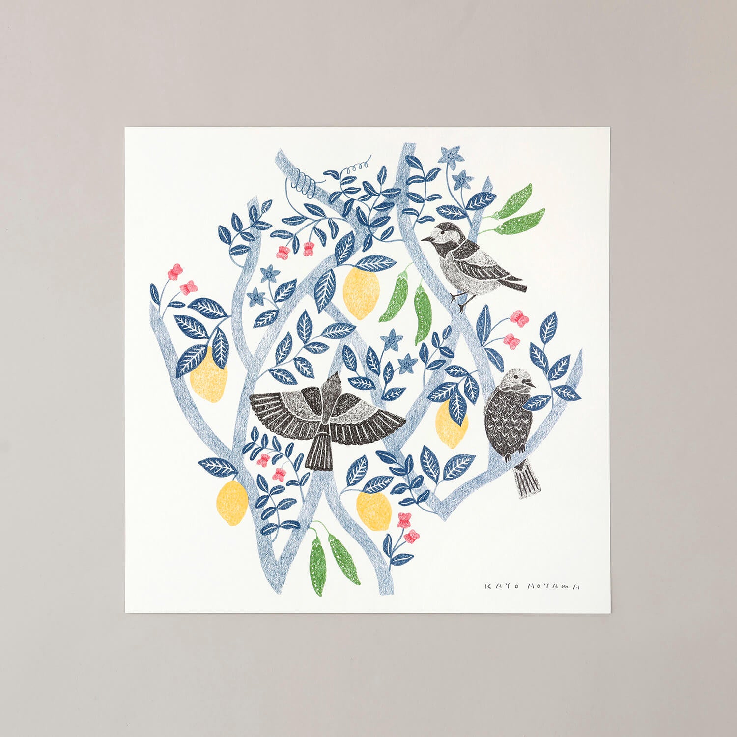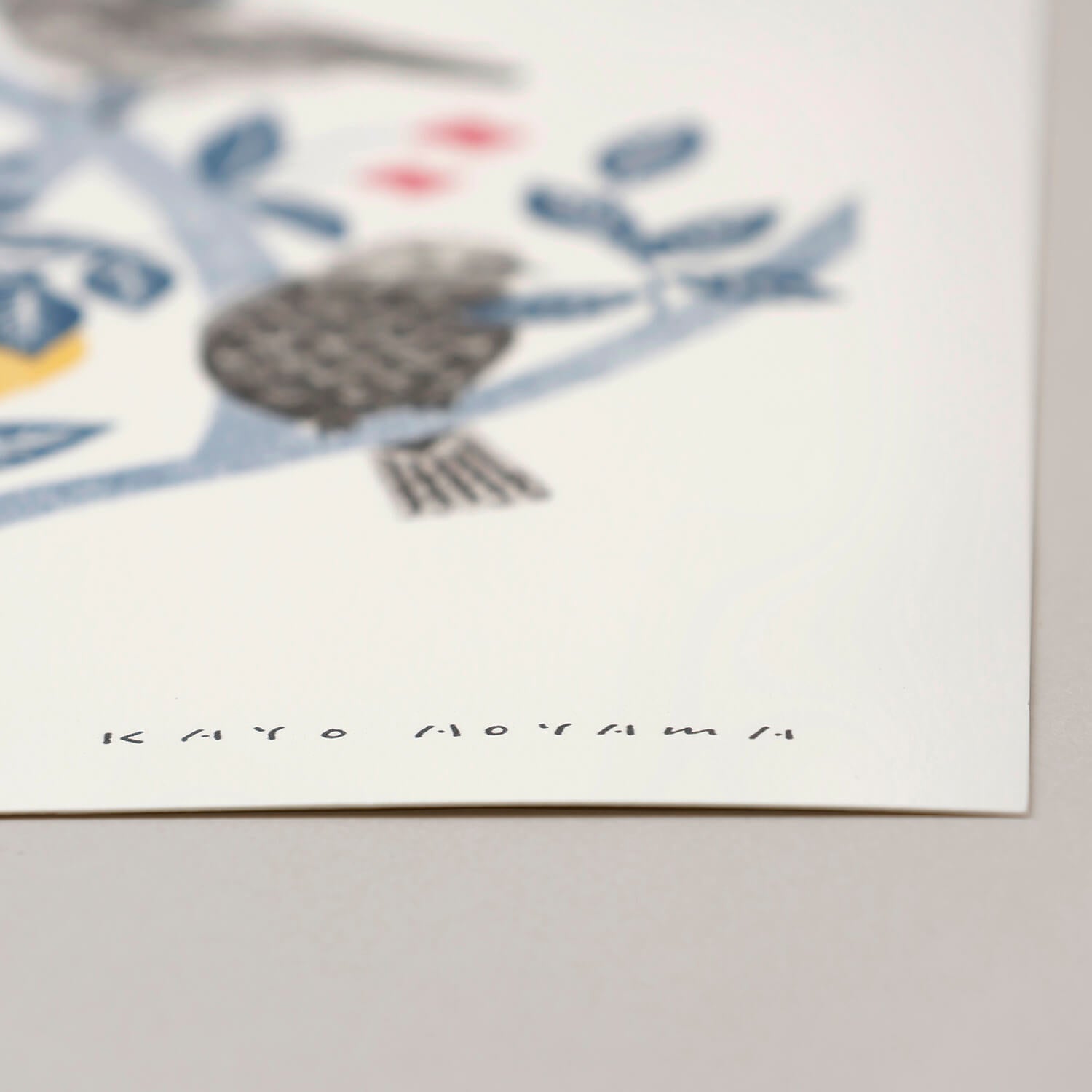 This work, created with colored pencils, features the unevenness and gradations of color unique to hand-drawn art, conveying the gentleness and warmth characteristic of Kayo Aoyama's style. The overlapping motifs and composition that utilizes the texture and white space of the paper create a sense of three-dimensionality.