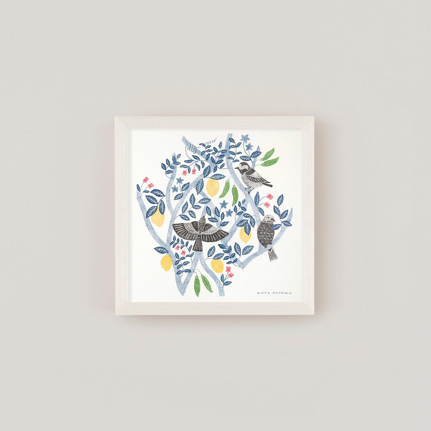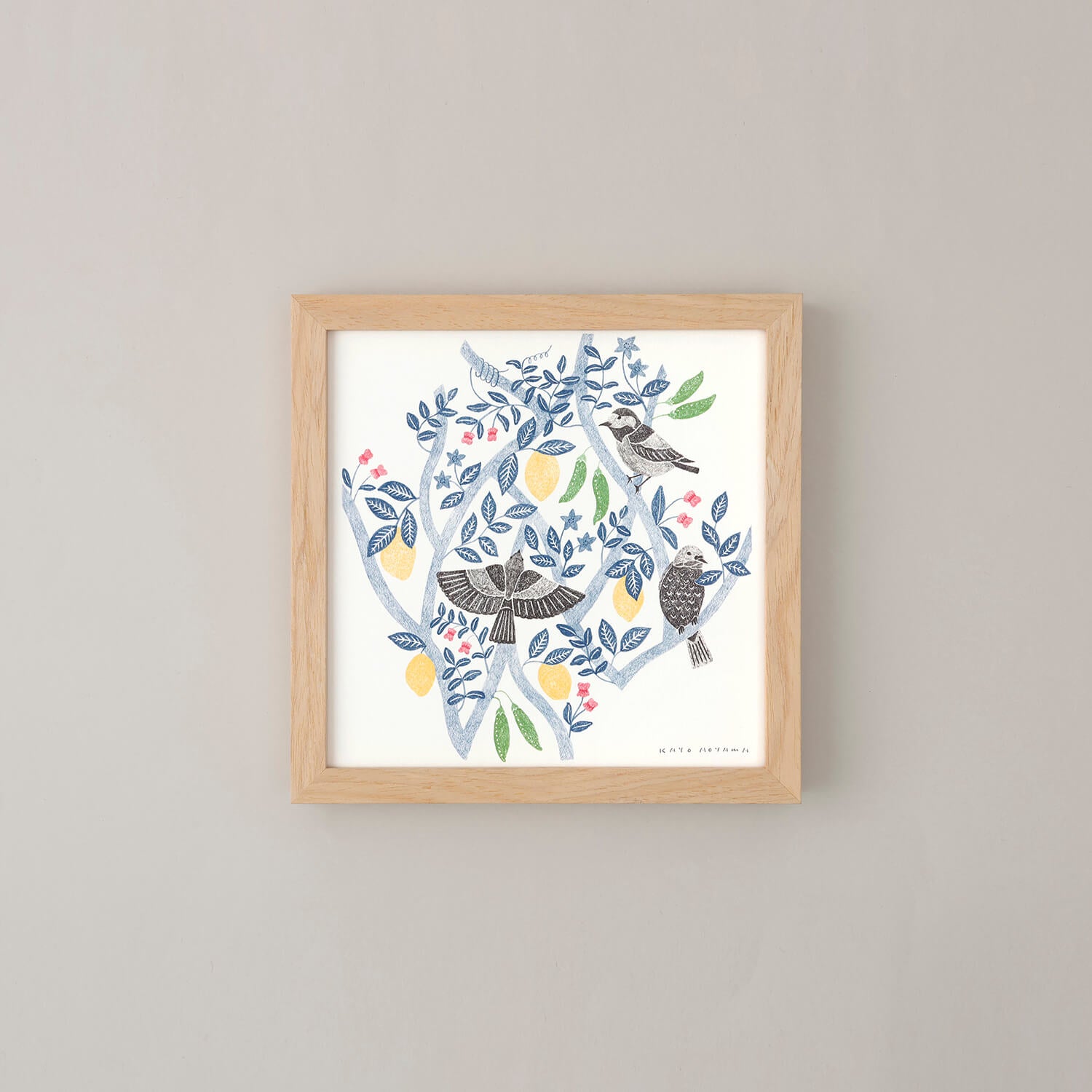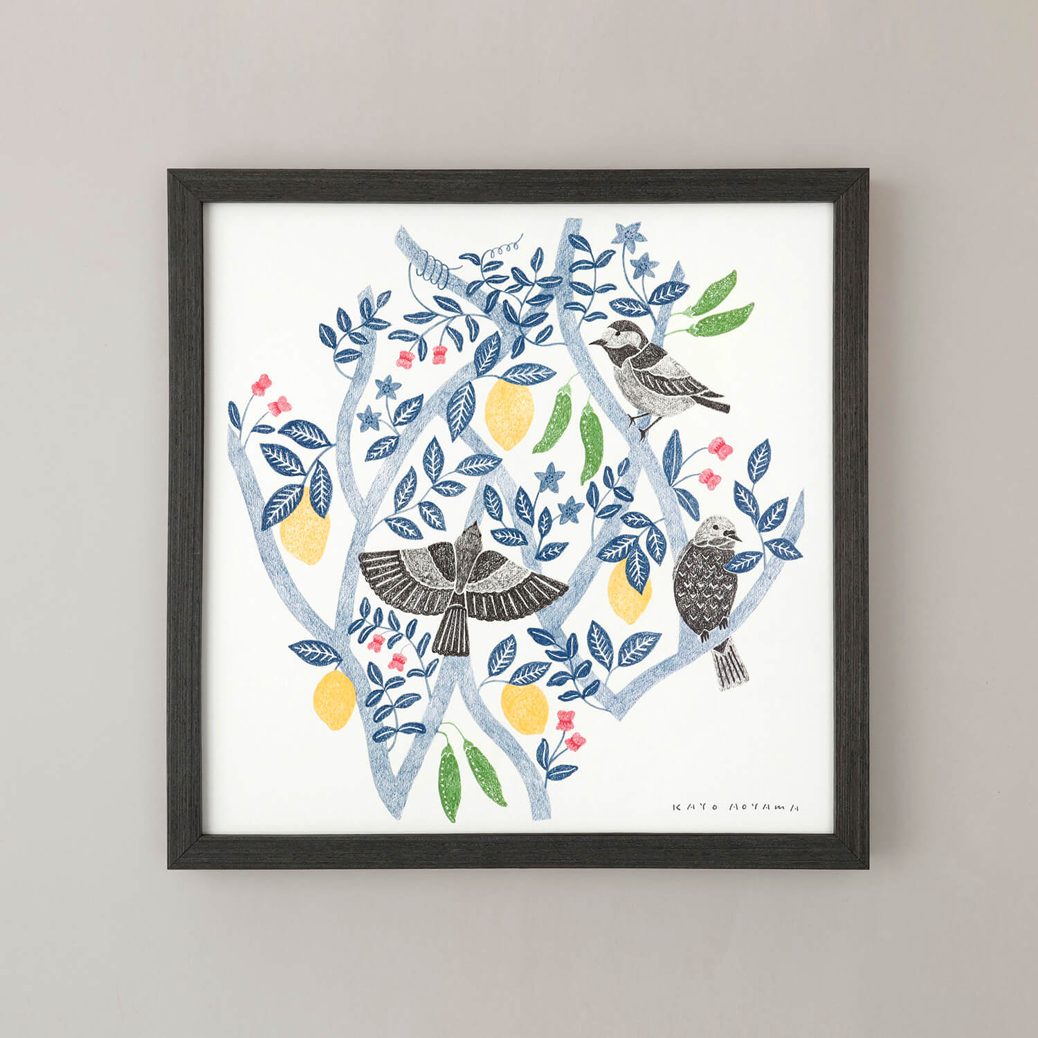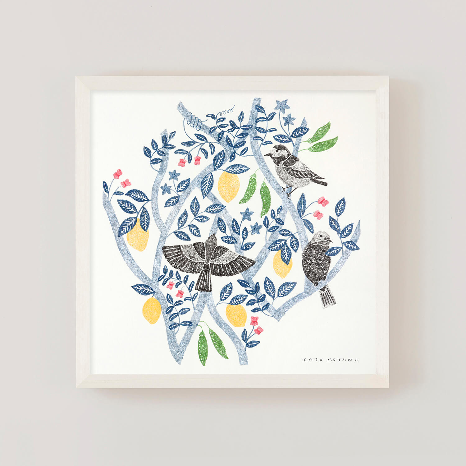 This work, created with colored pencils, features the unevenness and gradations of color unique to hand-drawn art, conveying the gentleness and warmth characteristic of Kayo Aoyama's style. The overlapping motifs and composition that utilizes the texture and white space of the paper create a sense of three-dimensionality.