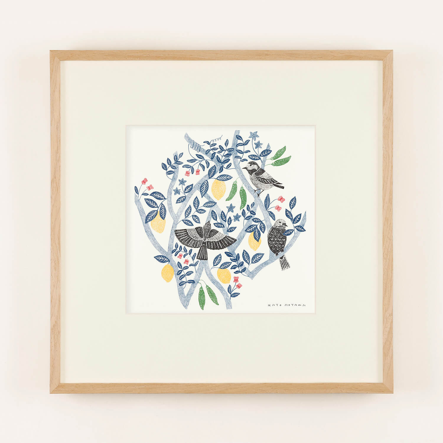 This work, created with colored pencils, features the unevenness and gradations of color unique to hand-drawn art, conveying the gentleness and warmth characteristic of Kayo Aoyama's style. The overlapping motifs and composition that utilizes the texture and white space of the paper create a sense of three-dimensionality.