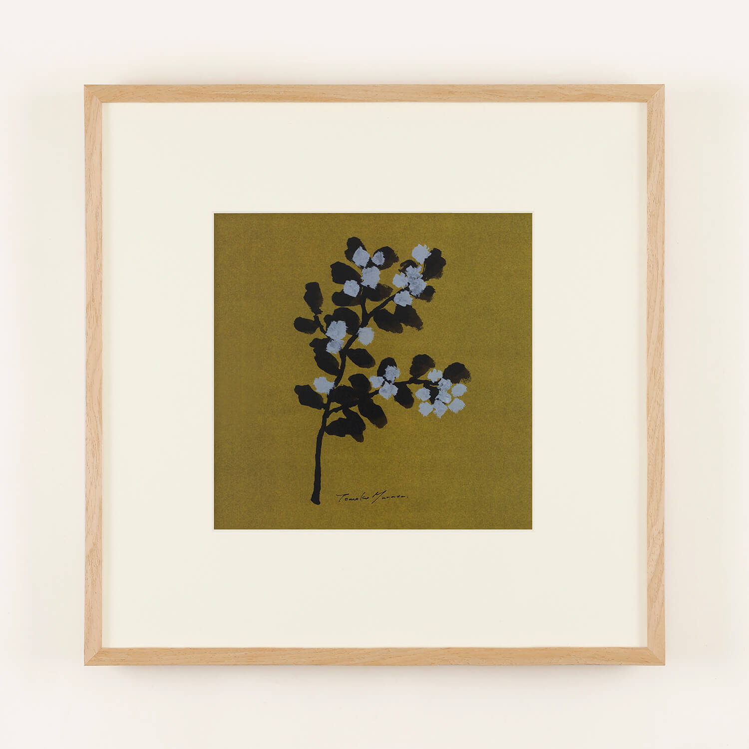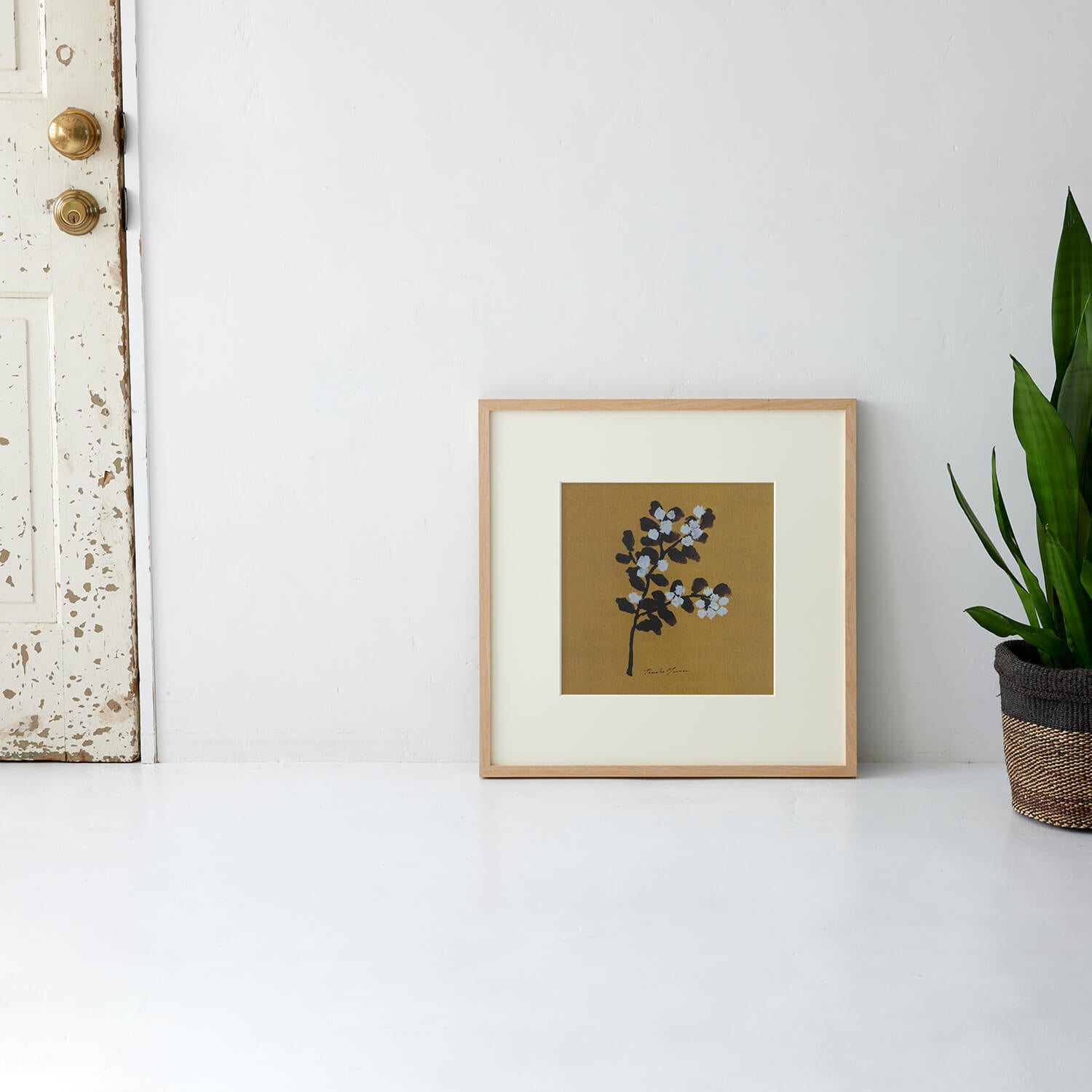 This artwork features mimosa (acacia) blossoms rendered on a deep brown chambray background, creating a calm atmosphere that suits both Japanese and Western styles. Challenging the conventional image of yellow mimosa, the petals, expressed in white and burnt umber, evoke the feeling of a sumi-e painting. A work by Murata Tomoko.