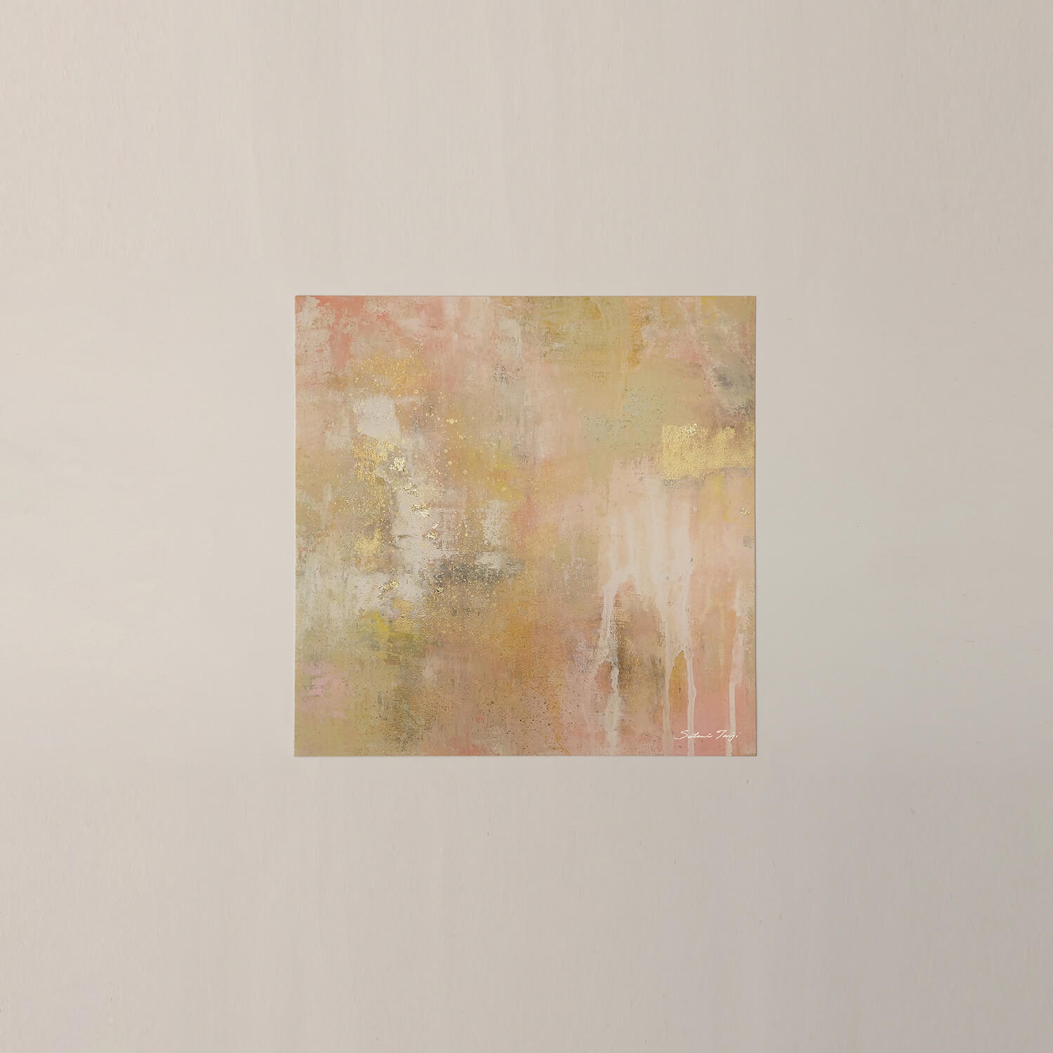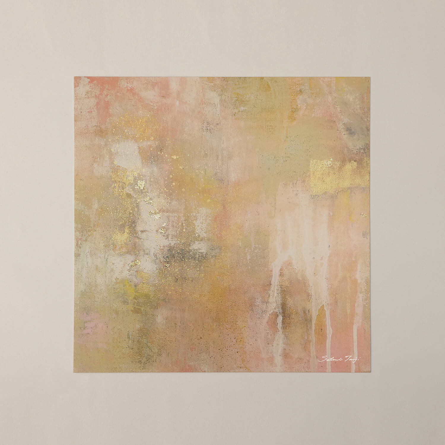 This is an abstract painting by Satomi Tanji, featuring a striking foil that evokes a sense of light, painted on a rough texture that exudes a vintage feel.