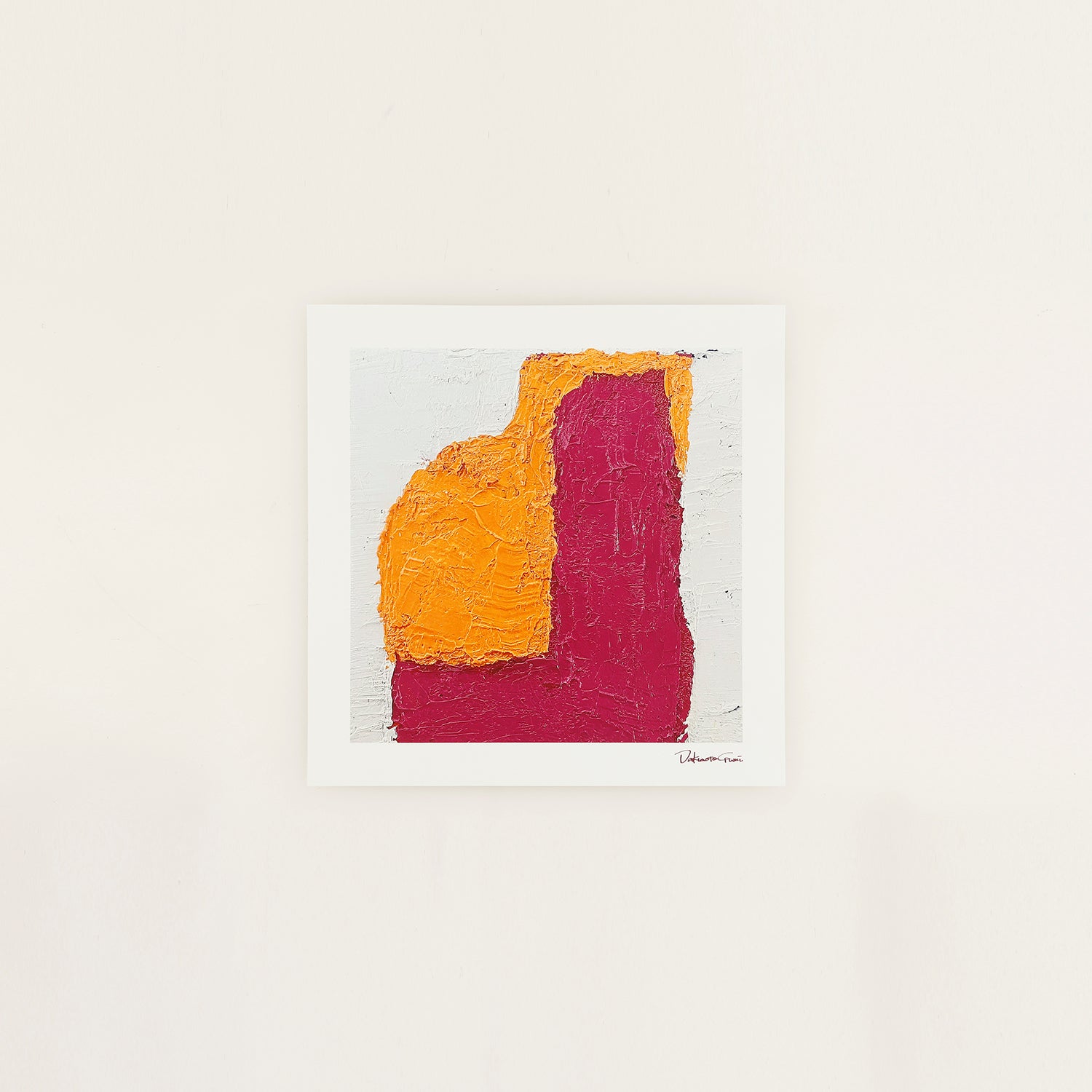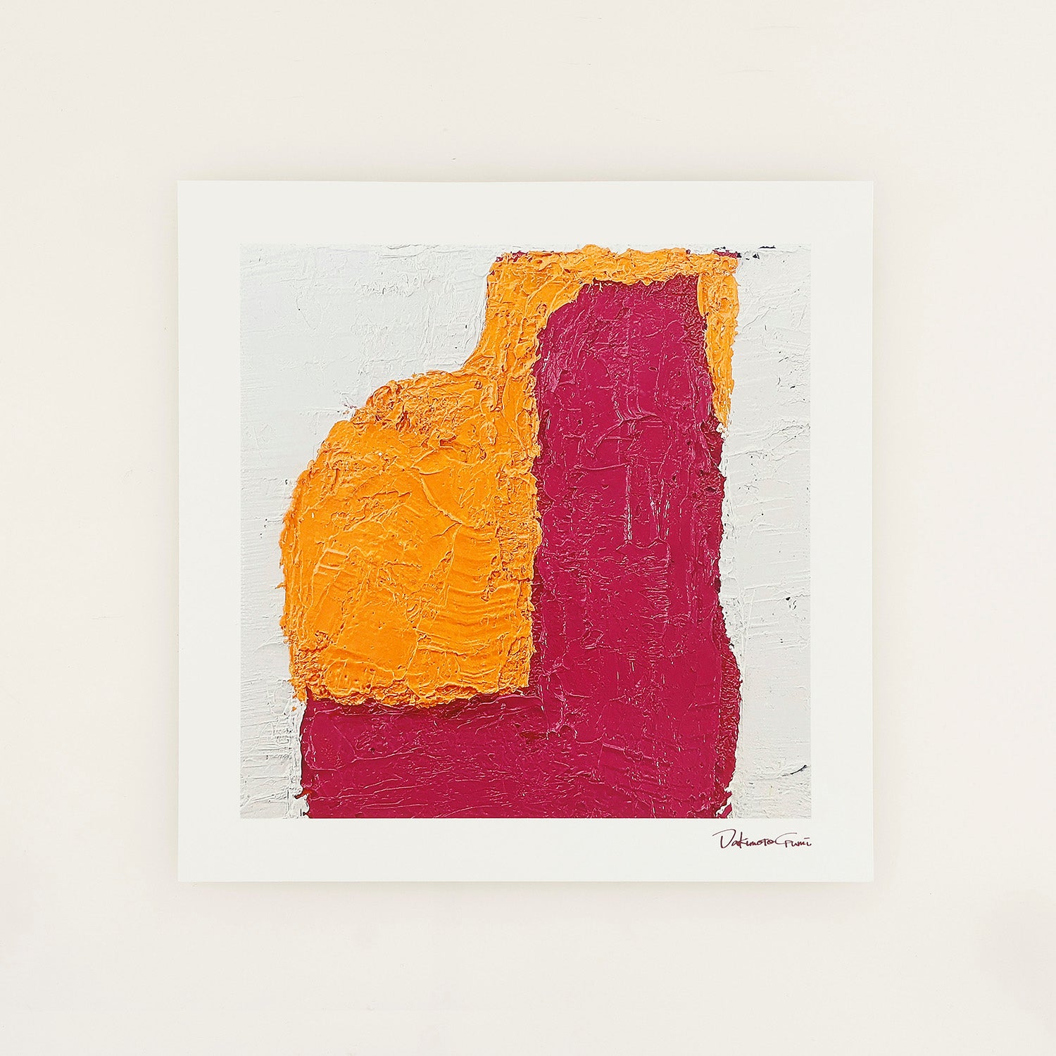 The composition powerfully juxtaposes vibrant magenta and orange. The thick texture of the paint stands out, evoking a sense of expansion like the resonance of sound. The white background absorbs the strong colors, bringing both tension and stability to the image. This work by Yumi Takimoto is a piece that evokes a sense of rhythm and overlapping within the simple contrast of shapes and colors.