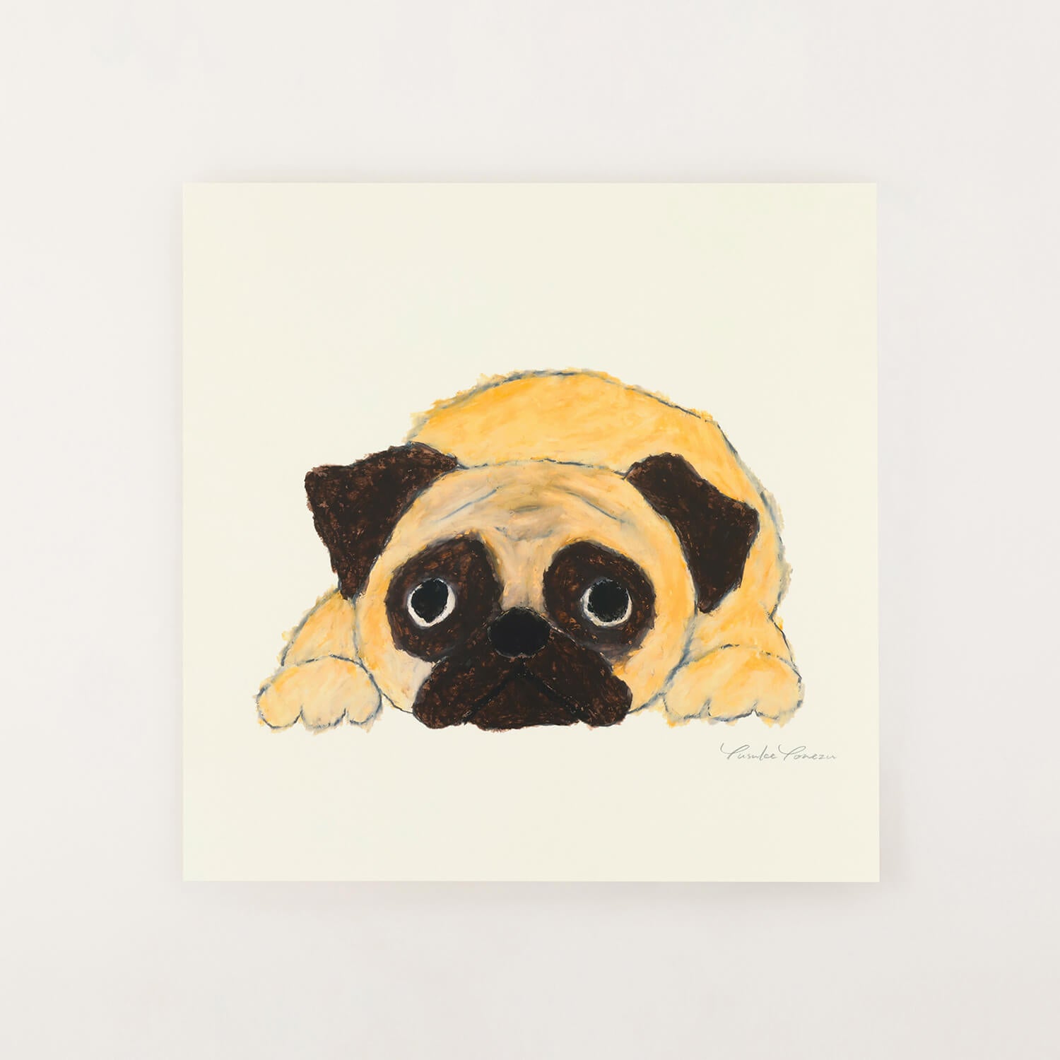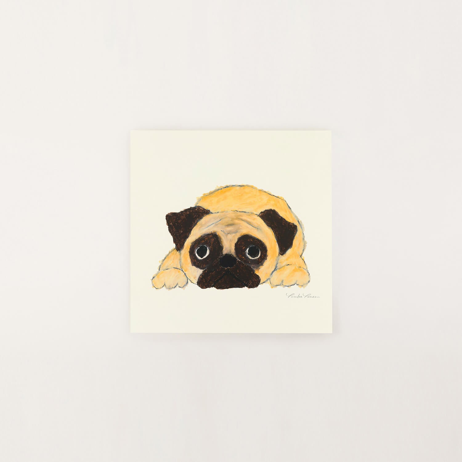 A pug, lying down and gazing at you. Its large eyes hold a melancholic yet endearing expression. Known for its short nose, wrinkled face, and stocky build, the pug has long been called "the dog born to be loved." Yusuke Yonetsu's soft brushstrokes gently depict the unique charm and innocent gaze of this beloved breed. Just looking at it brings a smile, offering a comforting feeling to your daily life.