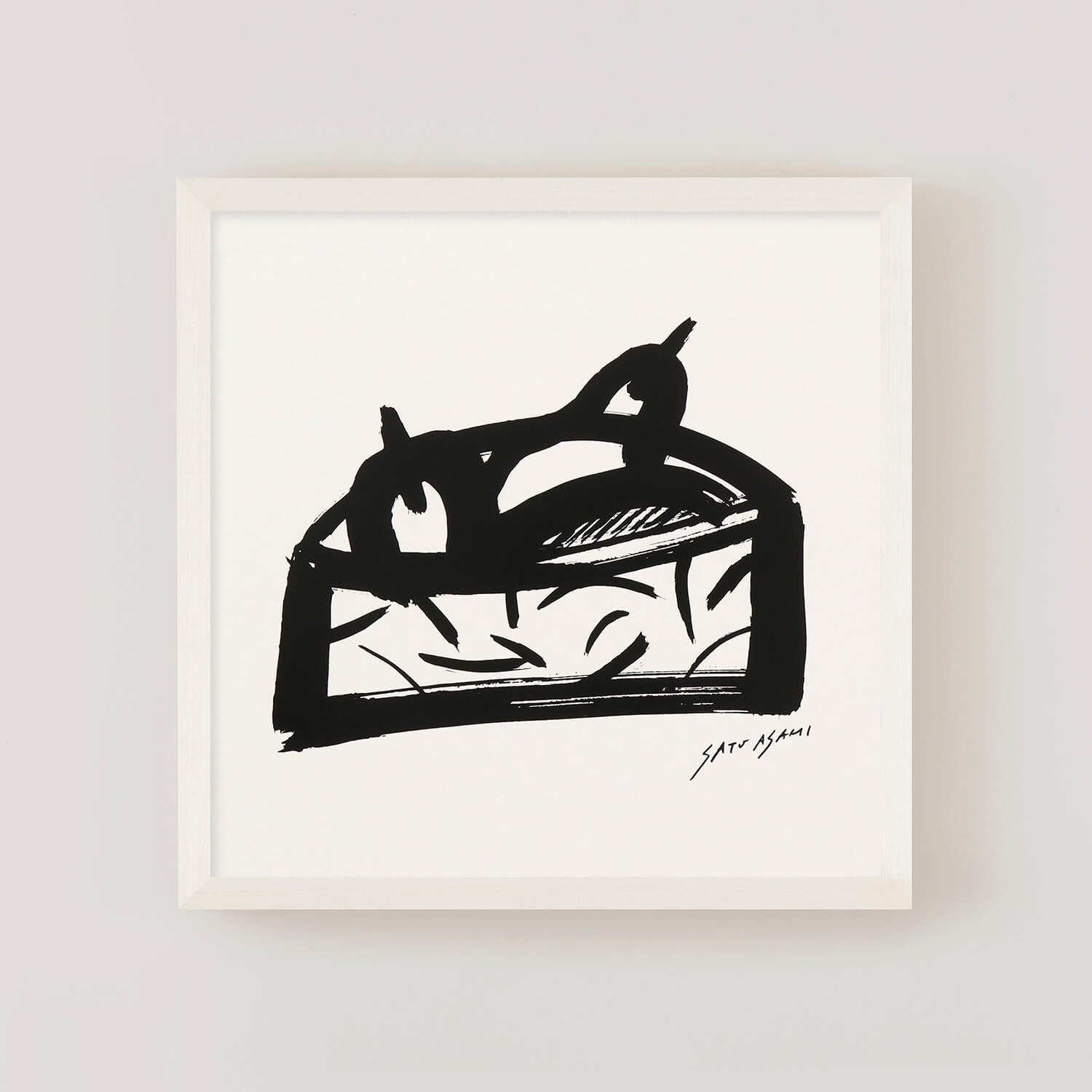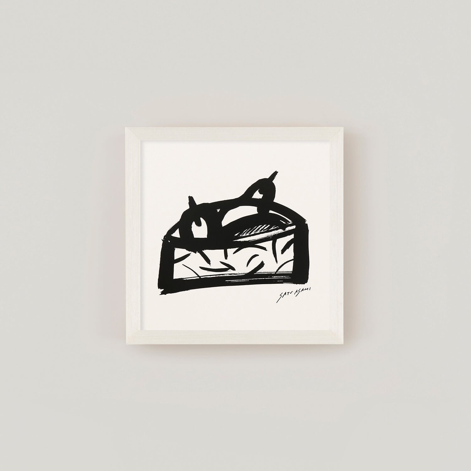 This artwork depicts a low bowl filled with fruit. Despite being a monochrome still life, it avoids being overly simple or overly modern, instead brimming with dynamism. It's a piece by Asami Sato that complements any interior style.