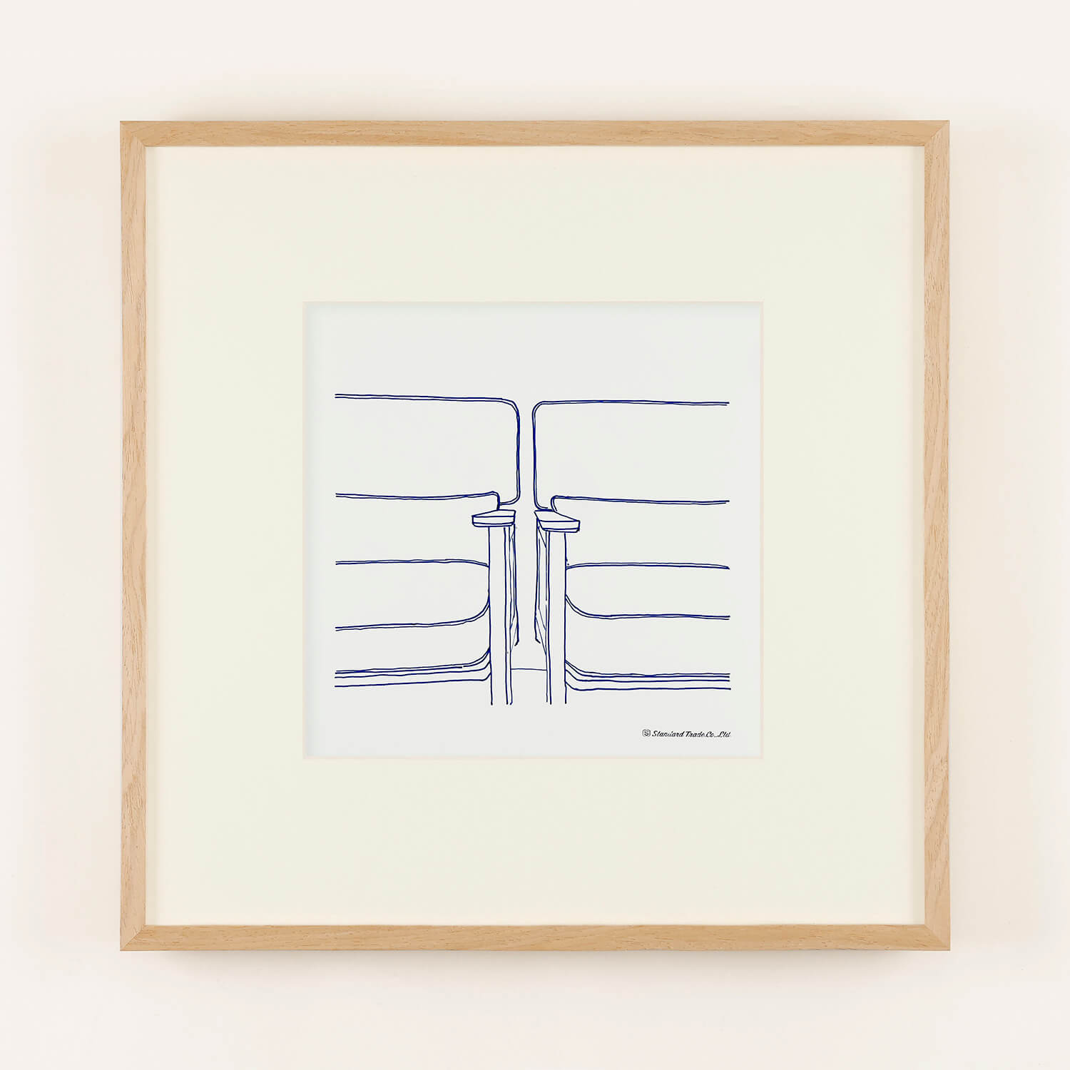 This minimalist line drawing depicts furniture designed by Kenichiro Watanabe himself, rendered solely with his favorite blue pen. It's a piece that reveals the brand's philosophy, beloved by many renowned creators. For the poster print, the ink bleed and smudges from the original artwork have been intentionally retained.