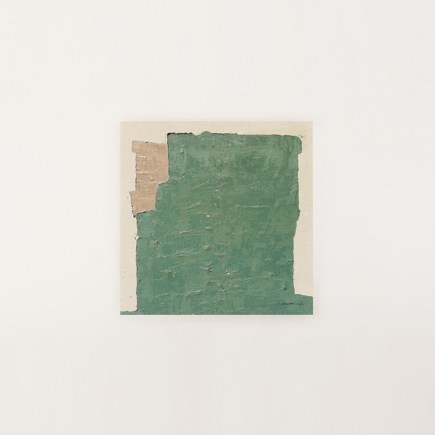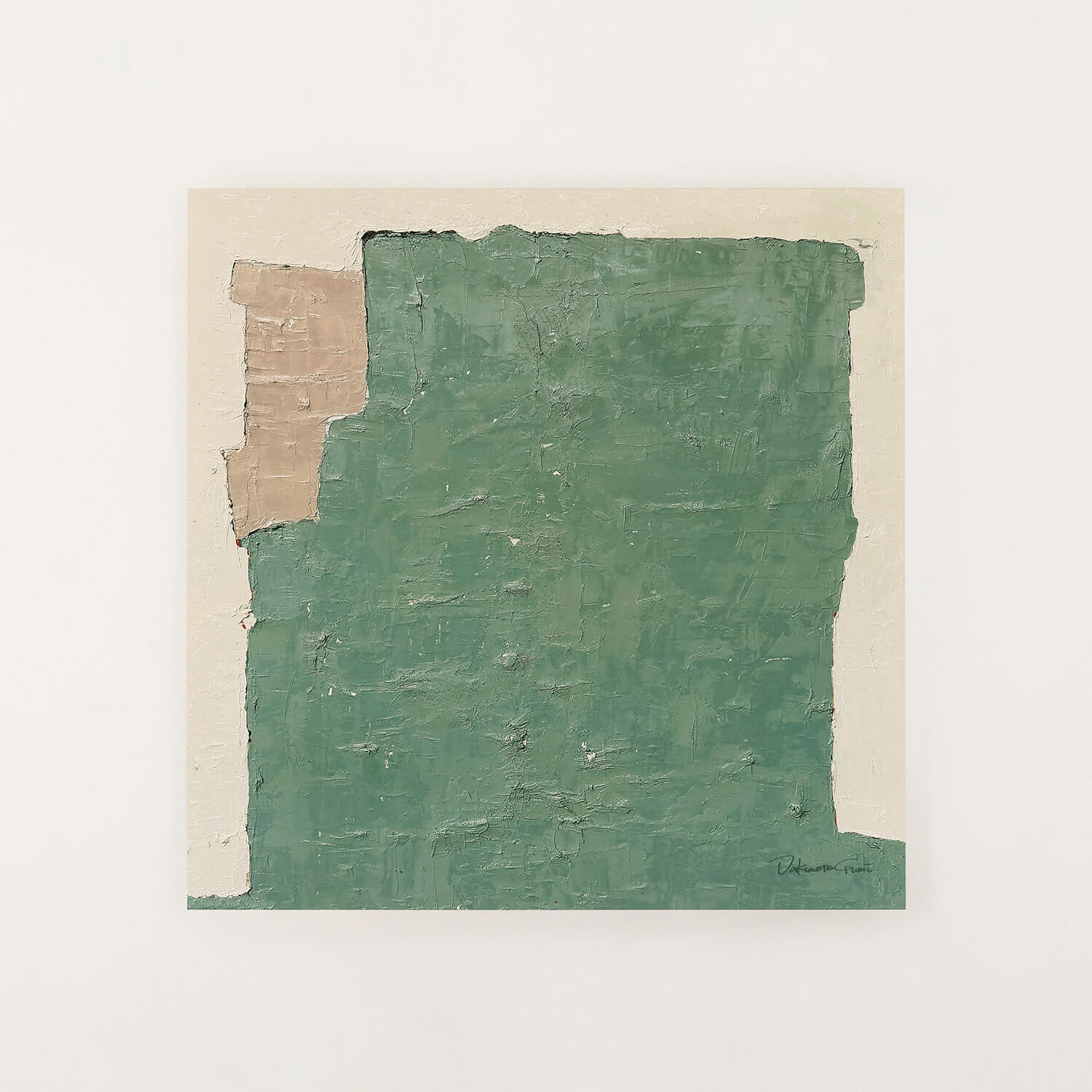 This abstract painting by Yumi Takimoto features a calm green color palette, with layers of paint applied in a rough texture. The composition, which makes effective use of negative space, and the unevenness of the paint application and boundaries, create a powerful presence despite its quiet nature. A touch of beige in the upper left acts as a subtle accent, giving the whole piece a soft balance. As the title "stay" suggests, the artwork evokes a sense of stillness in time and space for the viewer.
