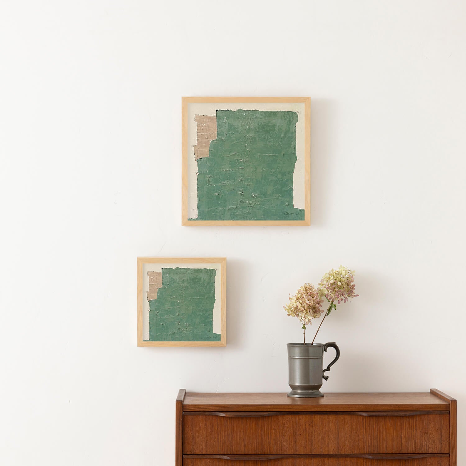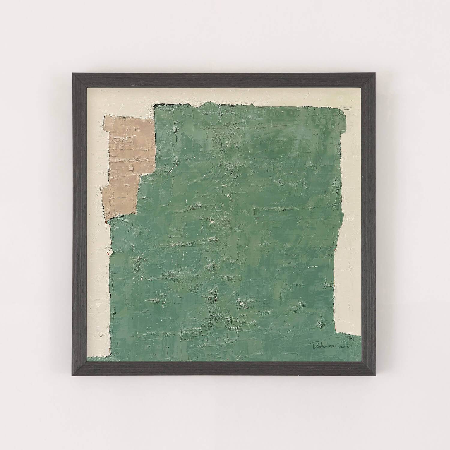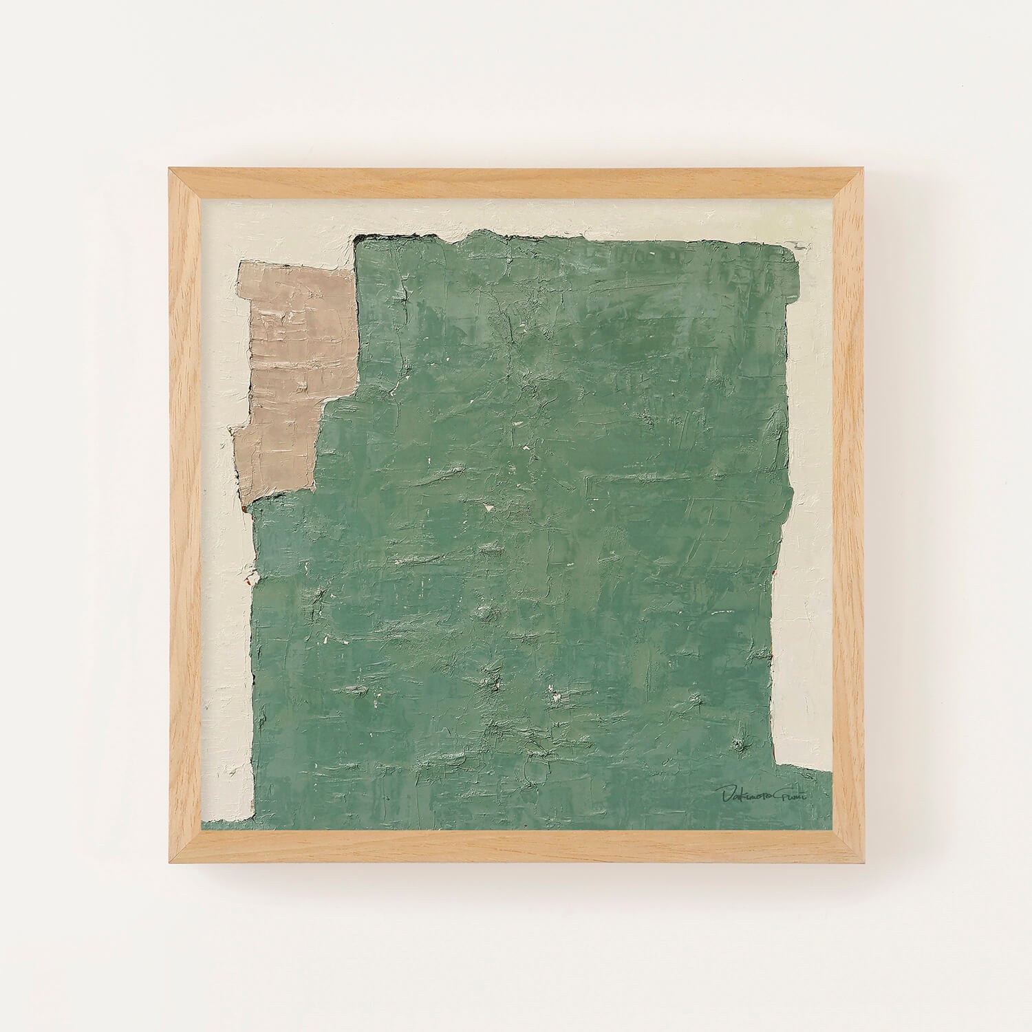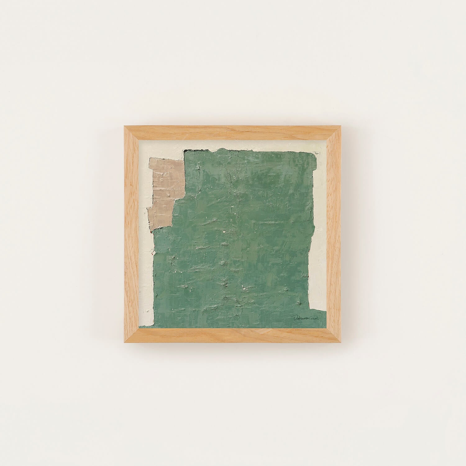 This abstract painting by Yumi Takimoto features a calm green color palette, with layers of paint applied in a rough texture. The composition, which makes effective use of negative space, and the unevenness of the paint application and boundaries, create a powerful presence despite its quiet nature. A touch of beige in the upper left acts as a subtle accent, giving the whole piece a soft balance. As the title "stay" suggests, the artwork evokes a sense of stillness in time and space for the viewer.