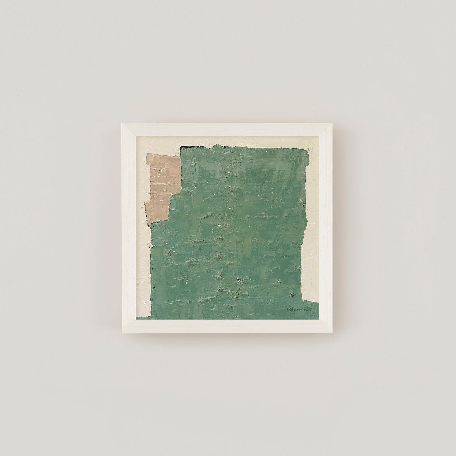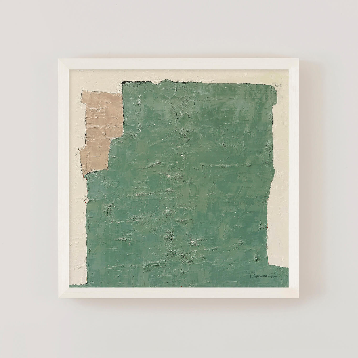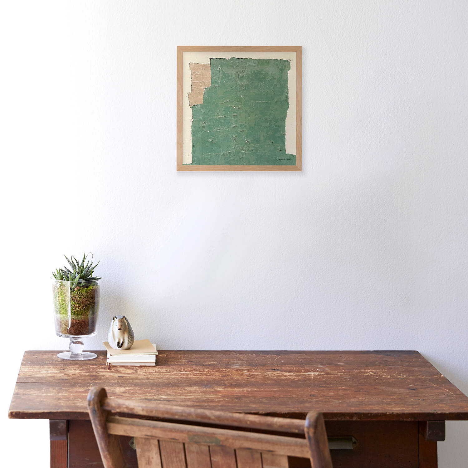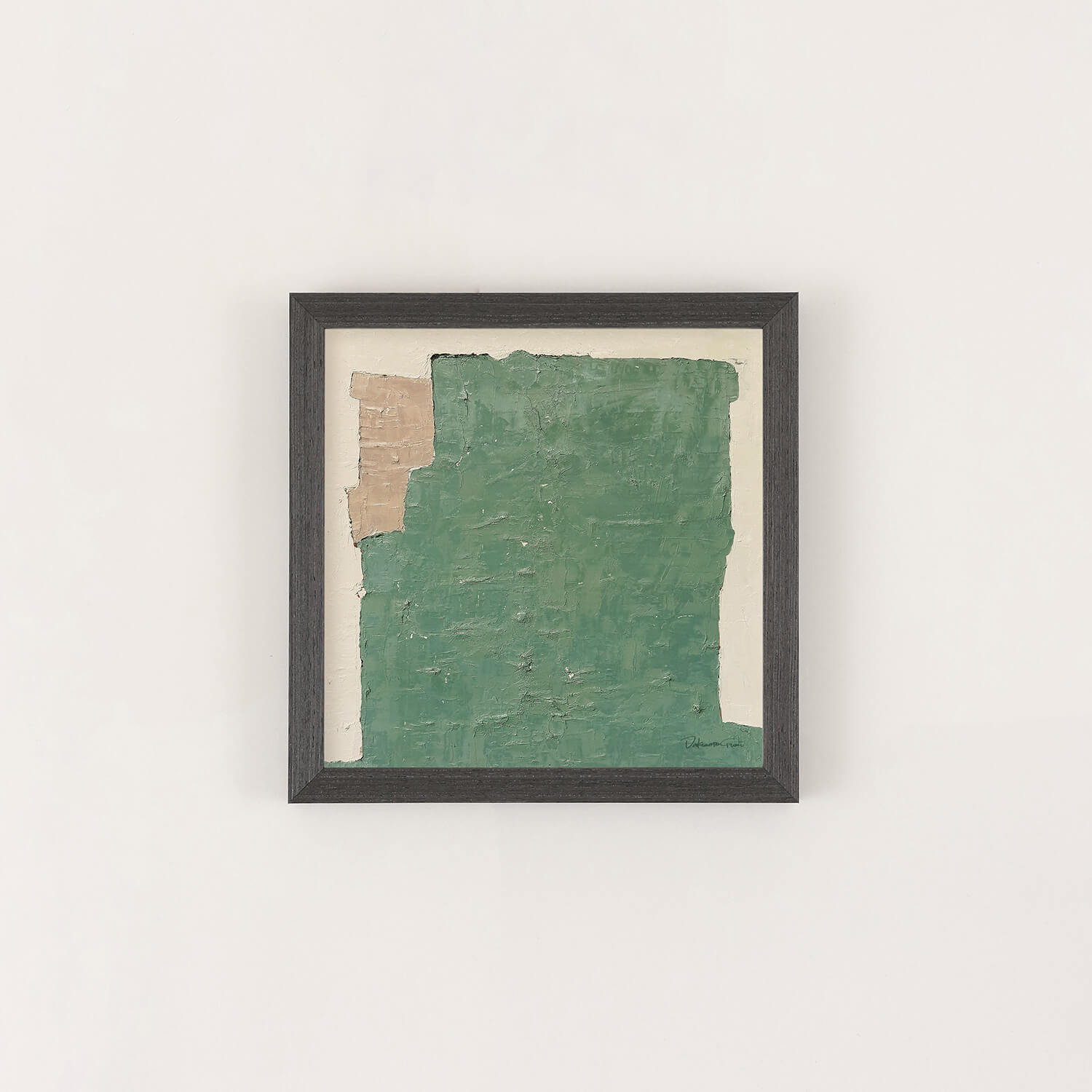 This abstract painting by Yumi Takimoto features a calm green color palette, with layers of paint applied in a rough texture. The composition, which makes effective use of negative space, and the unevenness of the paint application and boundaries, create a powerful presence despite its quiet nature. A touch of beige in the upper left acts as a subtle accent, giving the whole piece a soft balance. As the title "stay" suggests, the artwork evokes a sense of stillness in time and space for the viewer.