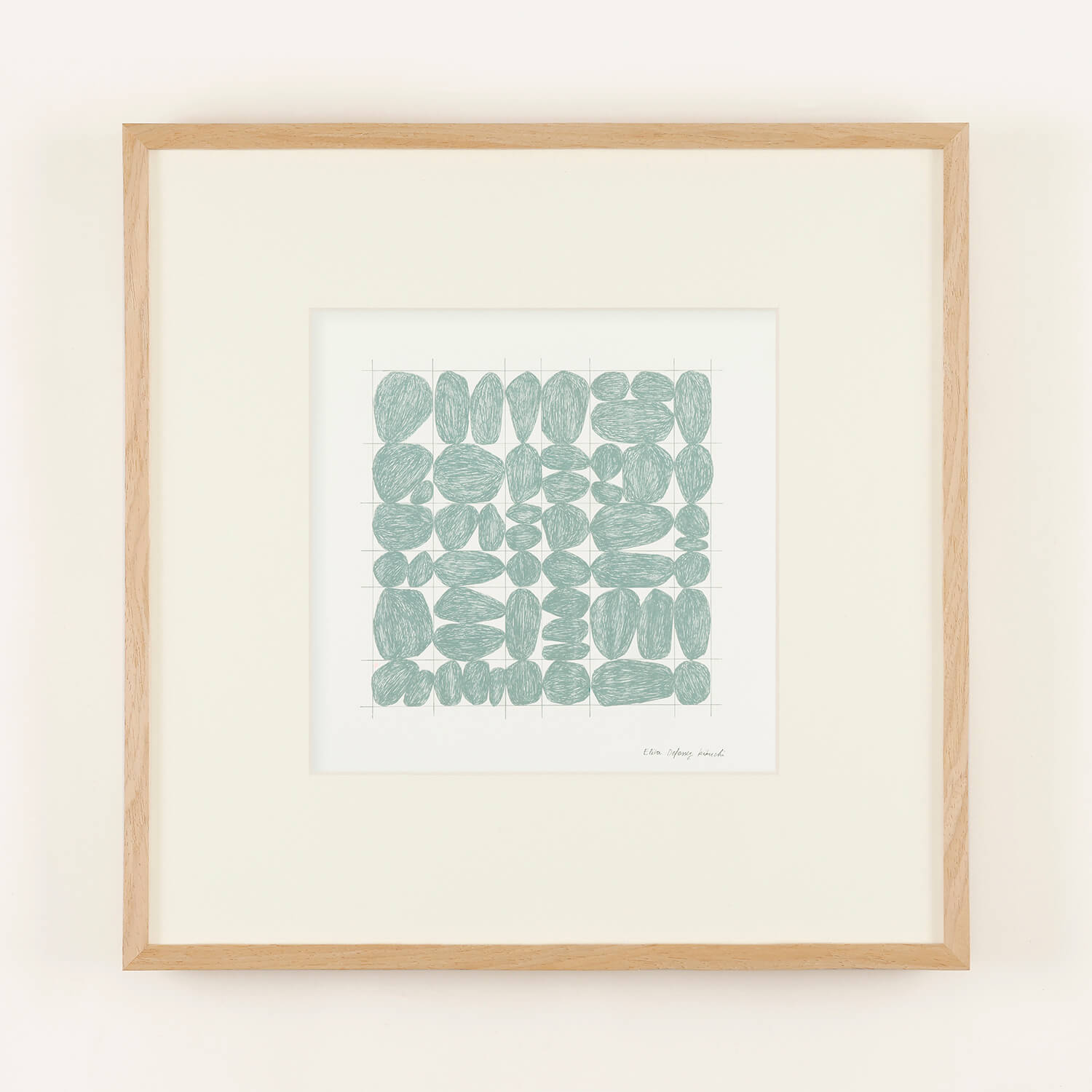 This work features stones of various sizes and shapes as its motif. The way the stones, drawn as lines, fit neatly within the grid evokes a sense of mathematical beauty. It is a work by Elizabete Defosse Kikuchi.
