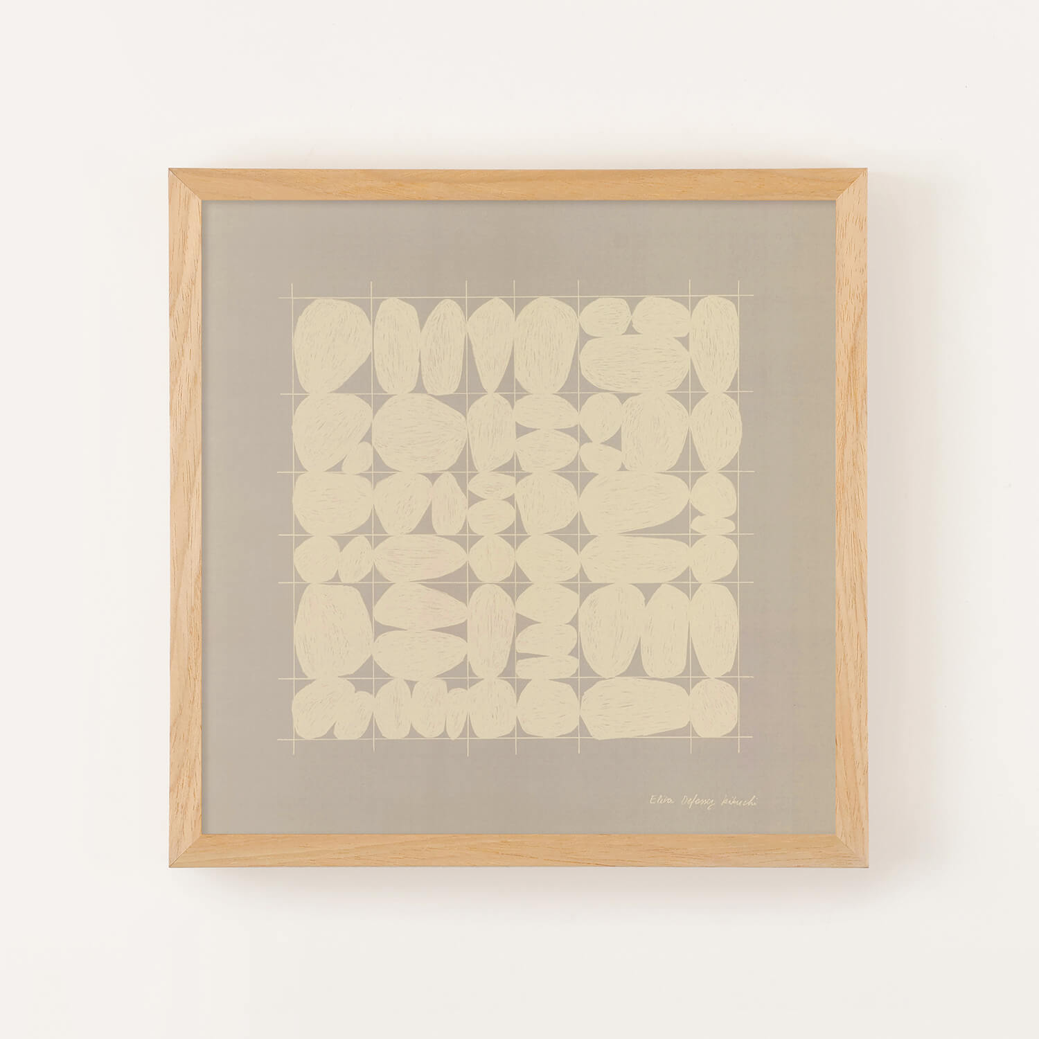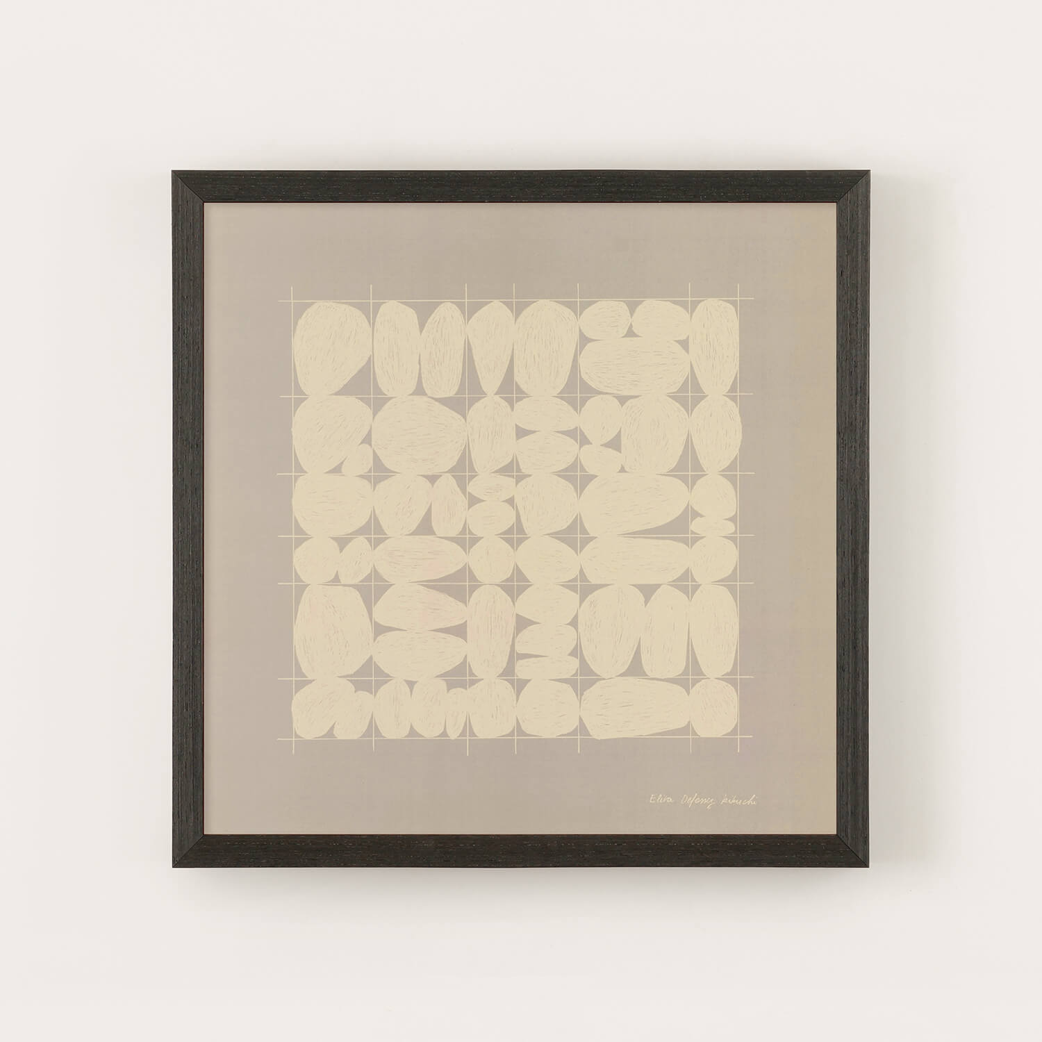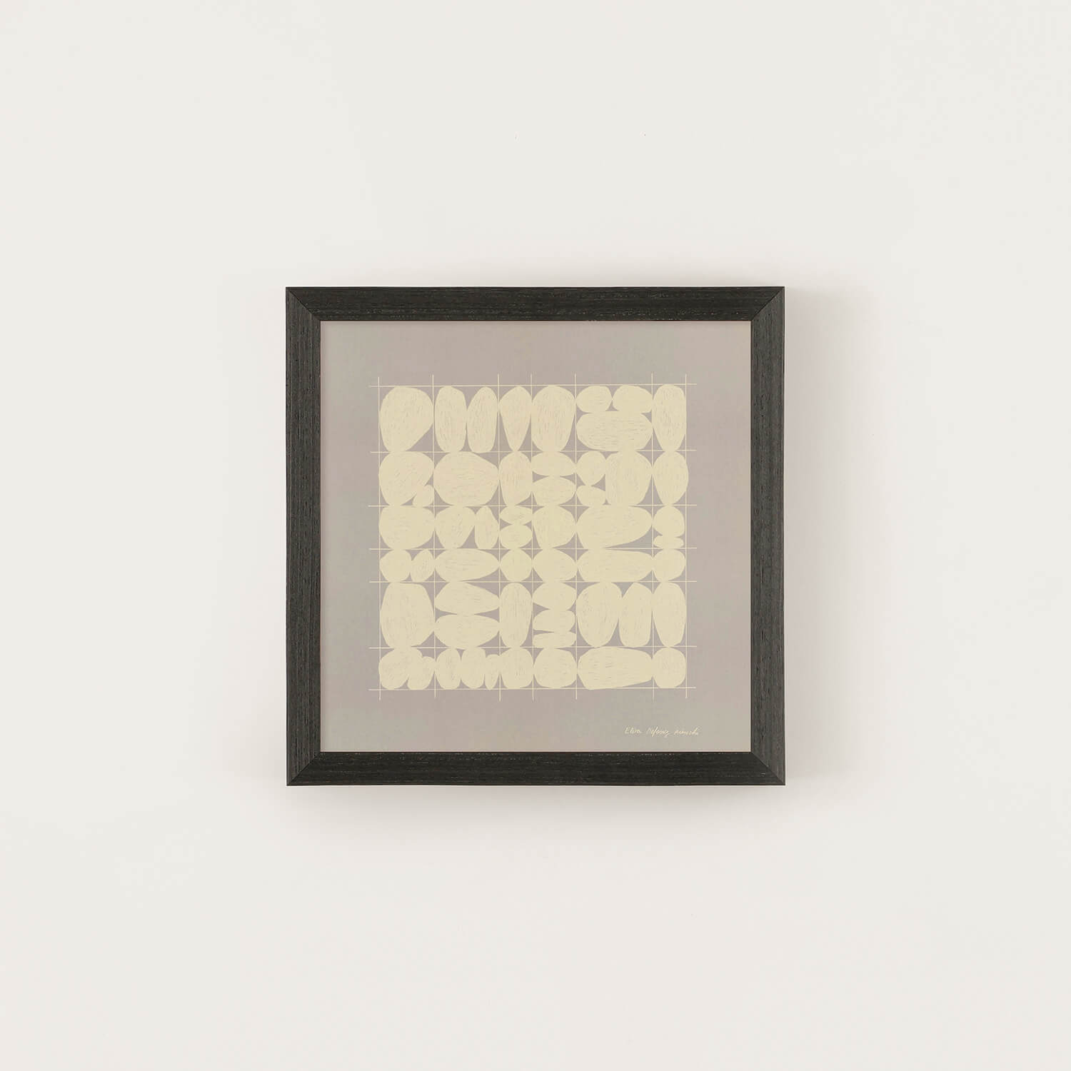 This work features stones of various sizes and shapes as its motif. The way the stones, drawn as lines, fit neatly within the grid evokes a sense of mathematical beauty. It is a work by Elizabete Defosse Kikuchi.