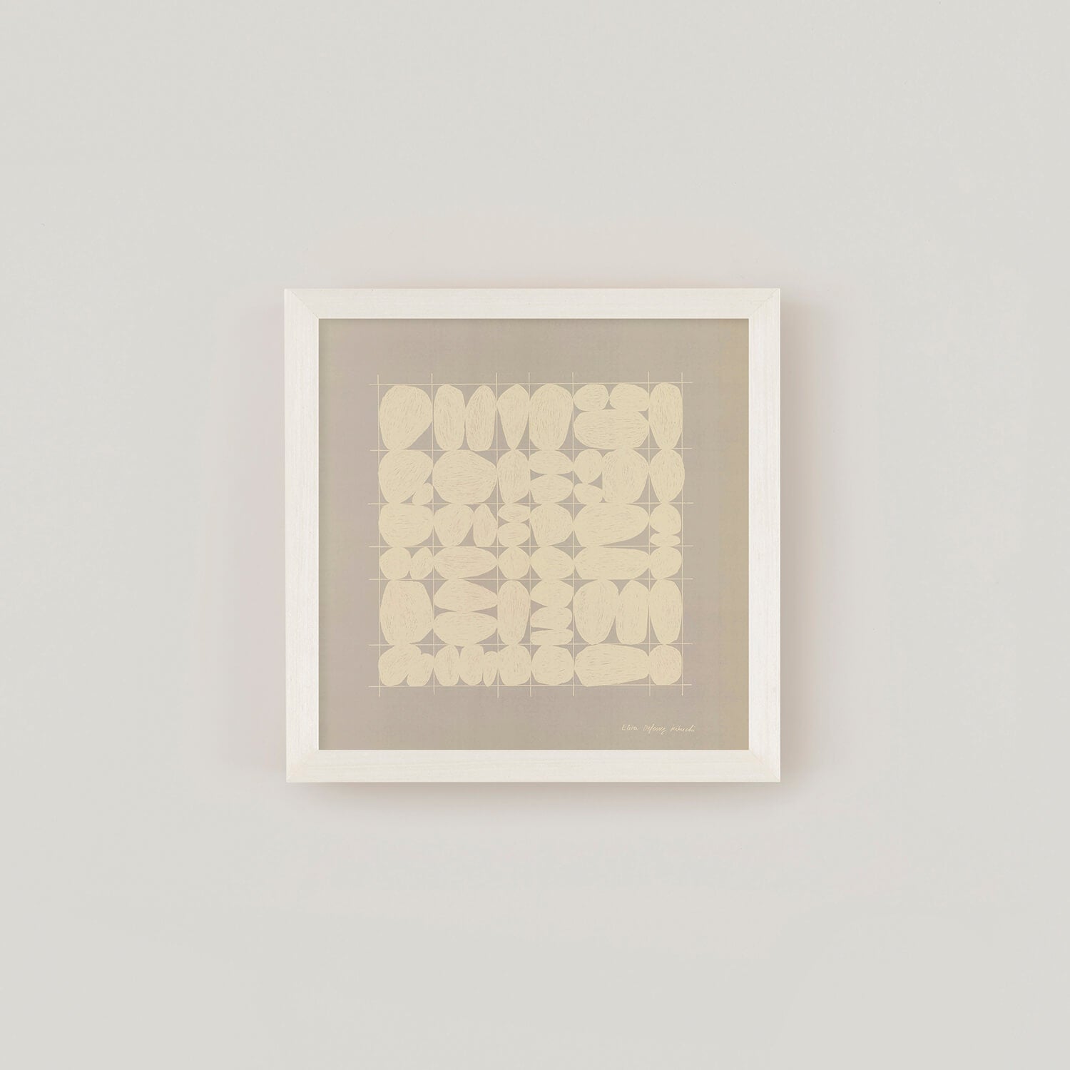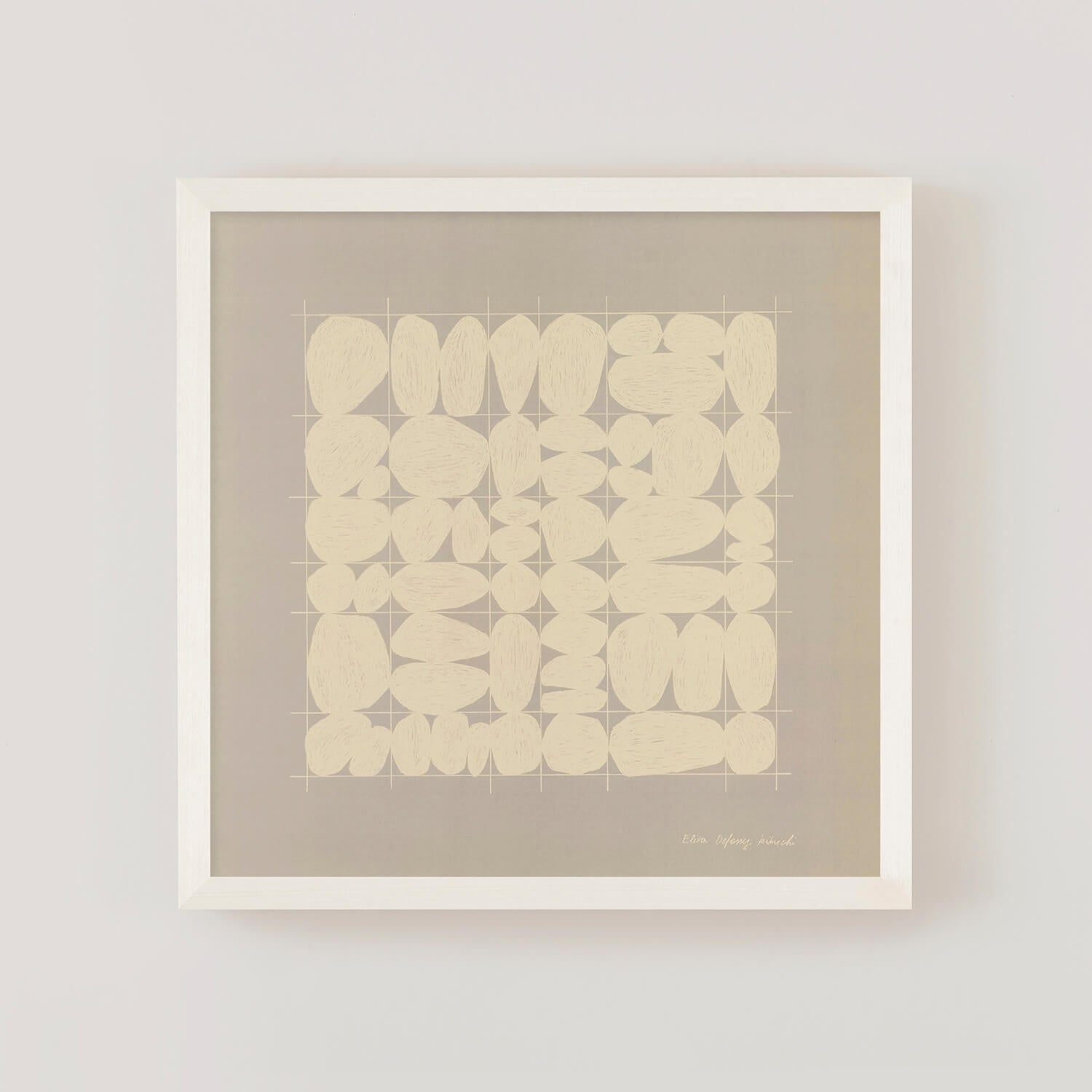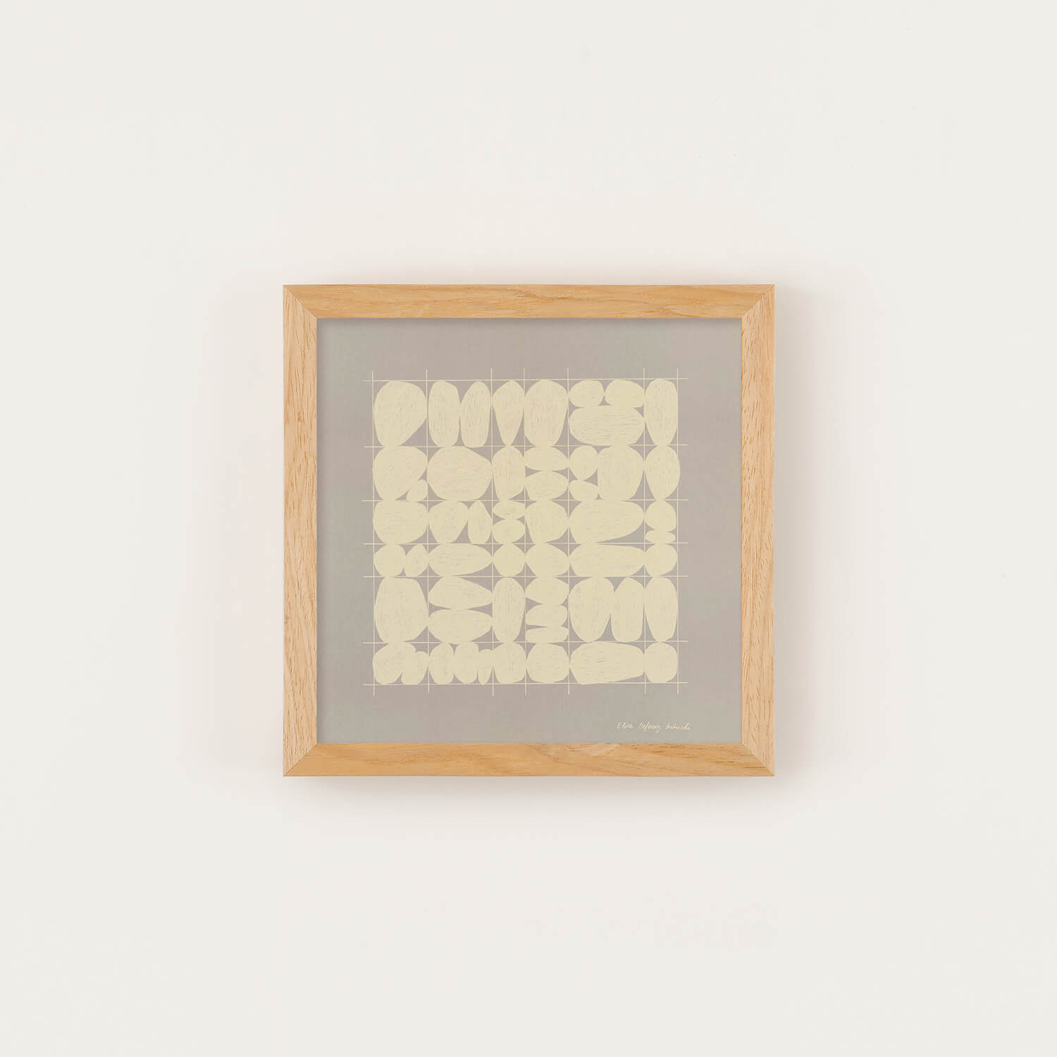 This work features stones of various sizes and shapes as its motif. The way the stones, drawn as lines, fit neatly within the grid evokes a sense of mathematical beauty. It is a work by Elizabete Defosse Kikuchi.