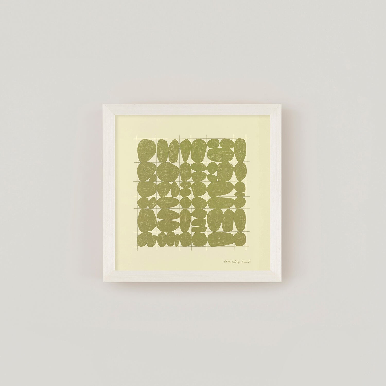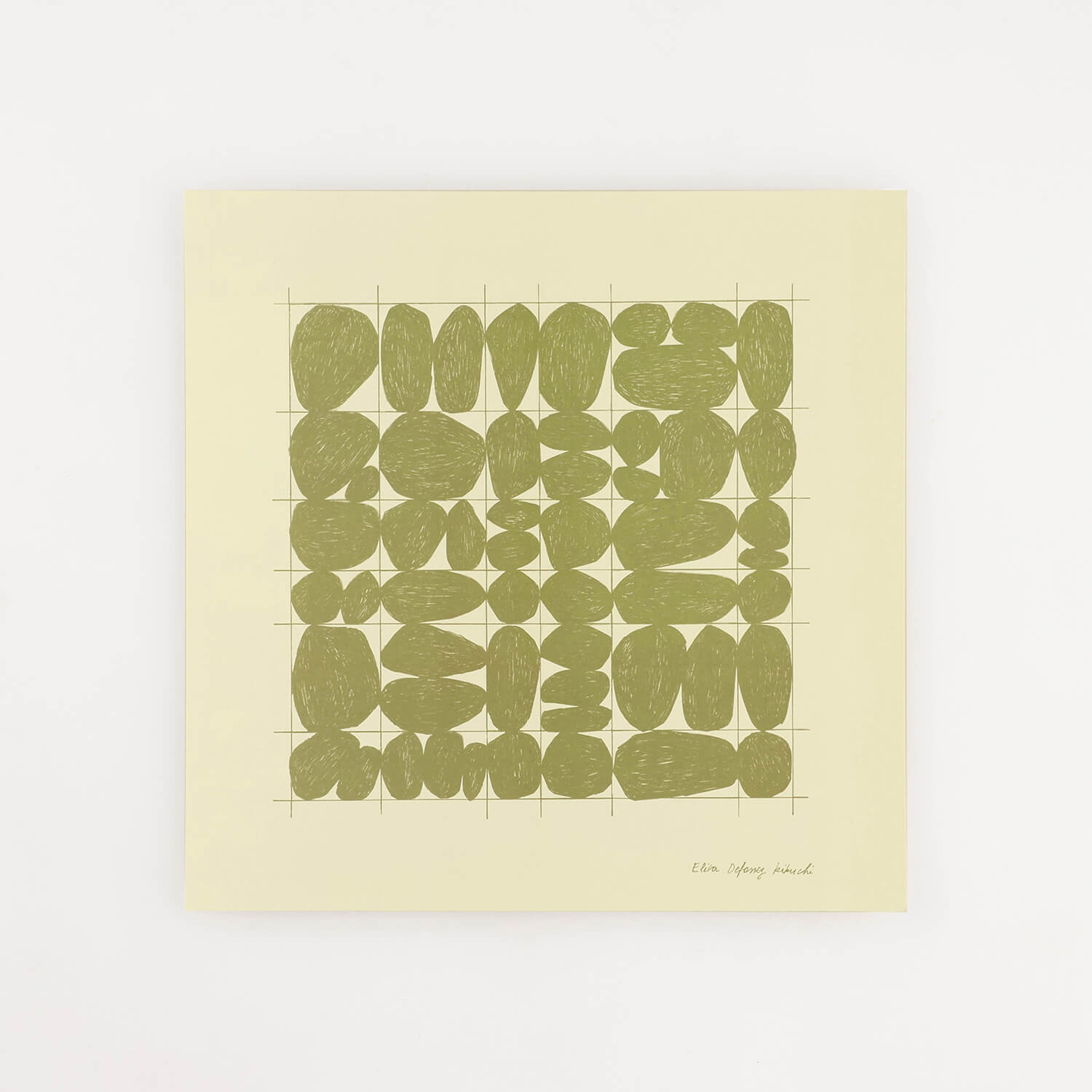 This work features stones of various sizes and shapes as its motif. The way the stones, drawn as lines, fit neatly within the grid evokes a sense of mathematical beauty. It is a work by Elizabete Defosse Kikuchi.
