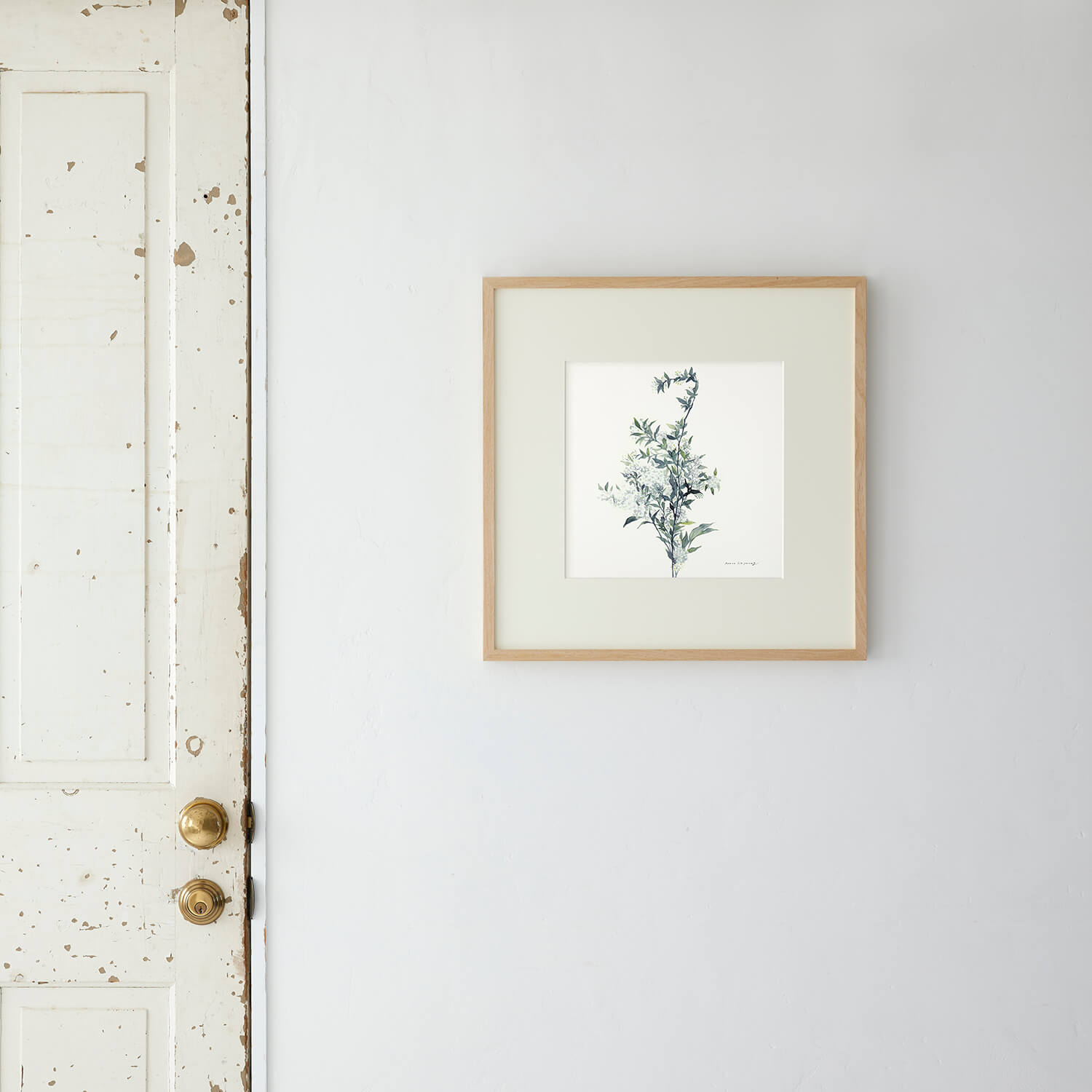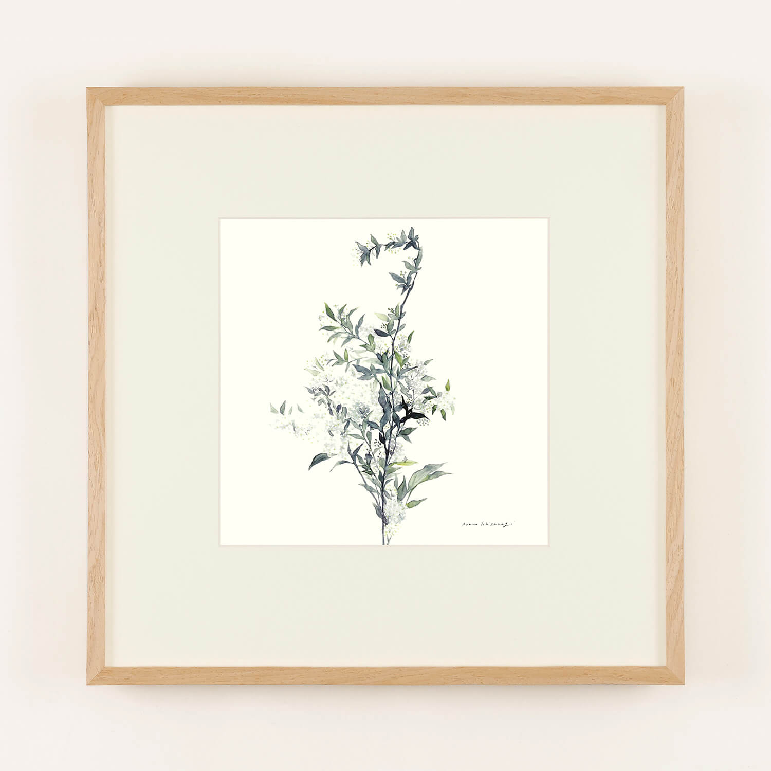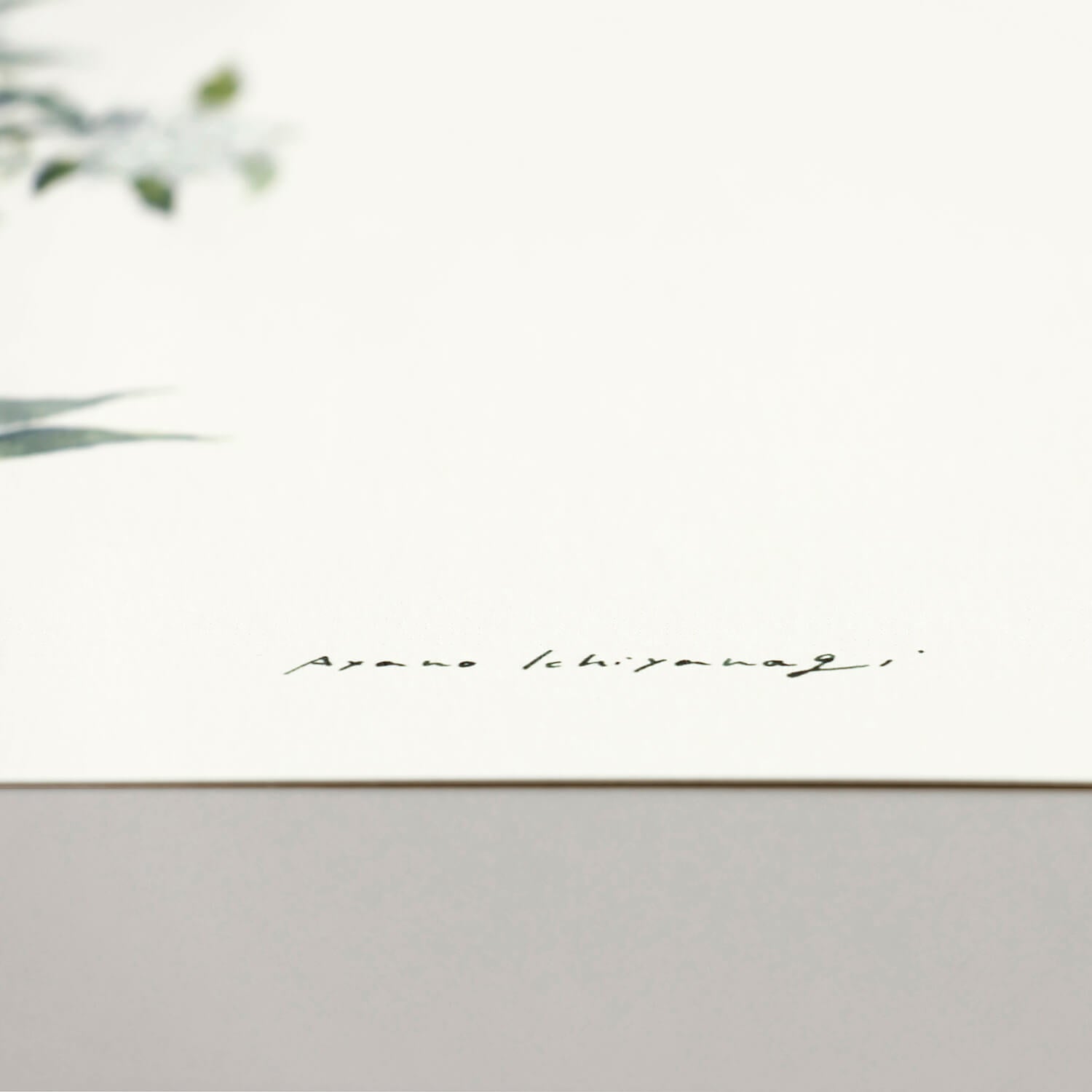 This artwork depicts a swag, a wall decoration made by tying together flowers and leaves. The subdued colors and slightly left-aligned layout give a sophisticated impression to the viewer. It is a work by Ayano Ichinagi, in which stylish composition and brushstrokes are exquisitely harmonized.