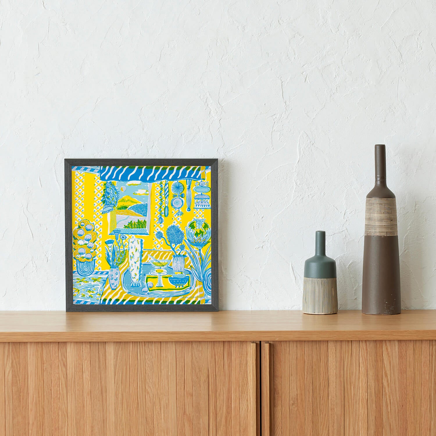 This piece depicts a blissful moment spent gazing at the lush mountains from a window, with great emotion. It's a work by Carbonated Design Studio, allowing you to fully appreciate the artist's worldview, including unique plants, ornaments, and wallpaper designs.