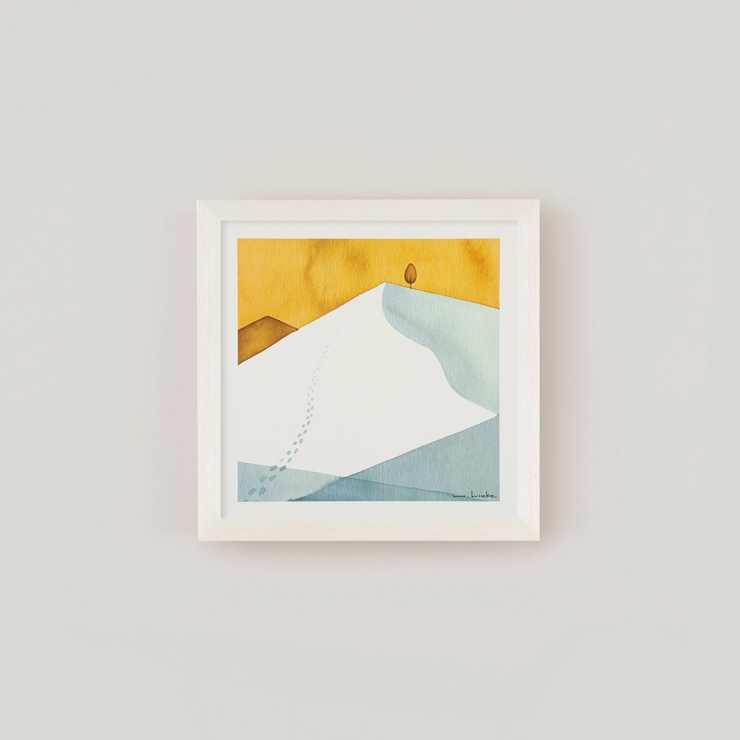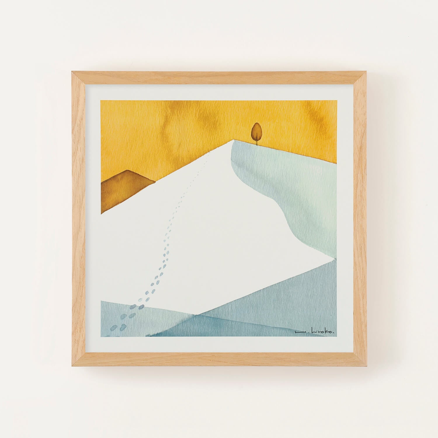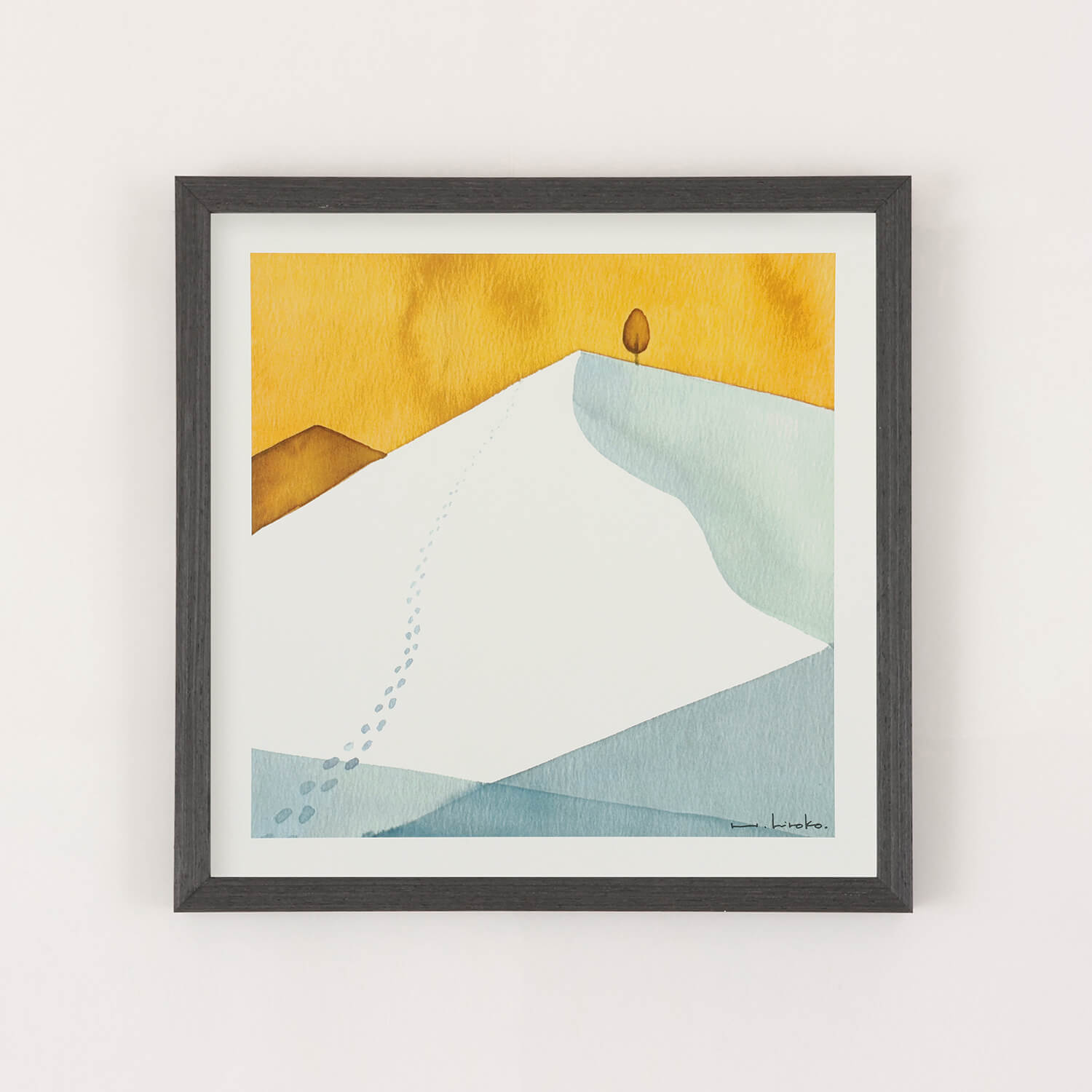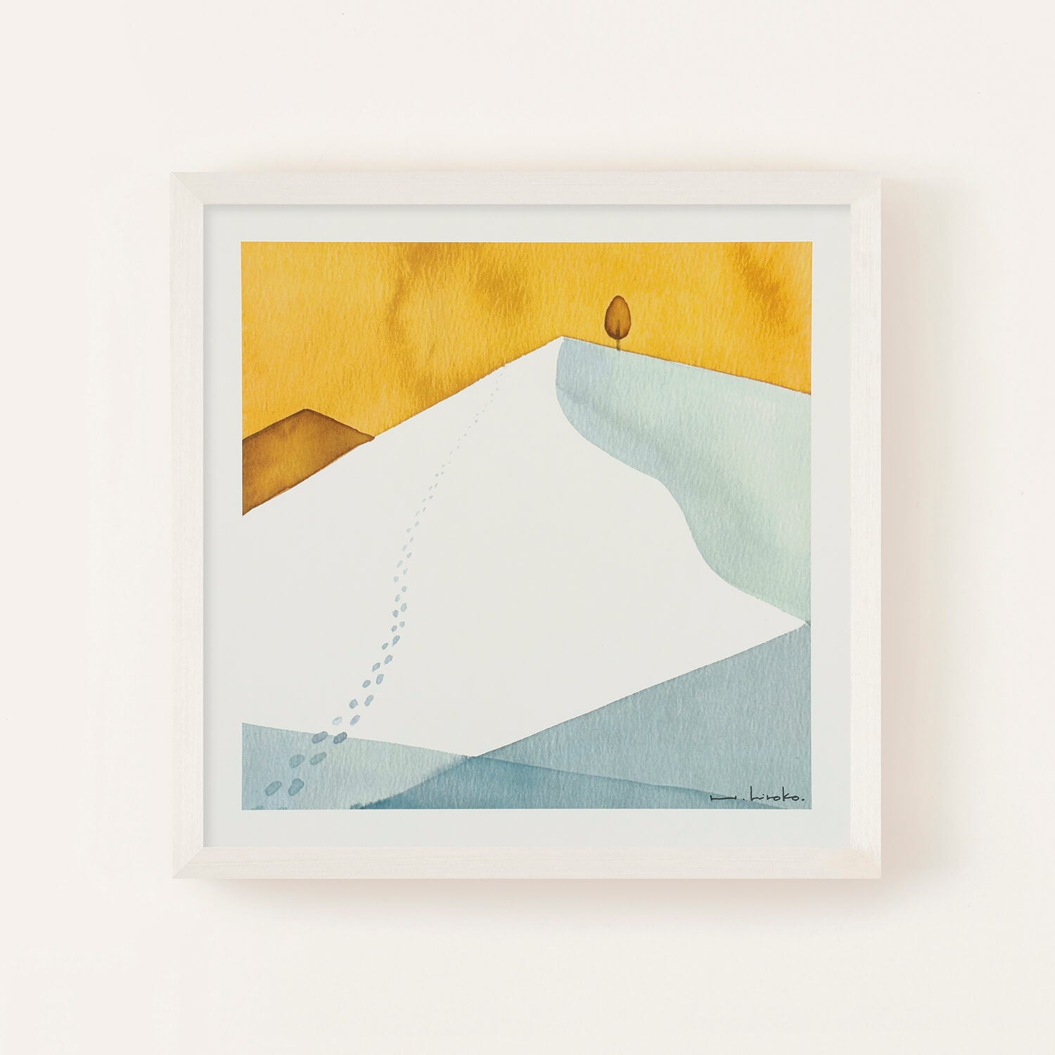 まっさらな斜面に、足あとの列が静かに続きます。たったそれだけの要素なのに、歩いた時間や体温まで想像させるのがハシモトヒロコさんの魅力です。雪面は輪郭をきっぱり決めず、淡い色面を重ねるような筆致で、光のにじみと起伏をそっと描き出しています。足あとは点のリズムで置かれ、紙の白と水分の揺れが溶け合い、冷えた空気まで残る一枚です。