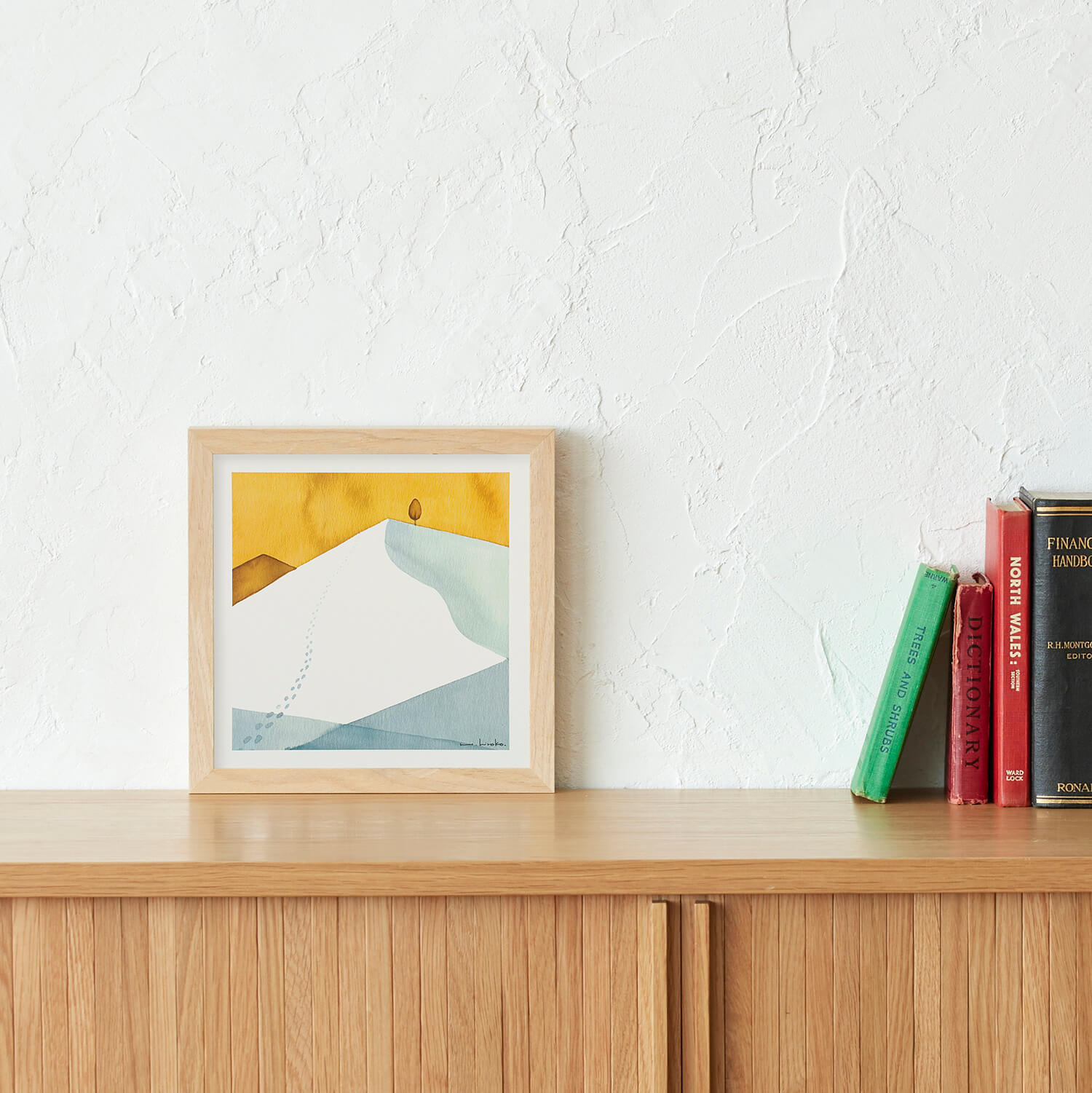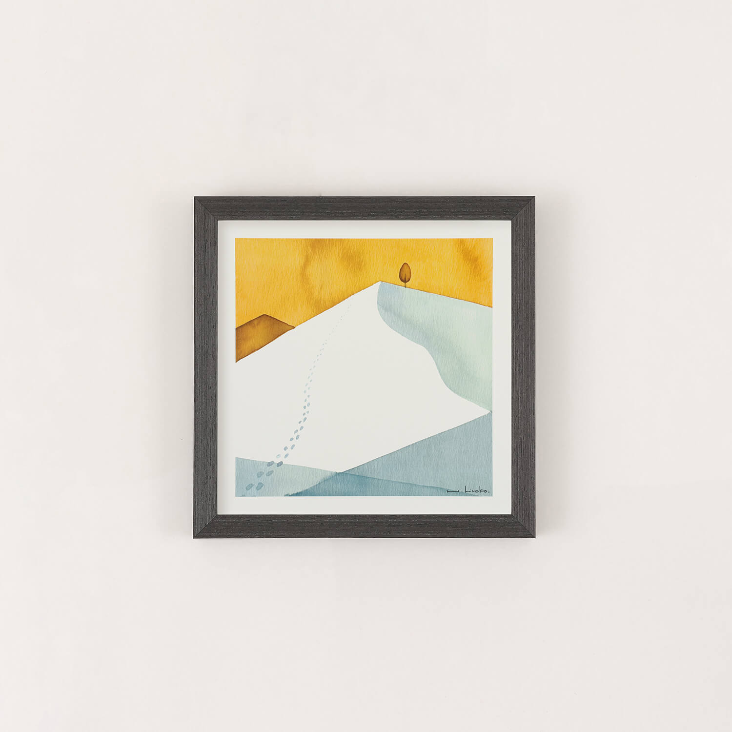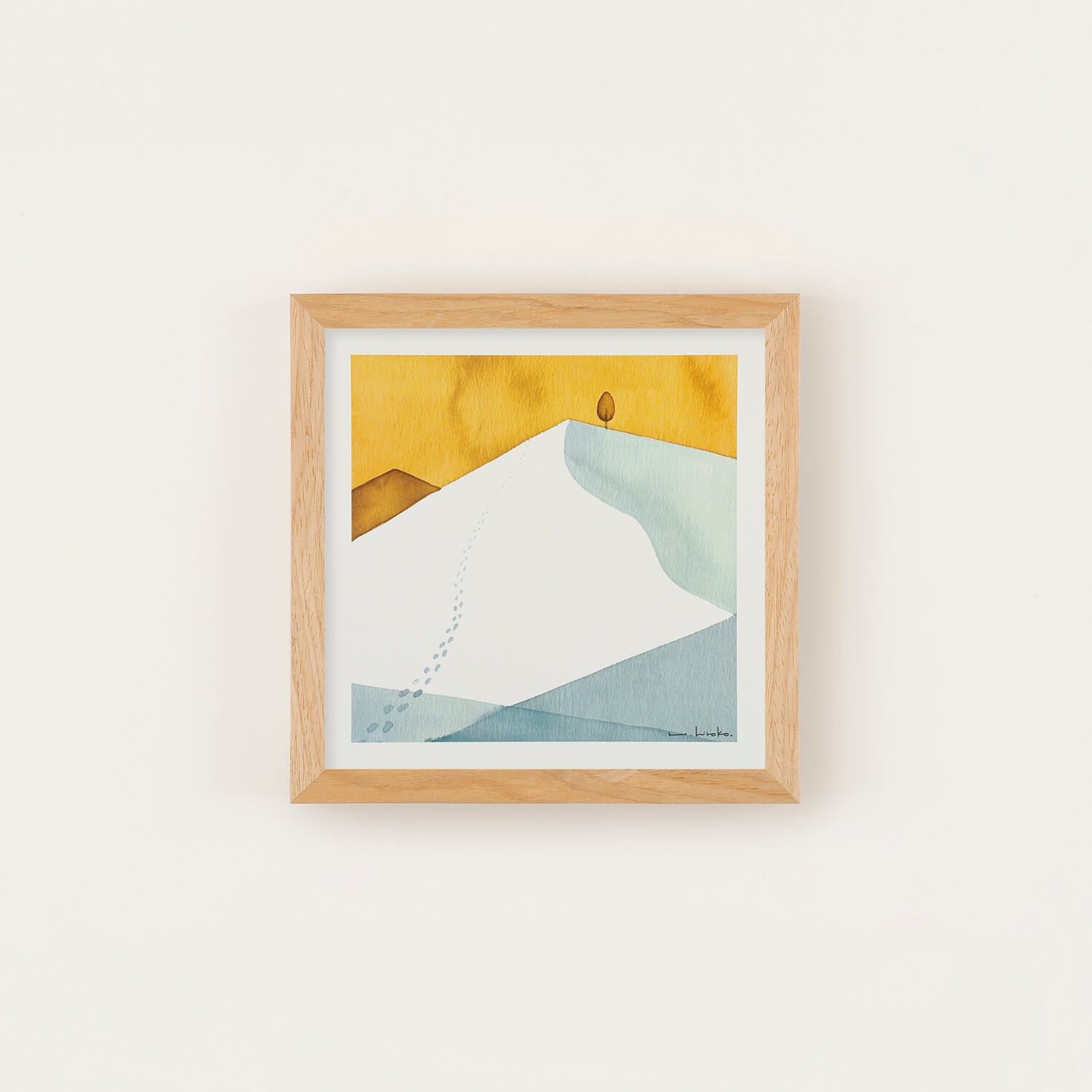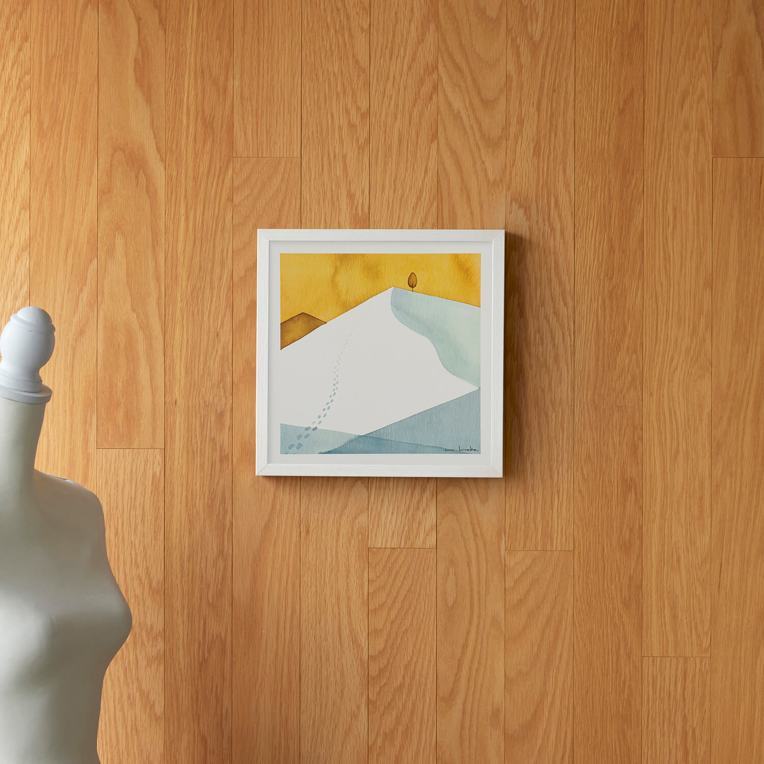 まっさらな斜面に、足あとの列が静かに続きます。たったそれだけの要素なのに、歩いた時間や体温まで想像させるのがハシモトヒロコさんの魅力です。雪面は輪郭をきっぱり決めず、淡い色面を重ねるような筆致で、光のにじみと起伏をそっと描き出しています。足あとは点のリズムで置かれ、紙の白と水分の揺れが溶け合い、冷えた空気まで残る一枚です。