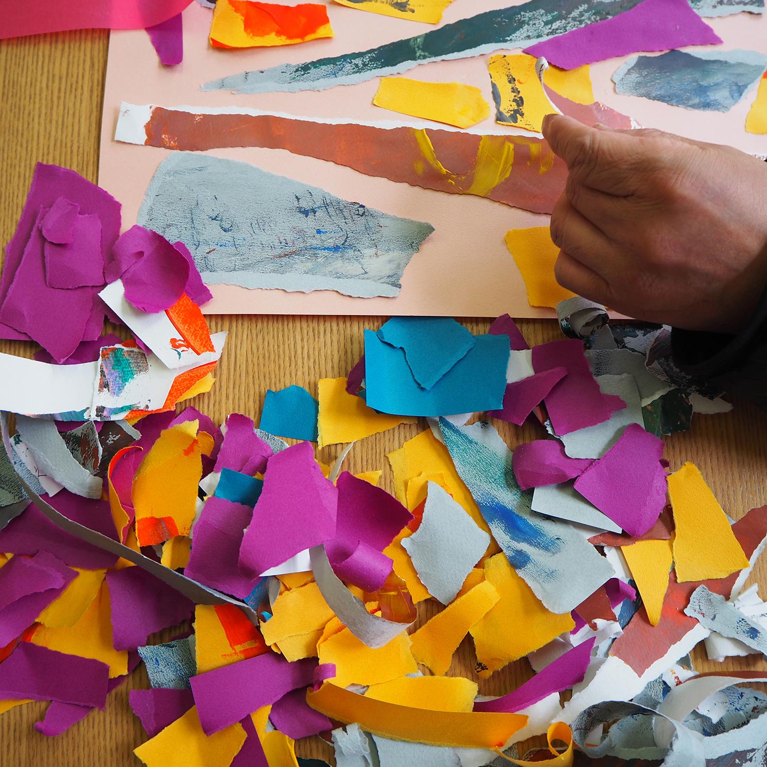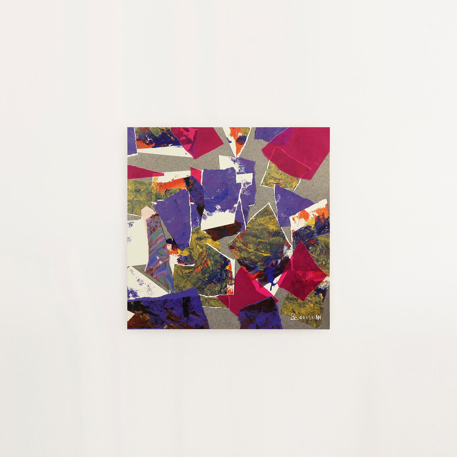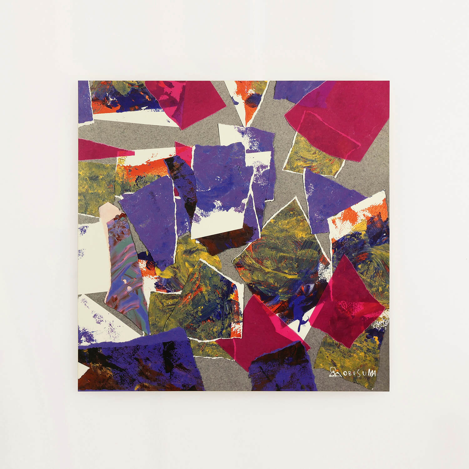 手や筆、木製品づくりの過程で出る端材を使って描いた色鮮やかな絵をさまざまな形に裂き、色台紙の上に思いのままに貼り付けたちぎり絵。河東梨香さんのディレクションにより、OBUSUMA(おぶすま)メンバーである作者たちの、既成概念にとらわれない多様な感性と感覚で制作された作品です。