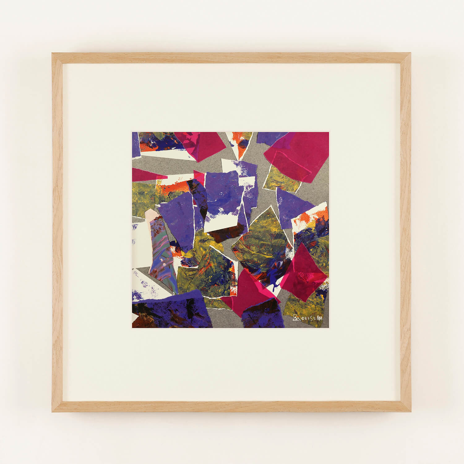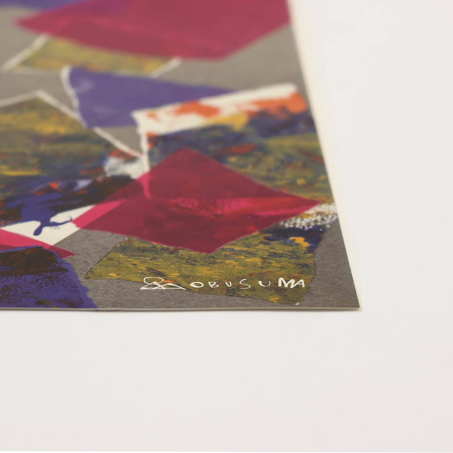 手や筆、木製品づくりの過程で出る端材を使って描いた色鮮やかな絵をさまざまな形に裂き、色台紙の上に思いのままに貼り付けたちぎり絵。河東梨香さんのディレクションにより、OBUSUMA(おぶすま)メンバーである作者たちの、既成概念にとらわれない多様な感性と感覚で制作された作品です。