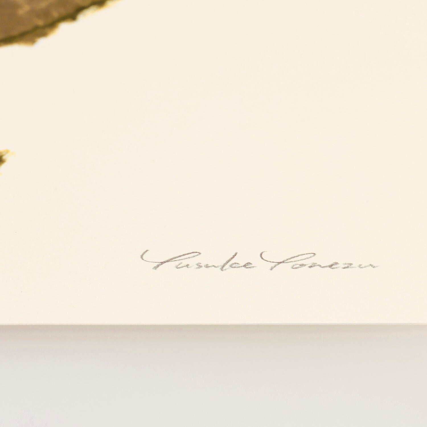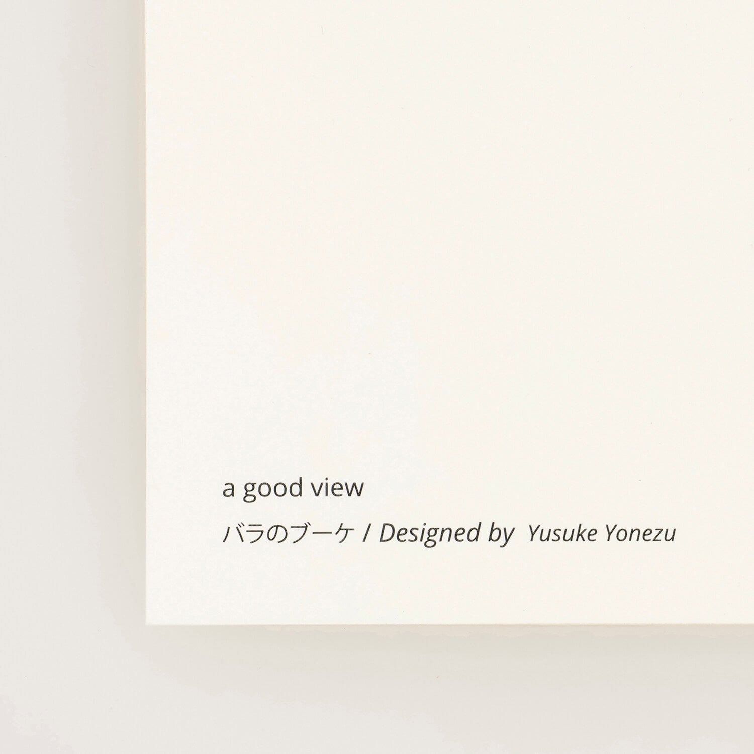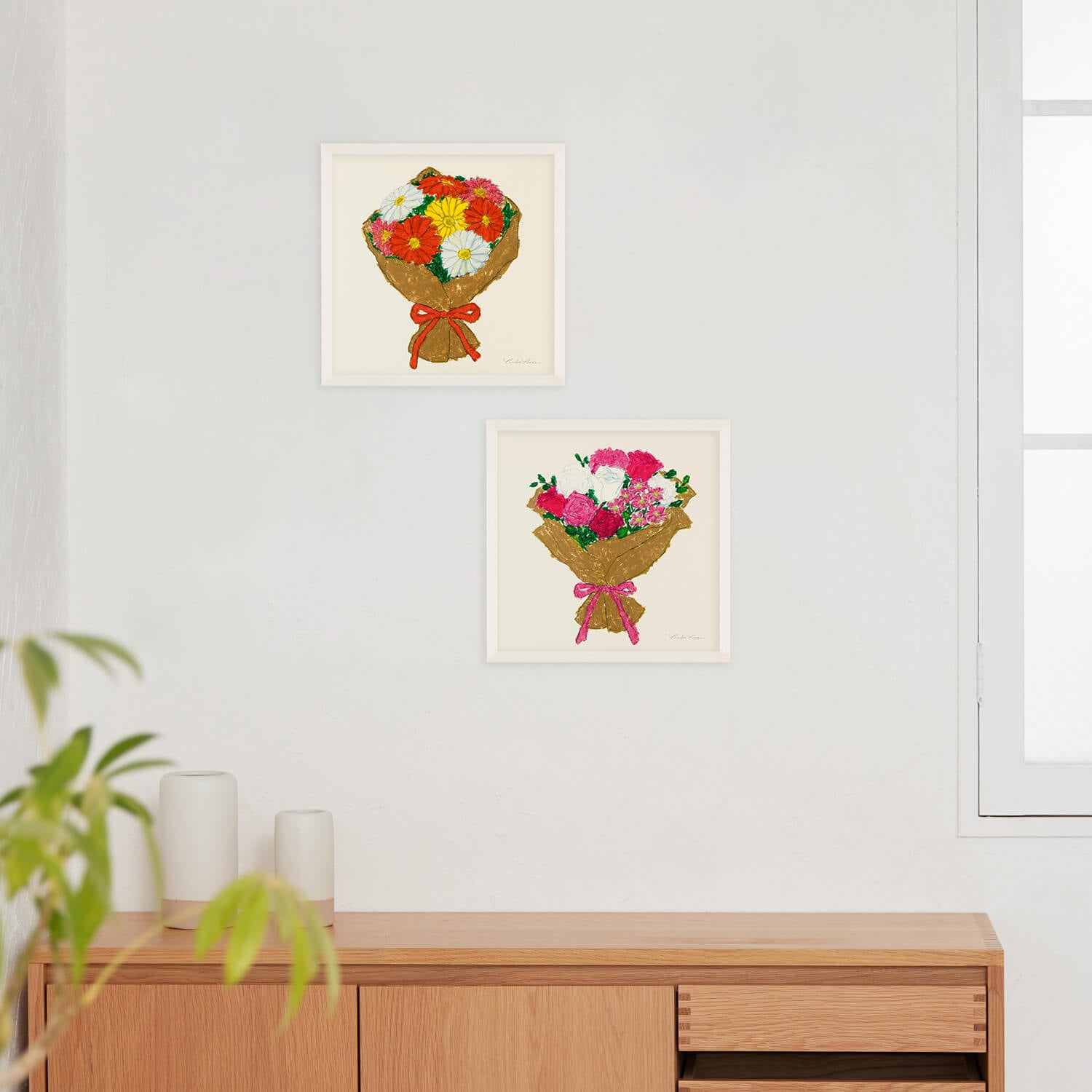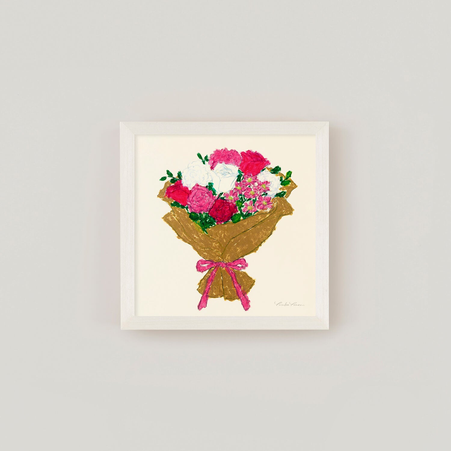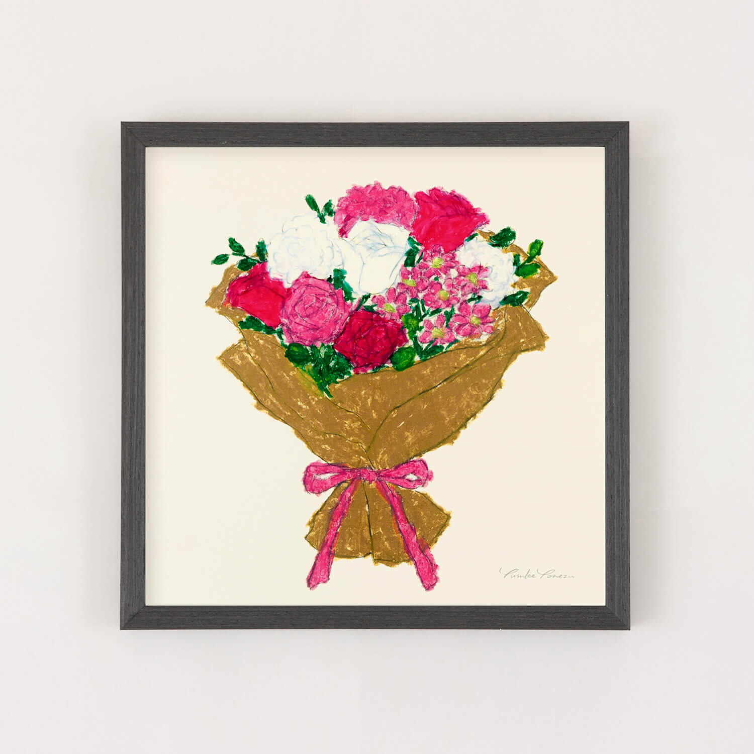 さまざまなピンクの花々が咲きほこる、華やかで上品なブーケ。赤や白のバラを中心にあしらい、全体にあたたかな彩りを添えています。バラの花言葉は「愛」「感謝」「幸せな家庭」。米津祐介さんのやさしい筆づかいが、心のこもった想いをそっと伝えてくれる一枚です。