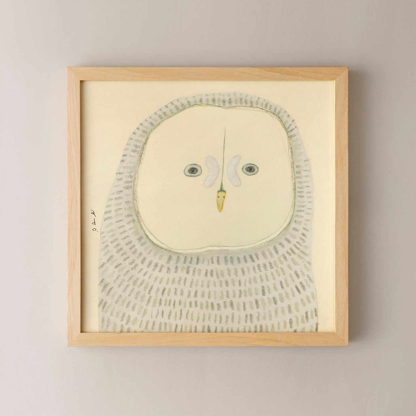 「カラフトフクロウ」がモデル。adoこと渡辺真希子さんが和紙にオイルパステル、色鉛筆、鉛筆などで描く生きものたちは、落ち着いた佇まいが特徴。まるで心で話しかけるみたいに、じっとこちらを見つめる目に、思わず引き込まれてしまいそうになります。