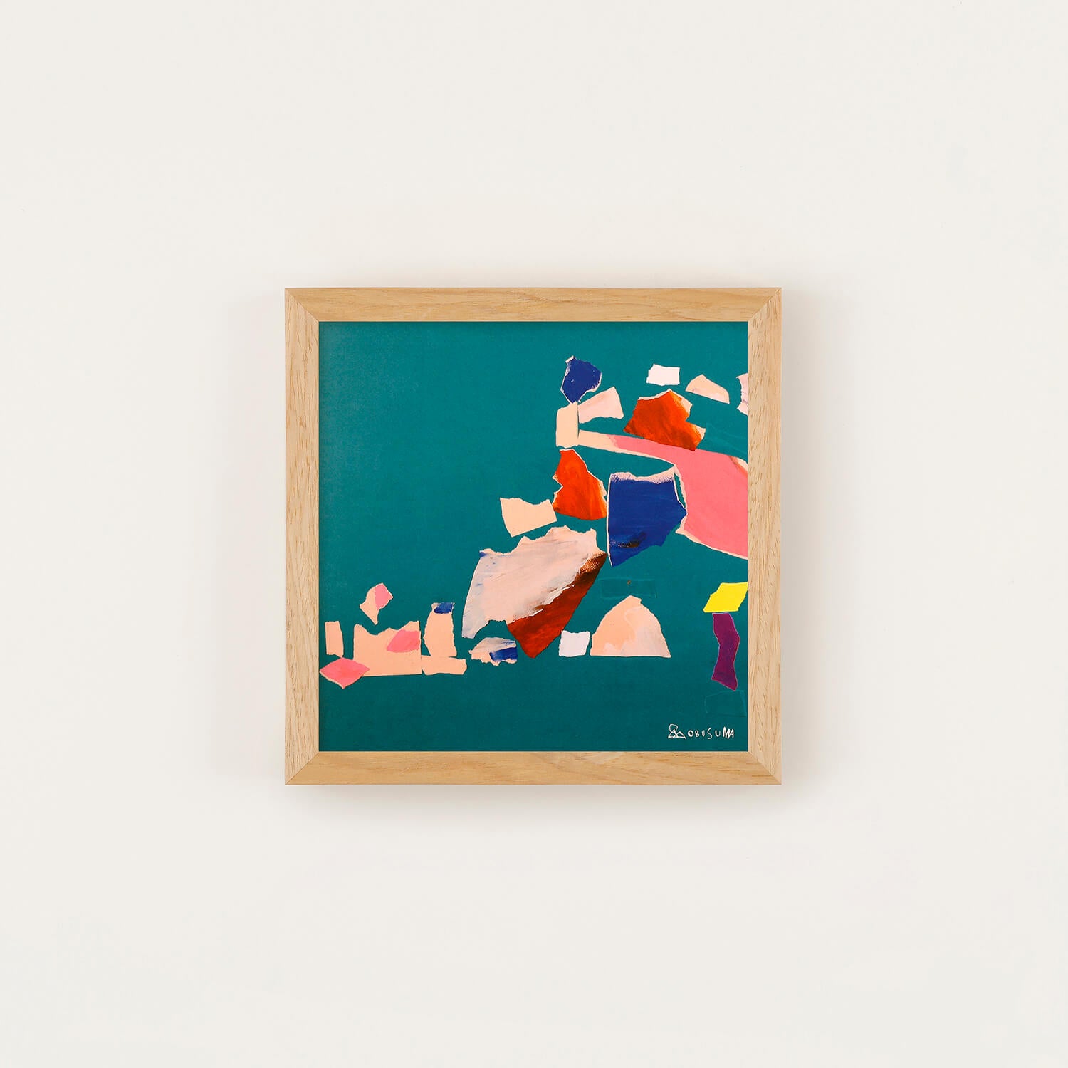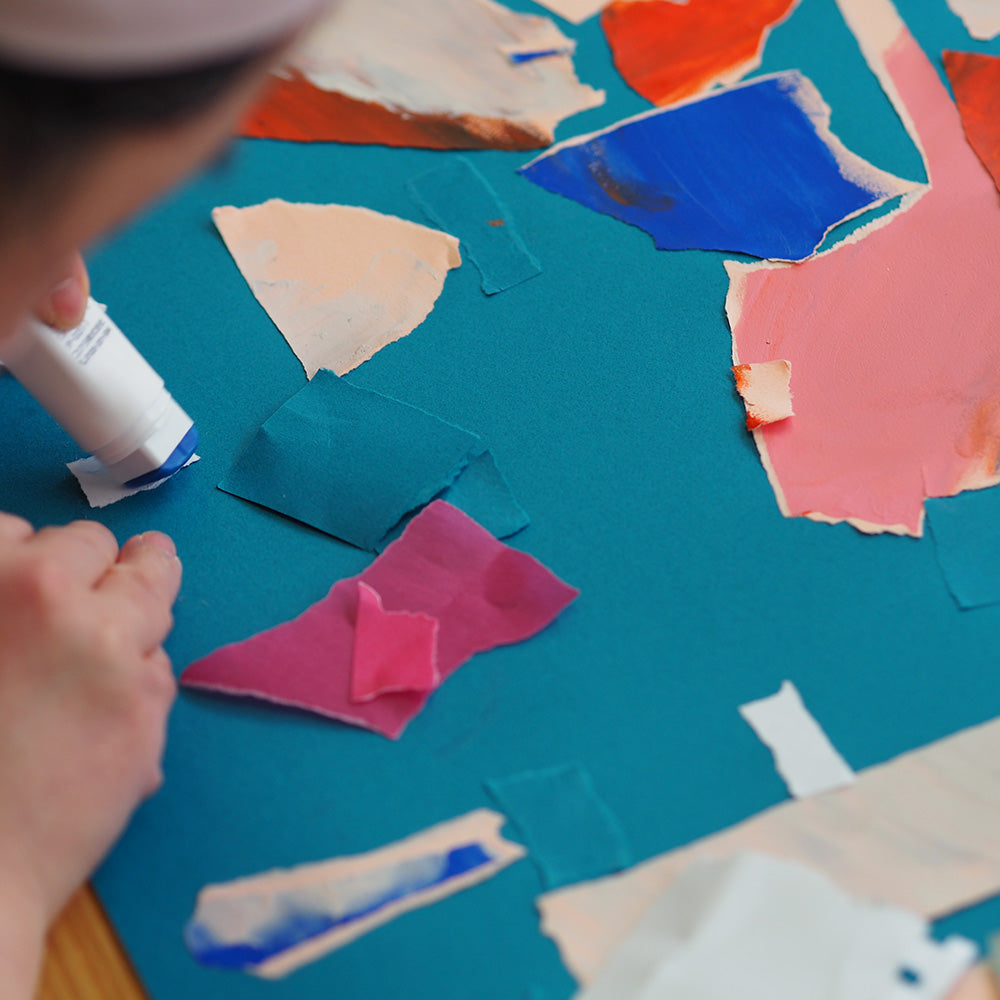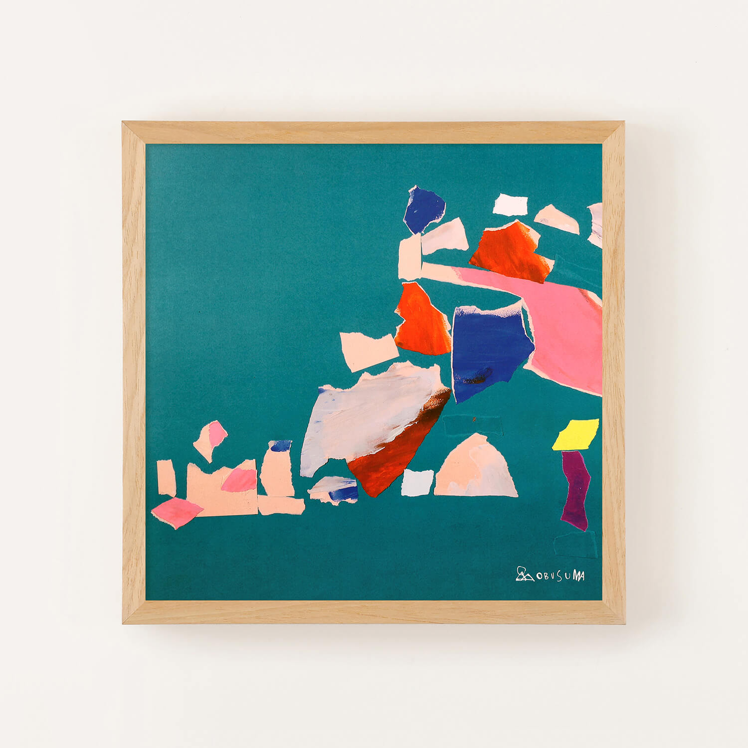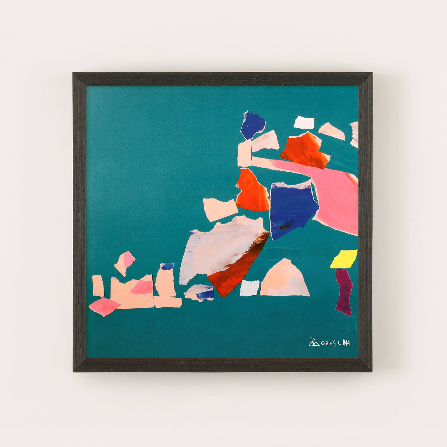 手や筆、木製品づくりの過程で出る端材を使って描いた色鮮やかな絵をさまざまな形に裂き、色台紙の上に思いのままに貼り付けたちぎり絵。河東梨香さんのディレクションにより、OBUSUMA(おぶすま)メンバーである作者たちの、既成概念にとらわれない多様な感性と感覚で制作された作品です。