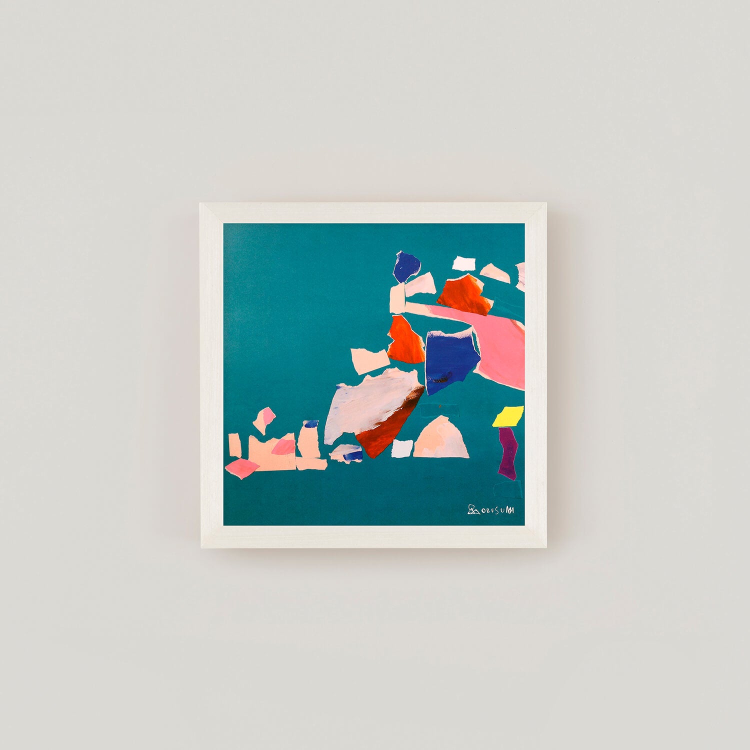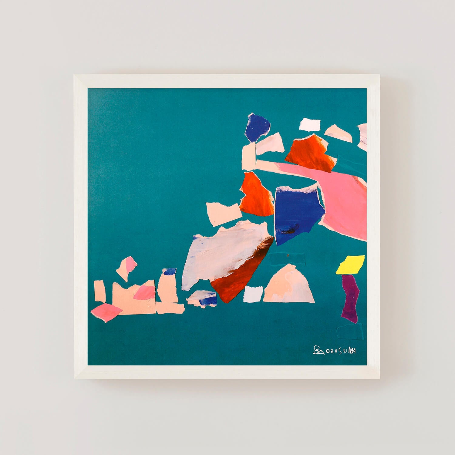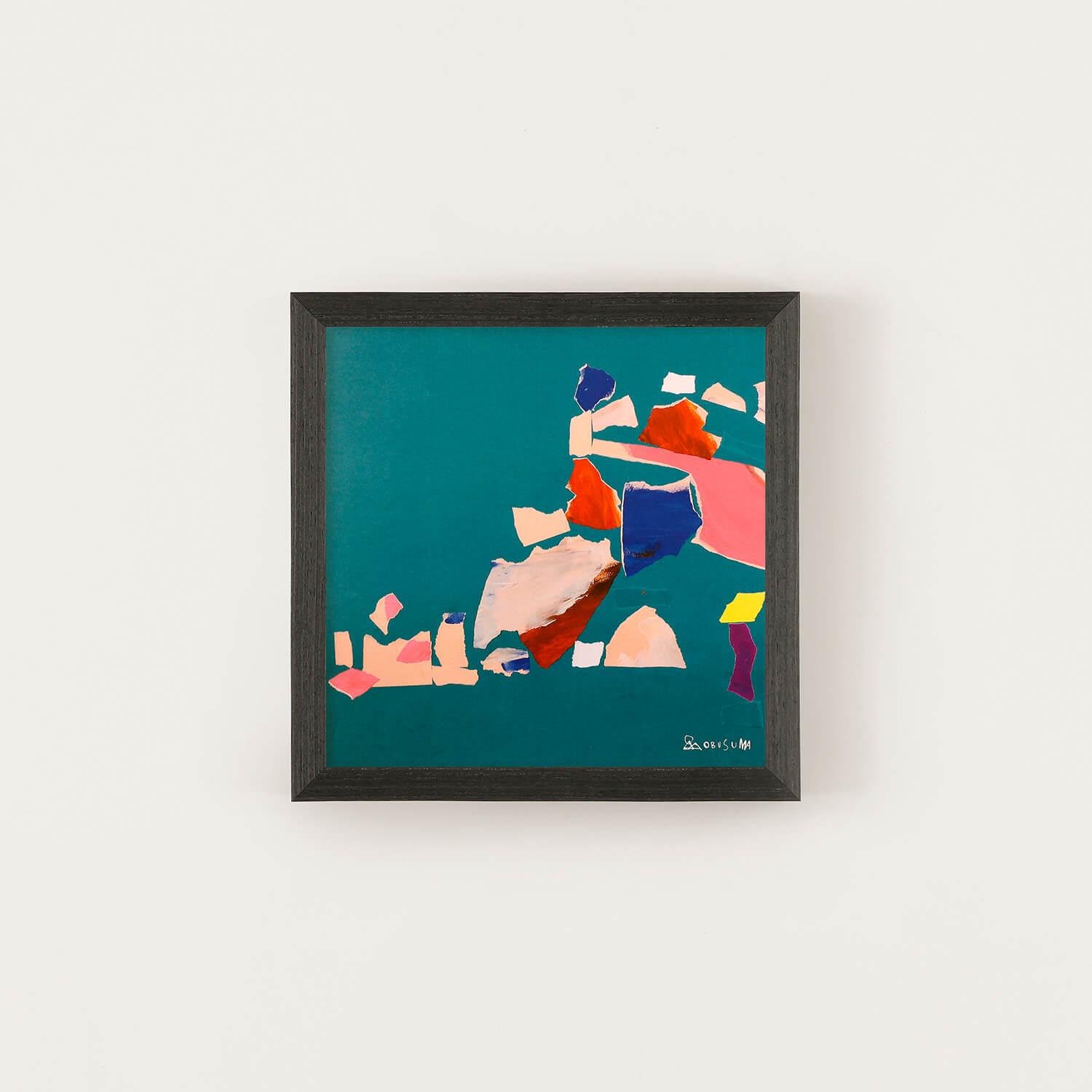 手や筆、木製品づくりの過程で出る端材を使って描いた色鮮やかな絵をさまざまな形に裂き、色台紙の上に思いのままに貼り付けたちぎり絵。河東梨香さんのディレクションにより、OBUSUMA(おぶすま)メンバーである作者たちの、既成概念にとらわれない多様な感性と感覚で制作された作品です。
