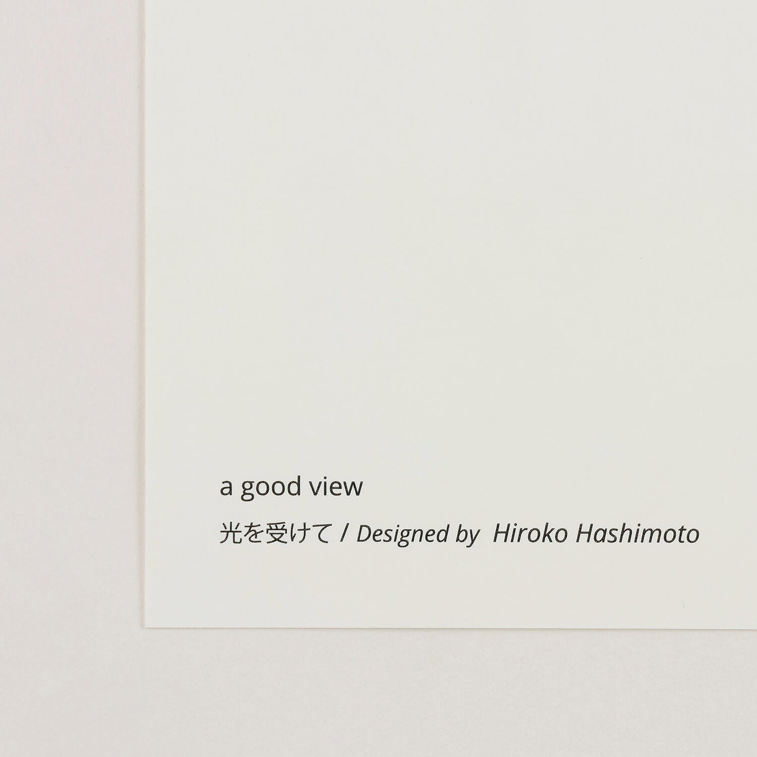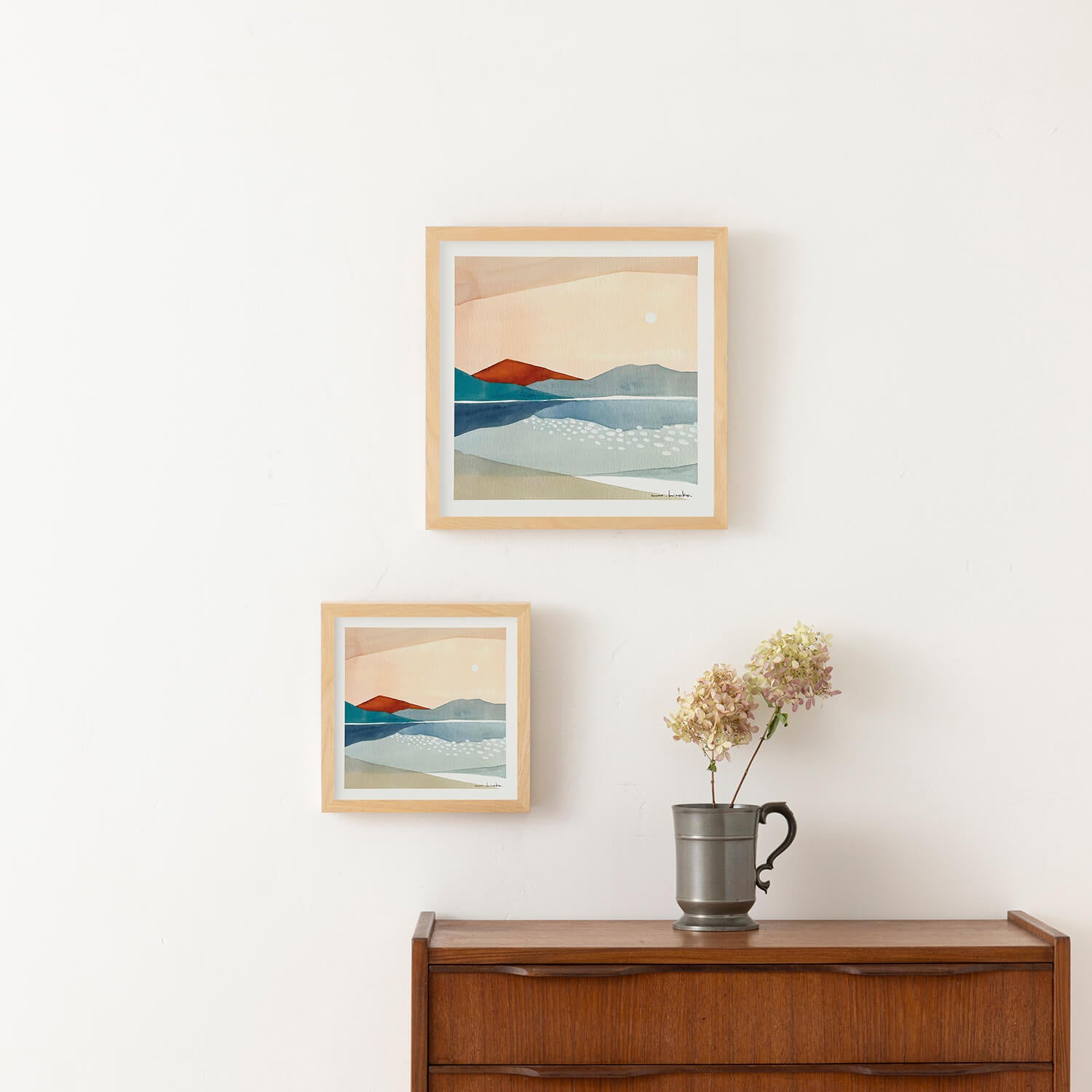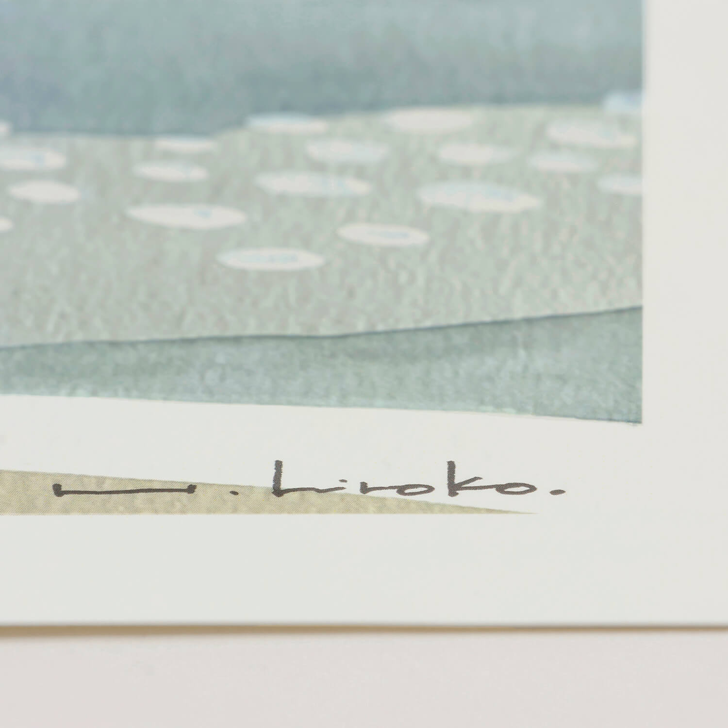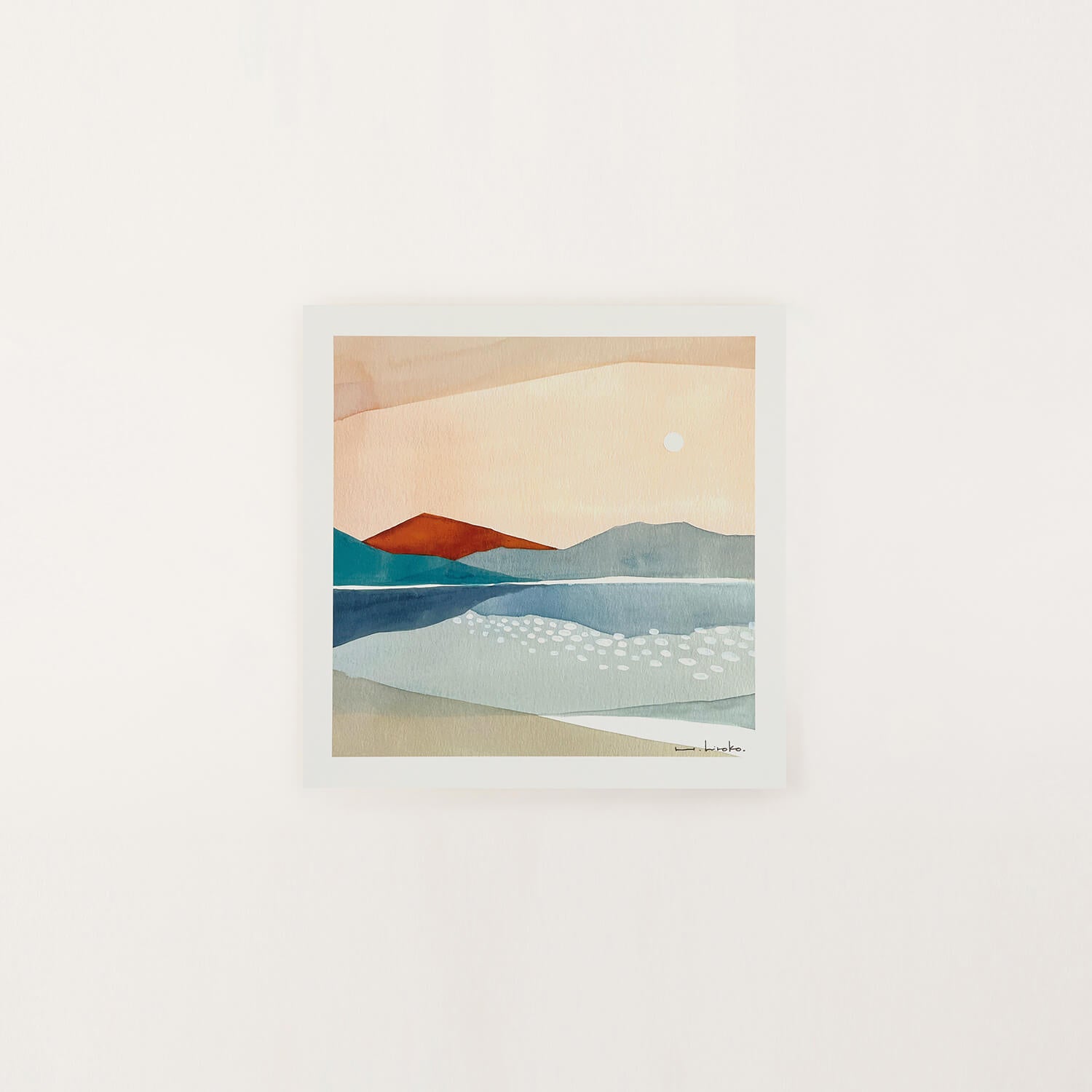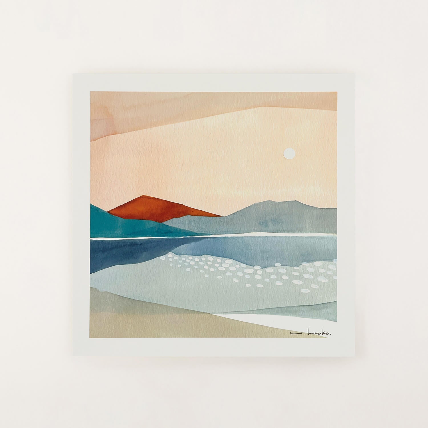 ゆるやかな稜線が重なり、広い水面が空を受け止めます。点のきらめきが、時間の流れをやさしく可視化しているようです。ハシモトヒロコさんの描写は、乾いた線で説明するのではなく、水の含みで境目をほどかせて空気の層をつくるのが印象的。遠景は色面を重ねて輪郭をわずかにずらし、手前の水面は淡い面がゆるく移ろいながら、点描のタッチが光の粒として浮かびます。部屋に穏やかな奥行きをつくる一枚です。