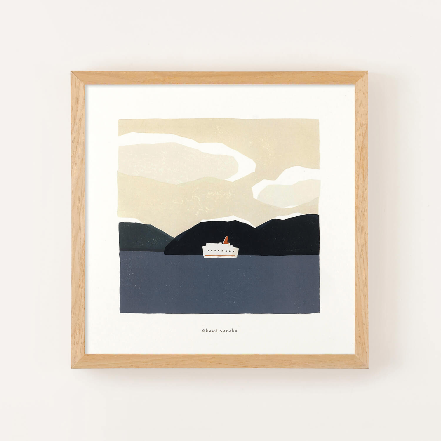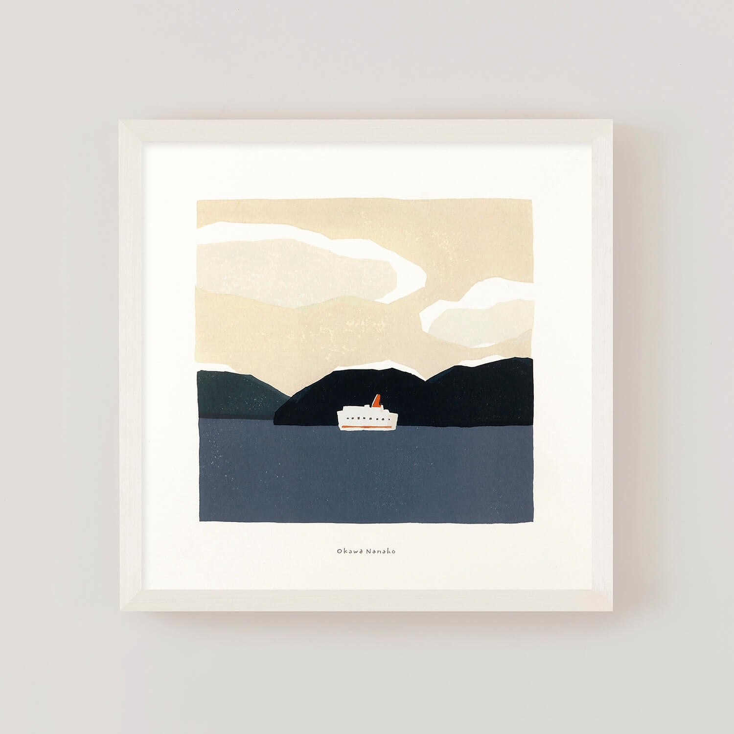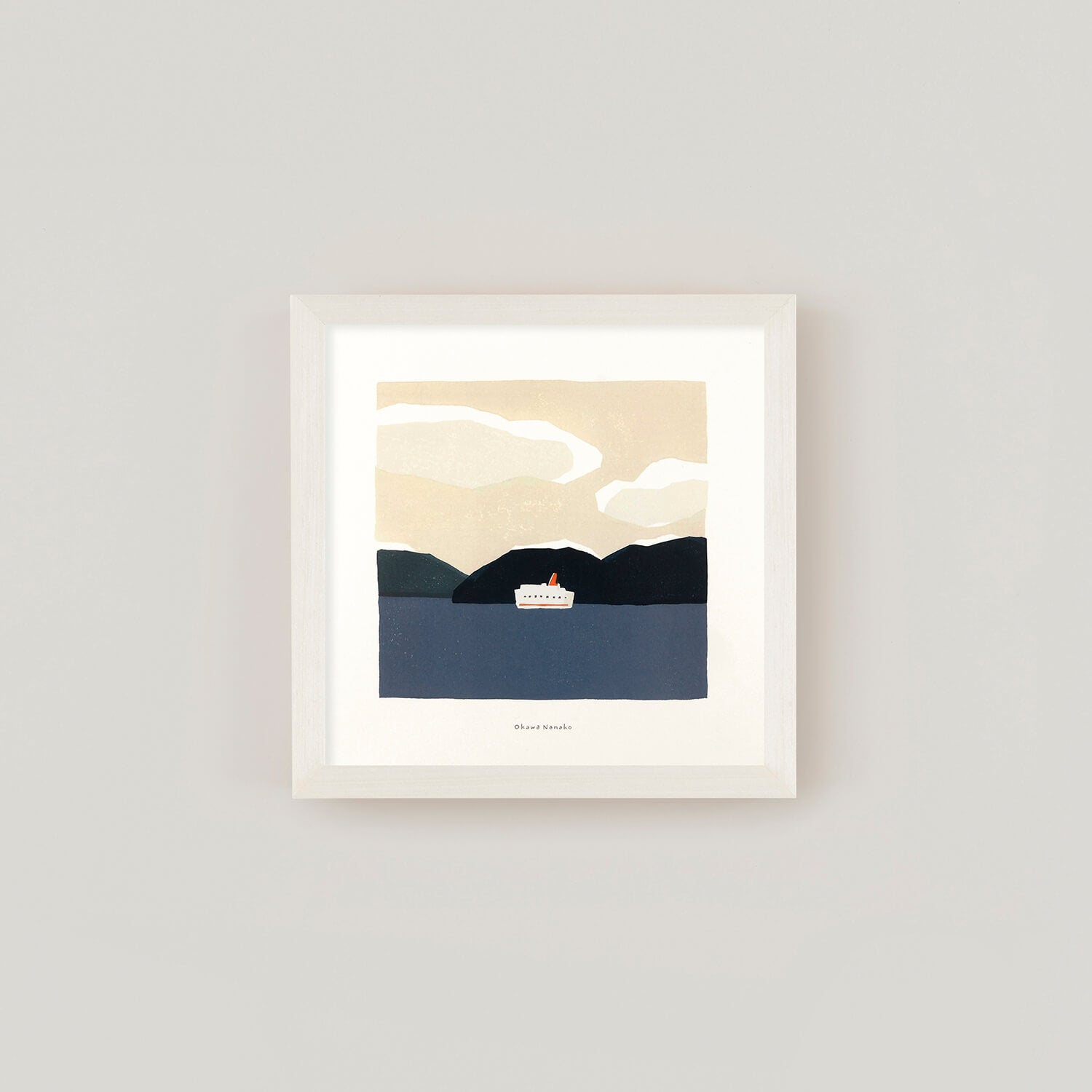 縹色の海を渡る遊覧船はどこに向かうのでしょう。お昼時のゆったりとした時間の流れを感じる、大川菜々子さんの描き下ろし作品。皆さんの心の中にある風景と重ね合わせてご鑑賞ください。