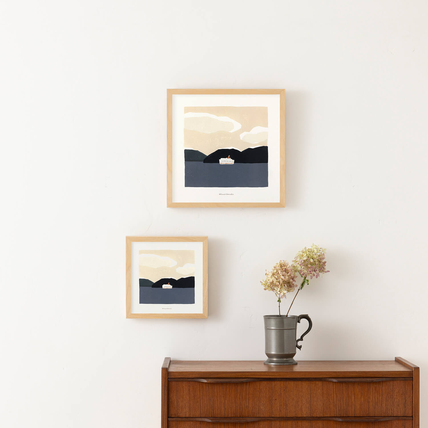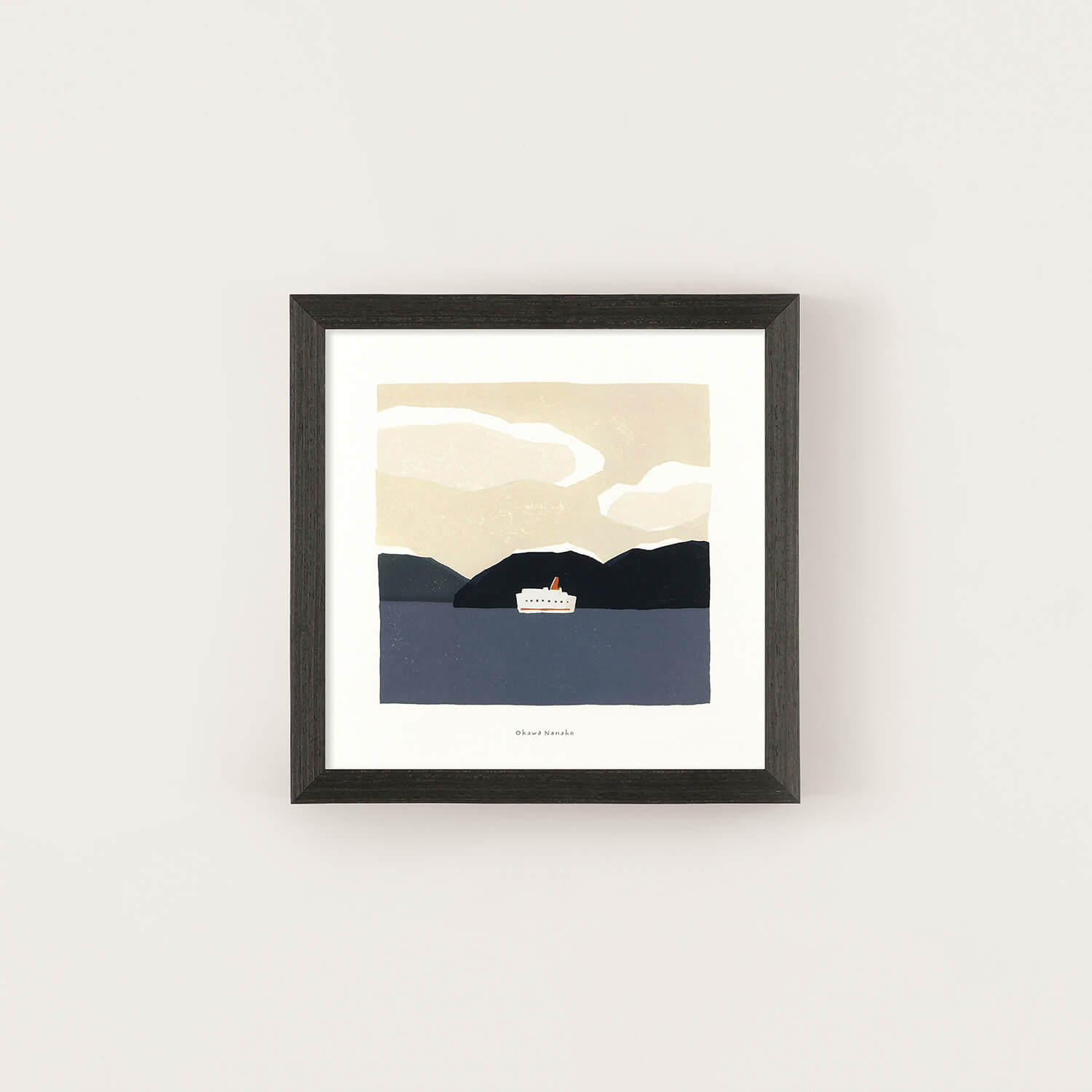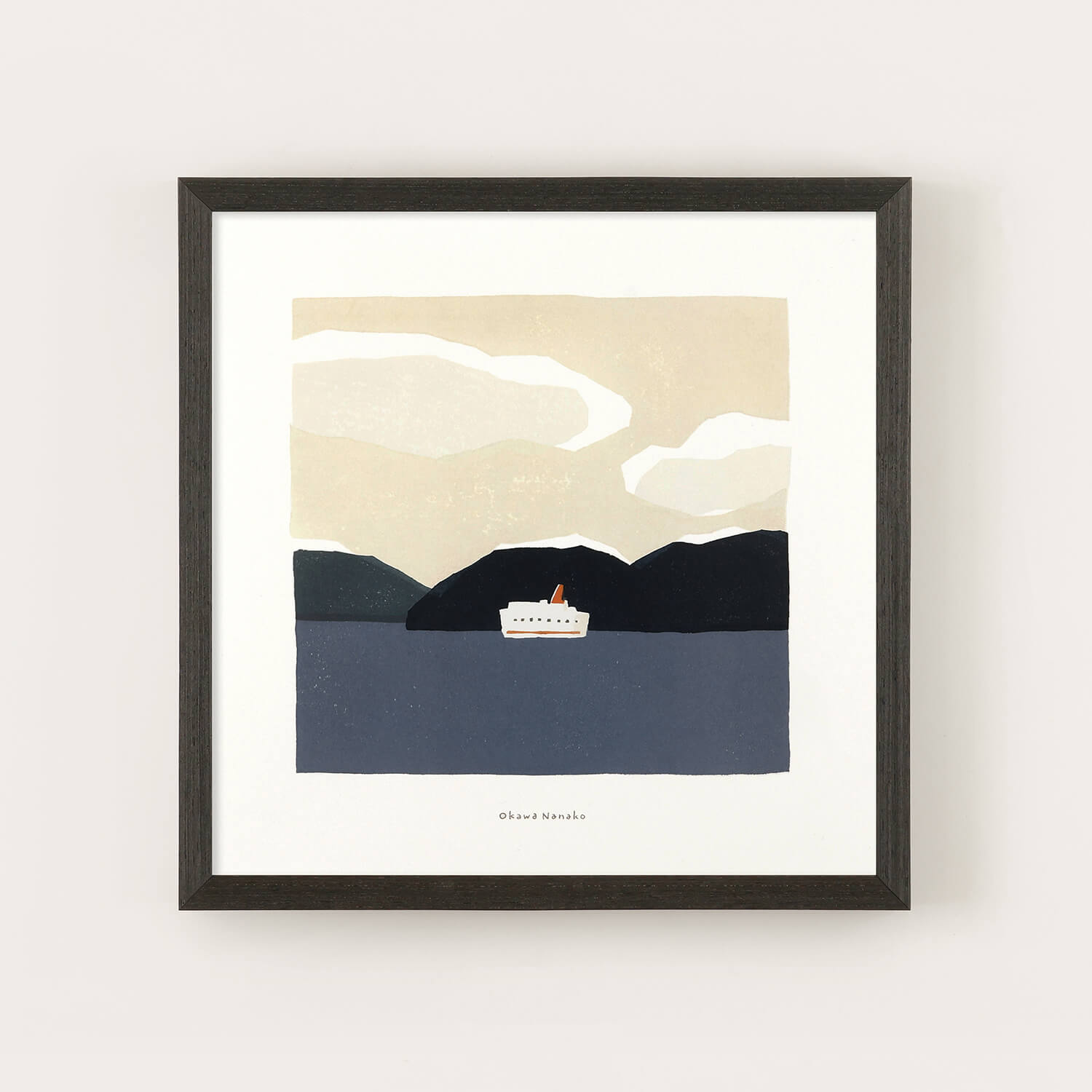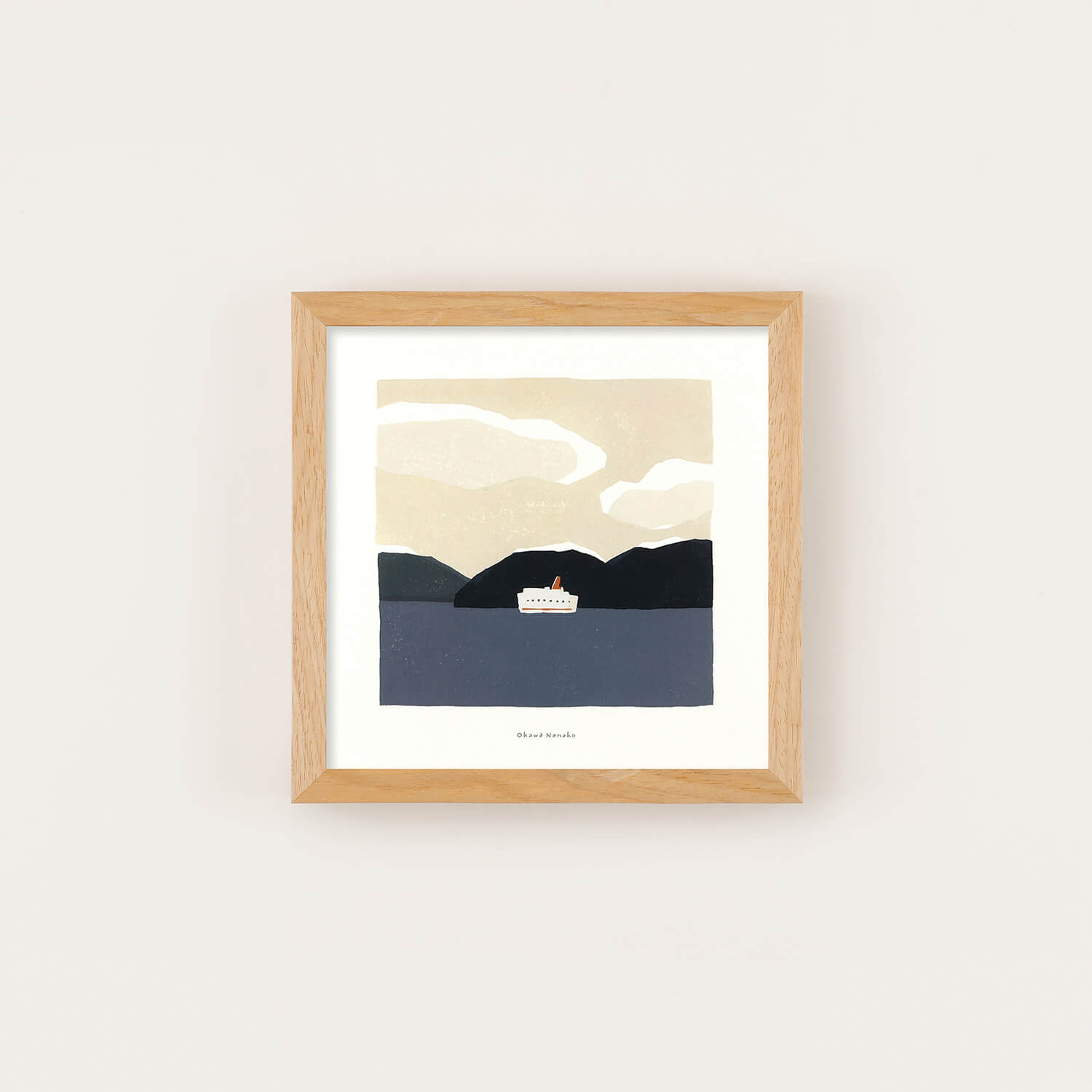縹色の海を渡る遊覧船はどこに向かうのでしょう。お昼時のゆったりとした時間の流れを感じる、大川菜々子さんの描き下ろし作品。皆さんの心の中にある風景と重ね合わせてご鑑賞ください。