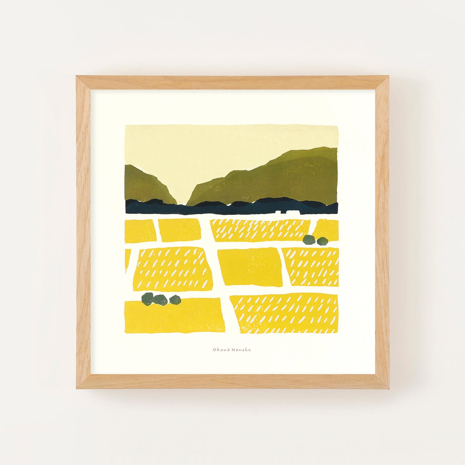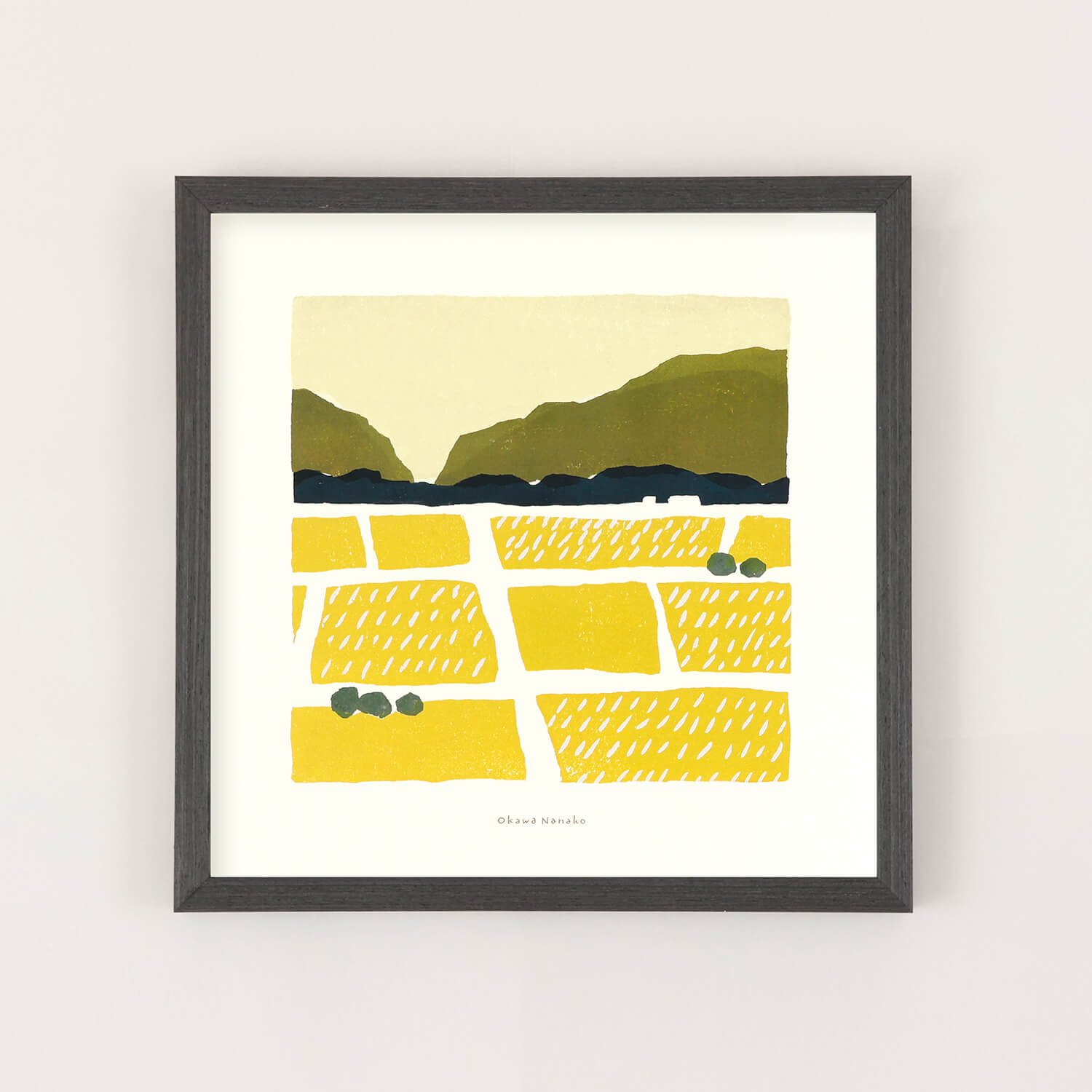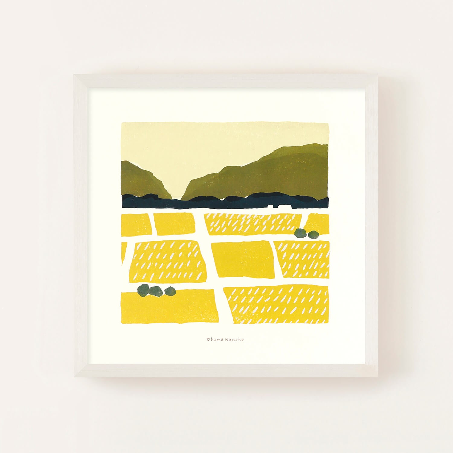 区画ごとにリズムよく並ぶ田畑と、遠くに連なる山並み。単純化された形と素朴な色合いが、土地の穏やかな時間を伝えます。大川菜々子さんの、日常に静かに寄り添う視線が感じられる作品です。