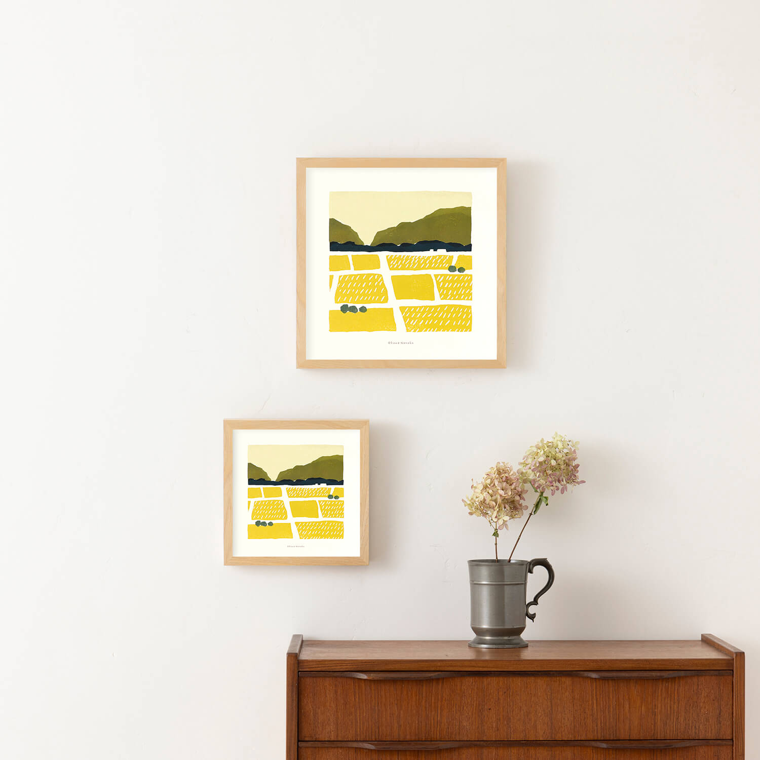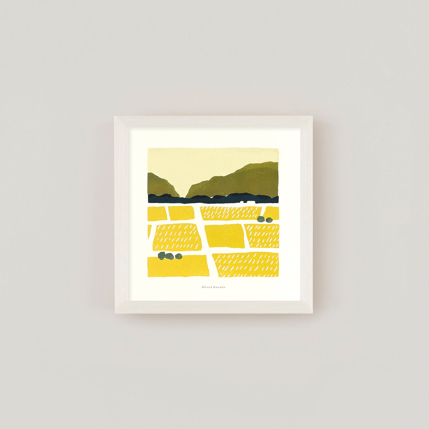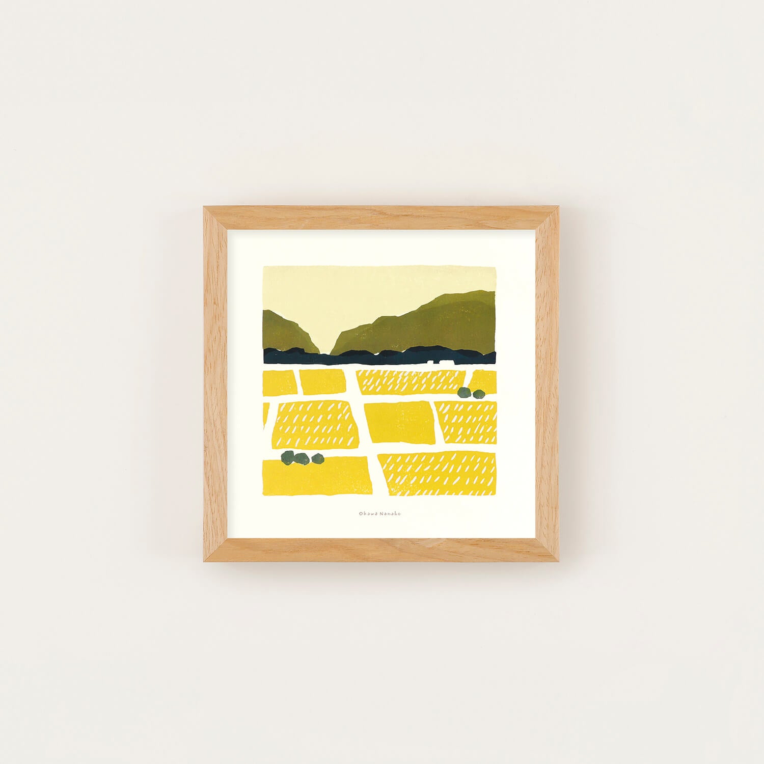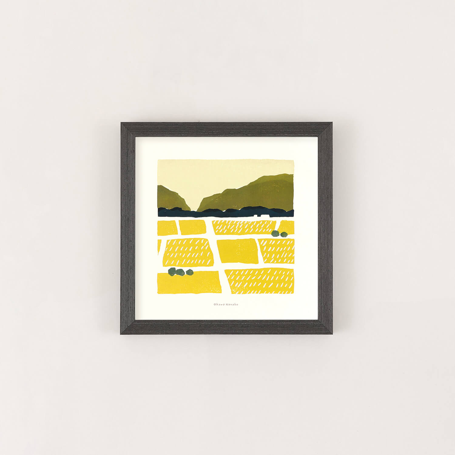 区画ごとにリズムよく並ぶ田畑と、遠くに連なる山並み。単純化された形と素朴な色合いが、土地の穏やかな時間を伝えます。大川菜々子さんの、日常に静かに寄り添う視線が感じられる作品です。