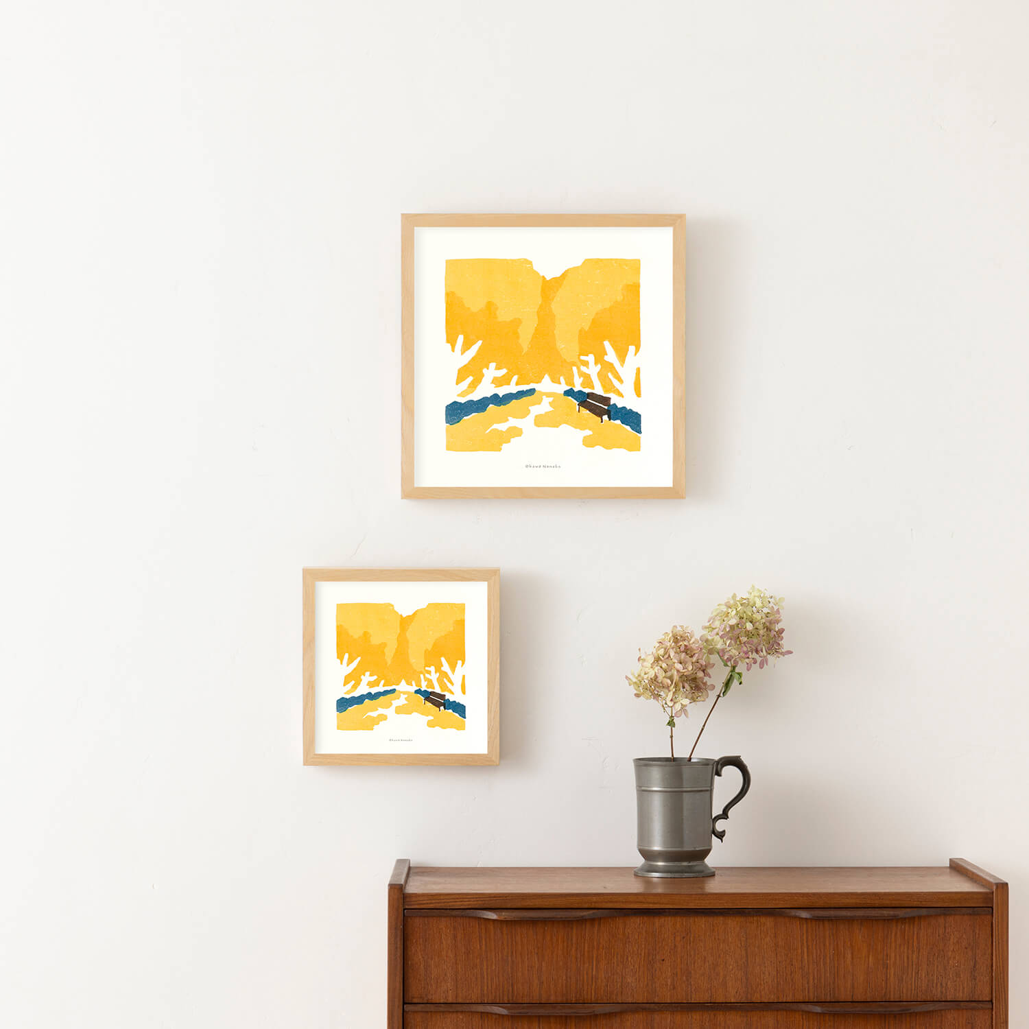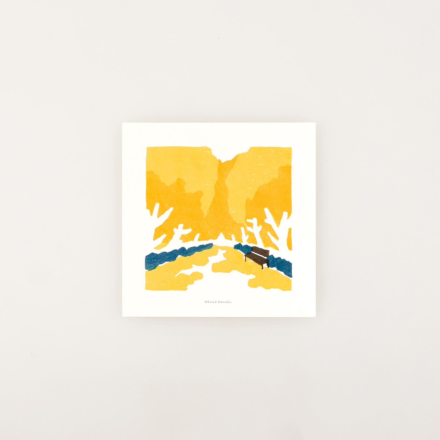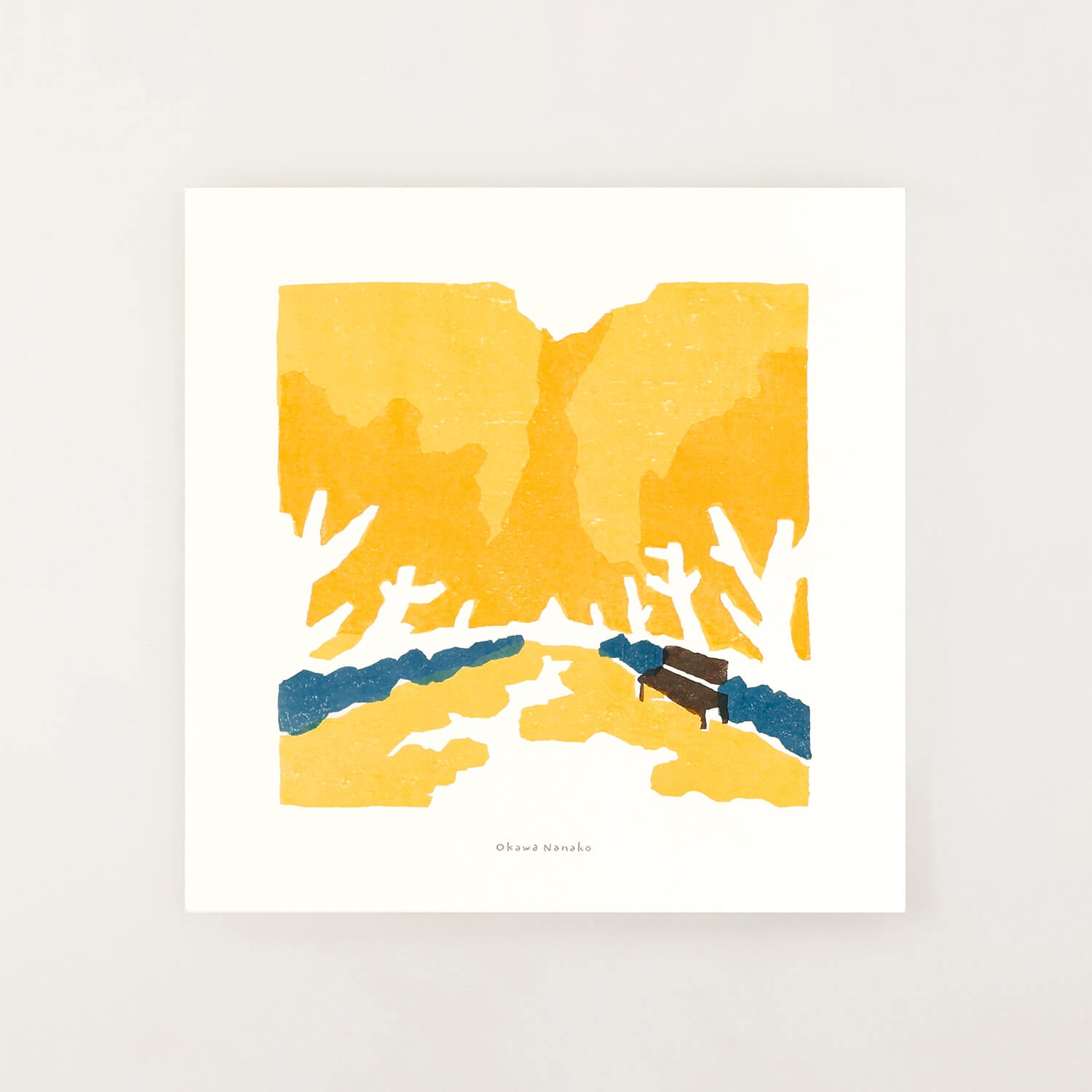 やわらかな黄色に包まれた並木道と、ぽつんと置かれたベンチ。人の気配を残しながら、静けさがゆっくりと広がります。大川菜々子さんの、記憶や季節の感触にそっと触れるような風景表現が魅力です。
