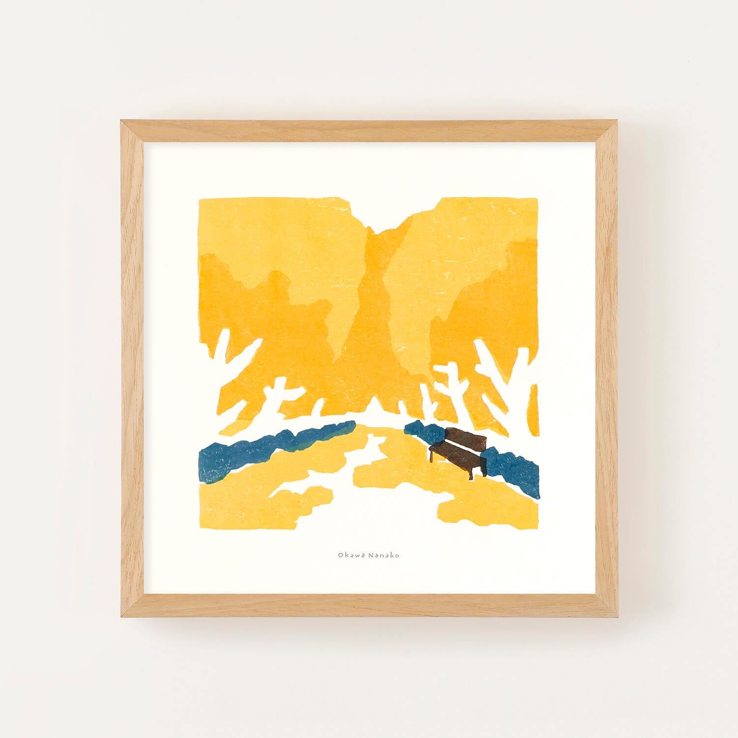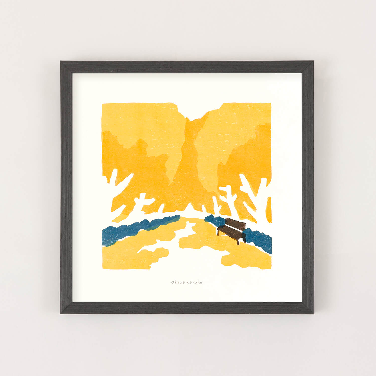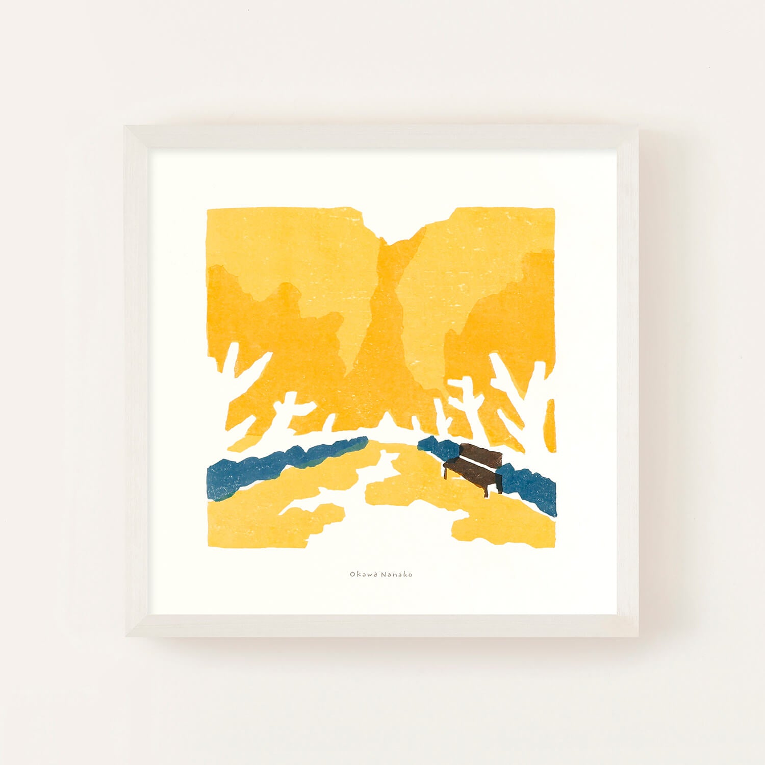 やわらかな黄色に包まれた並木道と、ぽつんと置かれたベンチ。人の気配を残しながら、静けさがゆっくりと広がります。大川菜々子さんの、記憶や季節の感触にそっと触れるような風景表現が魅力です。
