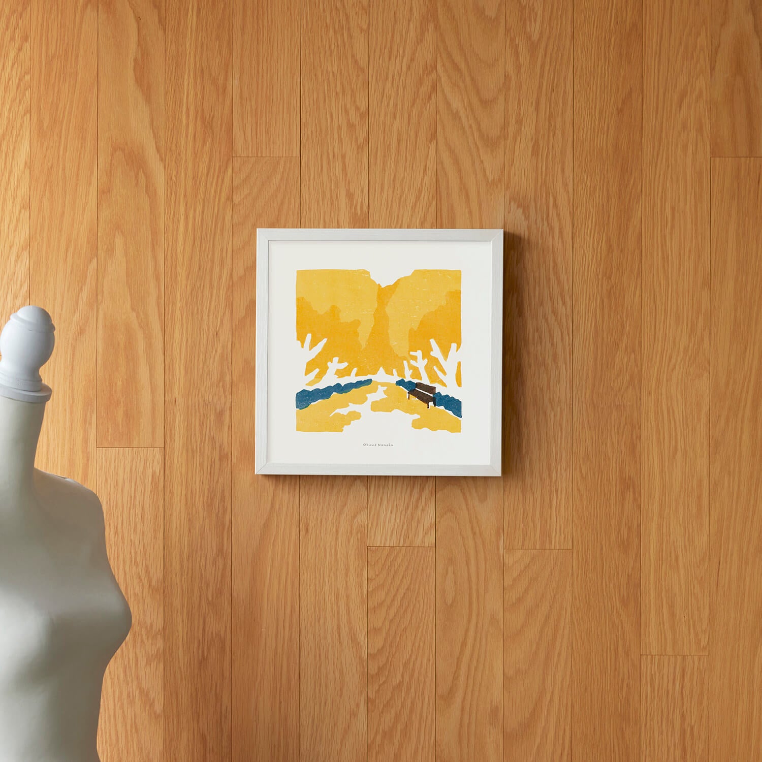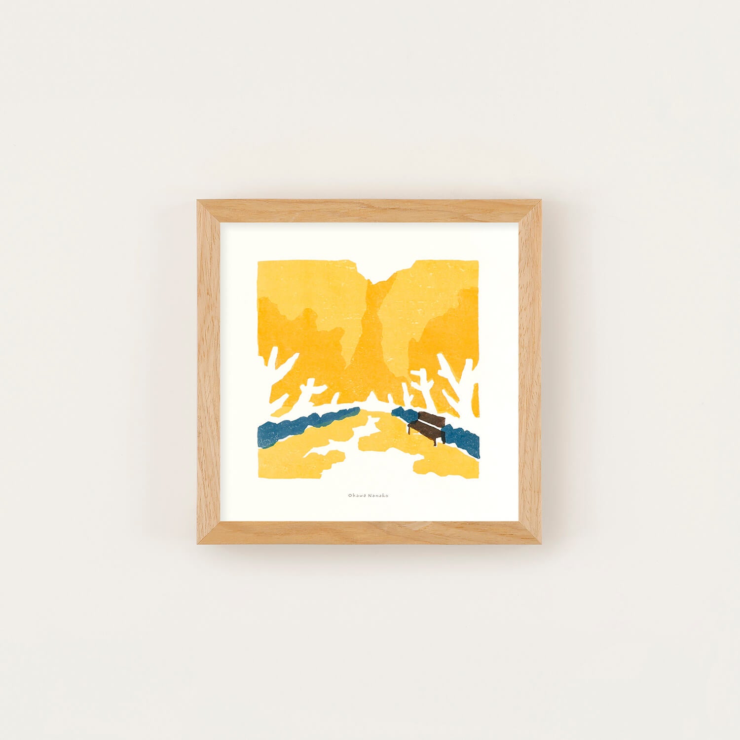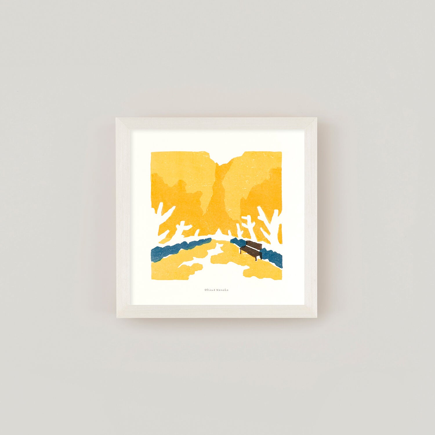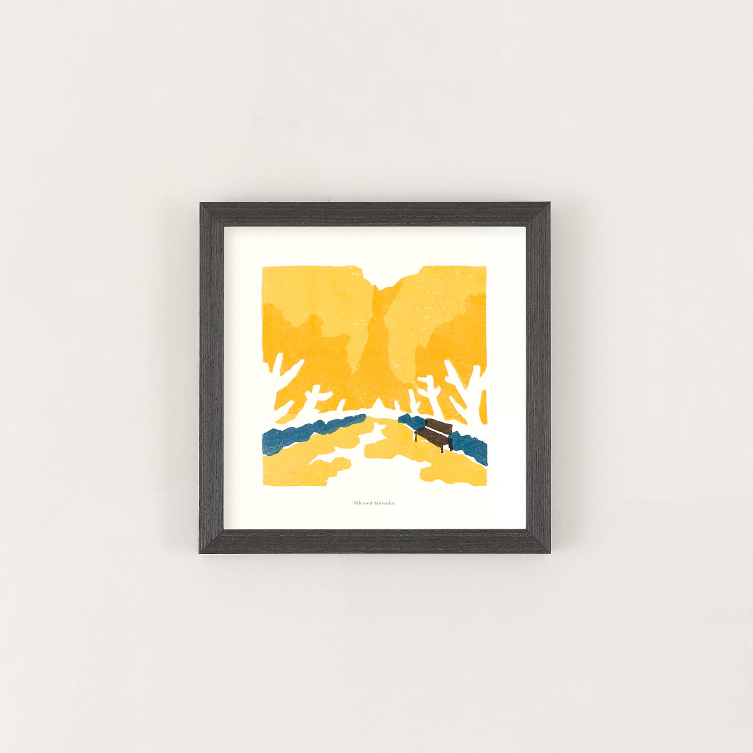 やわらかな黄色に包まれた並木道と、ぽつんと置かれたベンチ。人の気配を残しながら、静けさがゆっくりと広がります。大川菜々子さんの、記憶や季節の感触にそっと触れるような風景表現が魅力です。